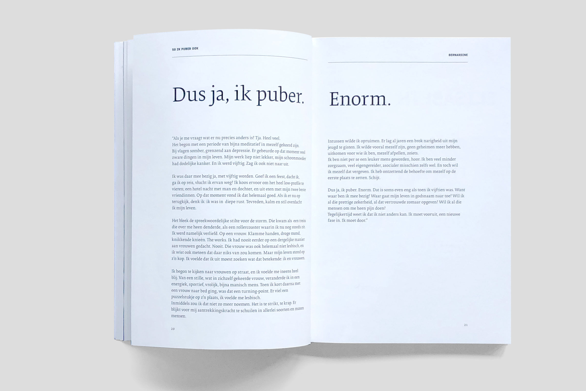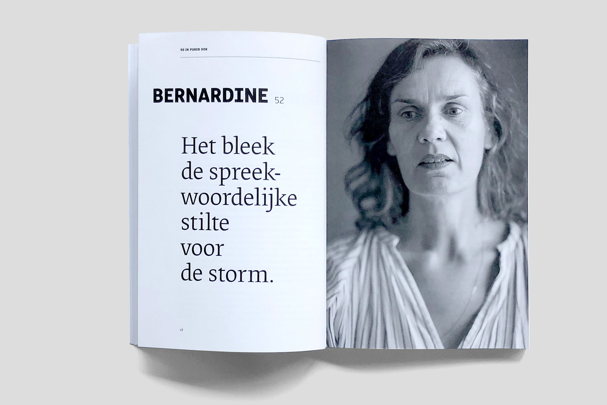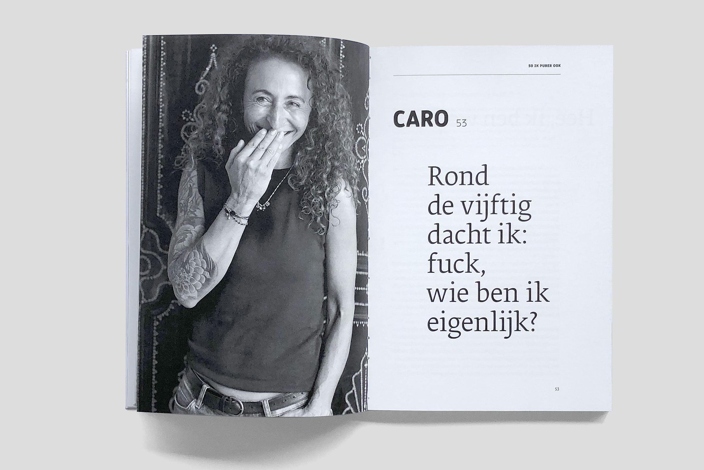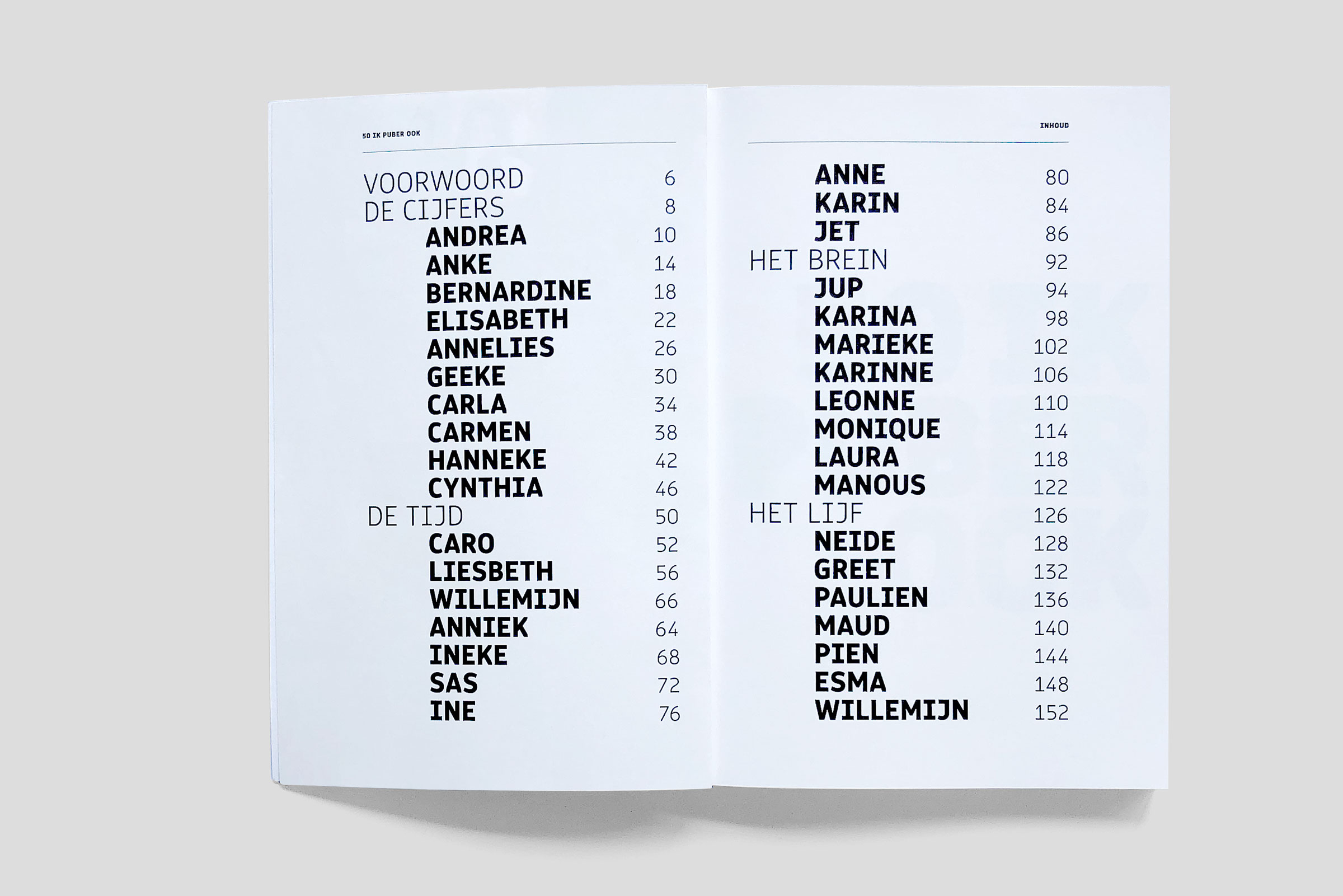 50 Ik puber ook (“50 I reach puberty, too”) is about a turbulent phase of life for women. This becomes clear in the thirty-five portraits included in this book. Thirty-five photos and thirty-five stories. Thirty-five differences and some striking patterns. Four essays provide context.