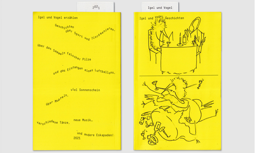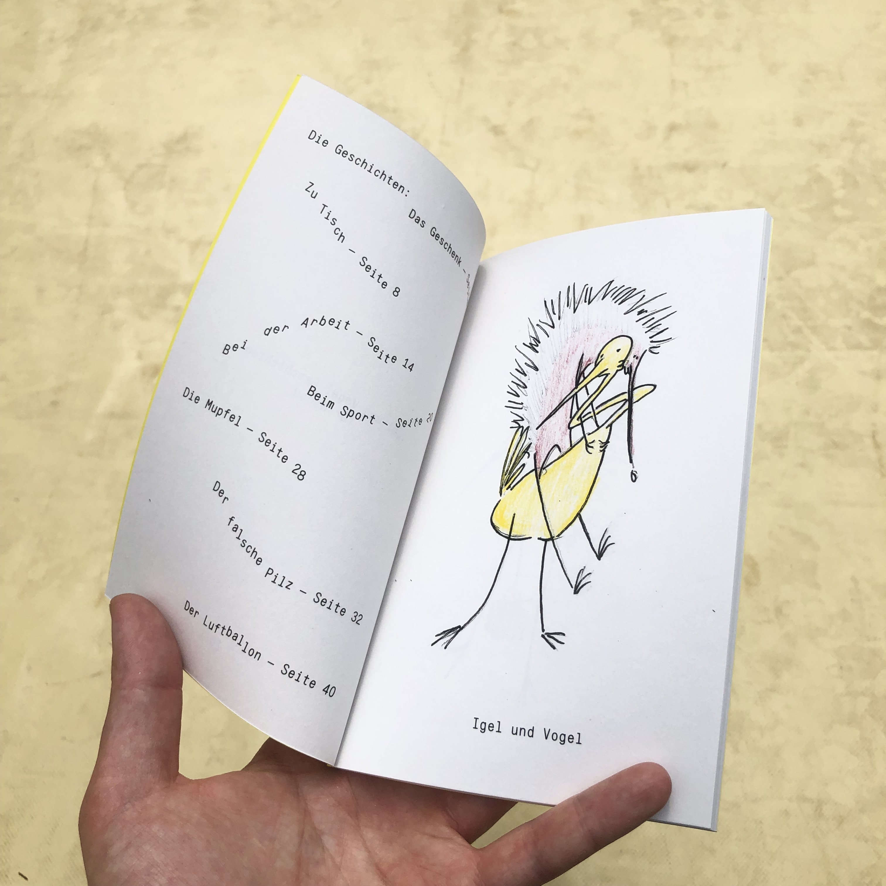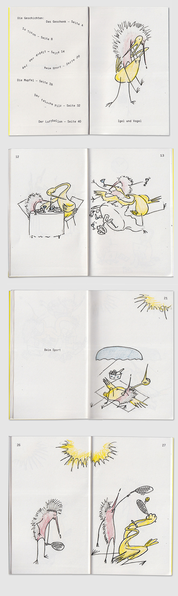 Igel und Vogel Geschichten is a collection of illustrated stories featuring a hedgehog and a bird humorously and exaggeratedly mimicking observed adult behavior in a number of everyday situations. Proving that most of the times the path is the goal and we should not take things as seriously.