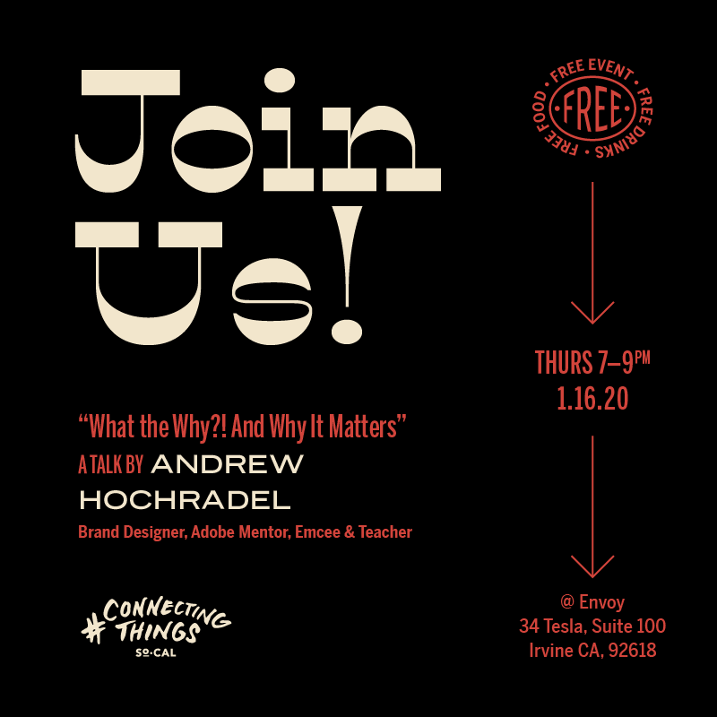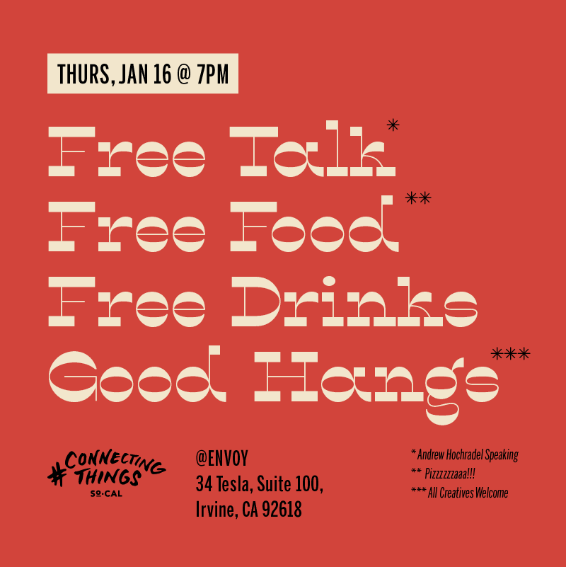 Event promos for Connecting Things, a monthly, free event for creatives, based in Orange County. This event featured a talk by Andrew Hochradel, plus free drinks, food, and good people. Header font is Lone Pine Regular by Hoodzpah and the supporting type is set in various weights and widths of Benton Sans by Font Bureau.