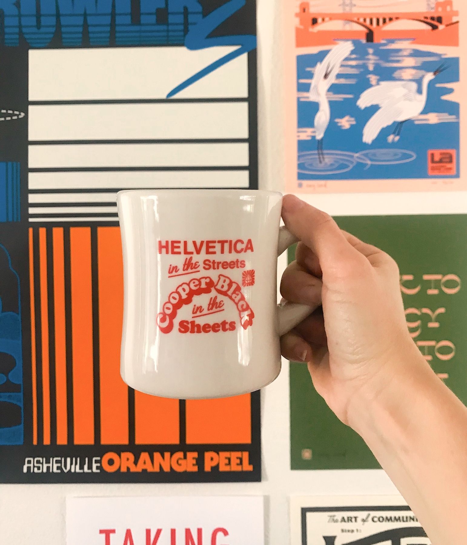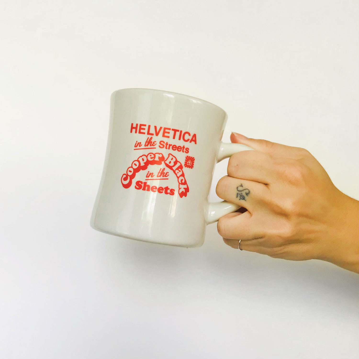 If you like font based humor this mug is for you. Presenting the “Helvetica in the Streets, Cooper Black in the Sheets” mug by Hoodzpah. These diner mugs are made of super sturdy ceramic (like, could double as a door stopper sturdy) and screenprinted with red ink in the US.