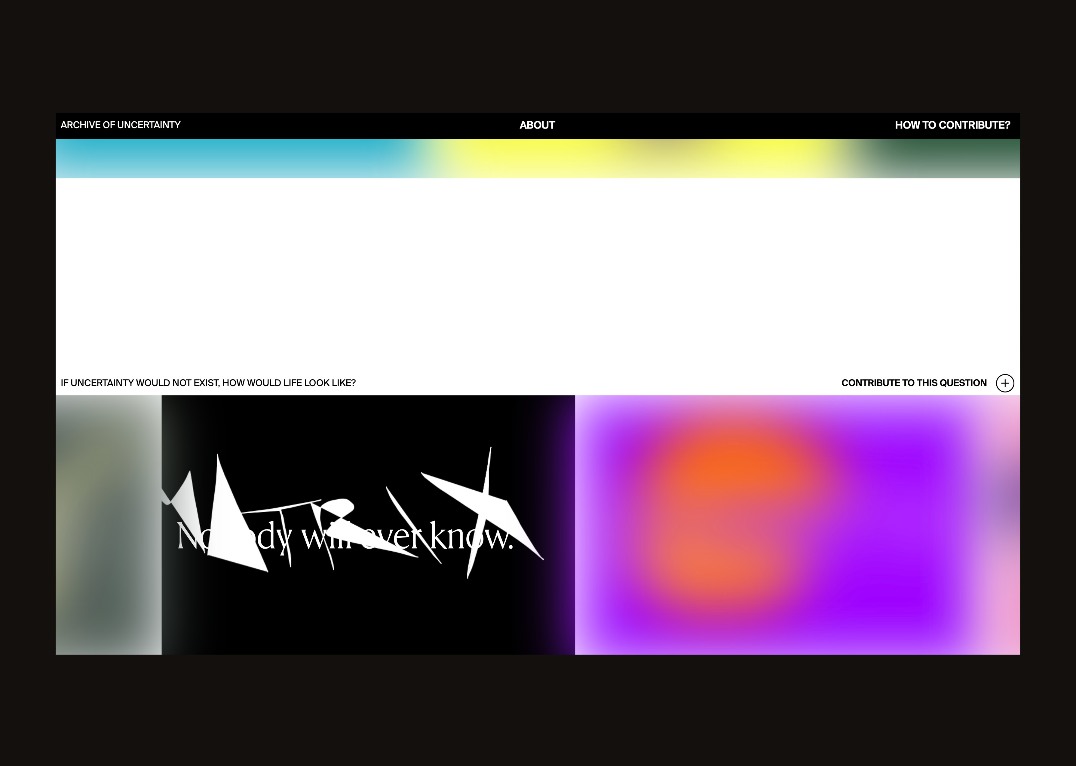 While most of the typographic elements – set in Suisse Int’l – take a conscious step back and leave all the space to the main focus of the site, the user posts itself gain their characteristics through a bold typographic choice: Rector. The aspect of uncertainty can also be found in the operation and handling of the website. The feature volatility occurs in the archive part of the page, through which the posts are reloaded with each appear in a different order. The blurry and vague component of uncertainty is reflected on a visual level. All contributions are shown blurred, except for the one post that is active. These properties are intended to visualize the possibilities and opportunities that uncertainty offers.