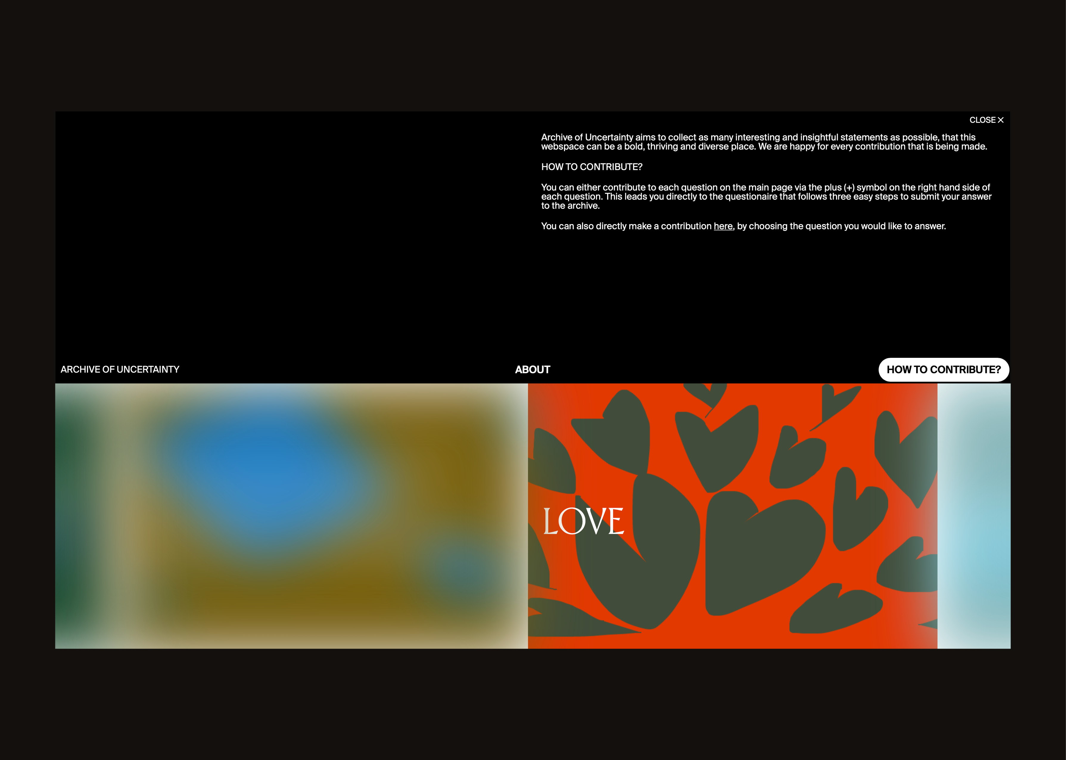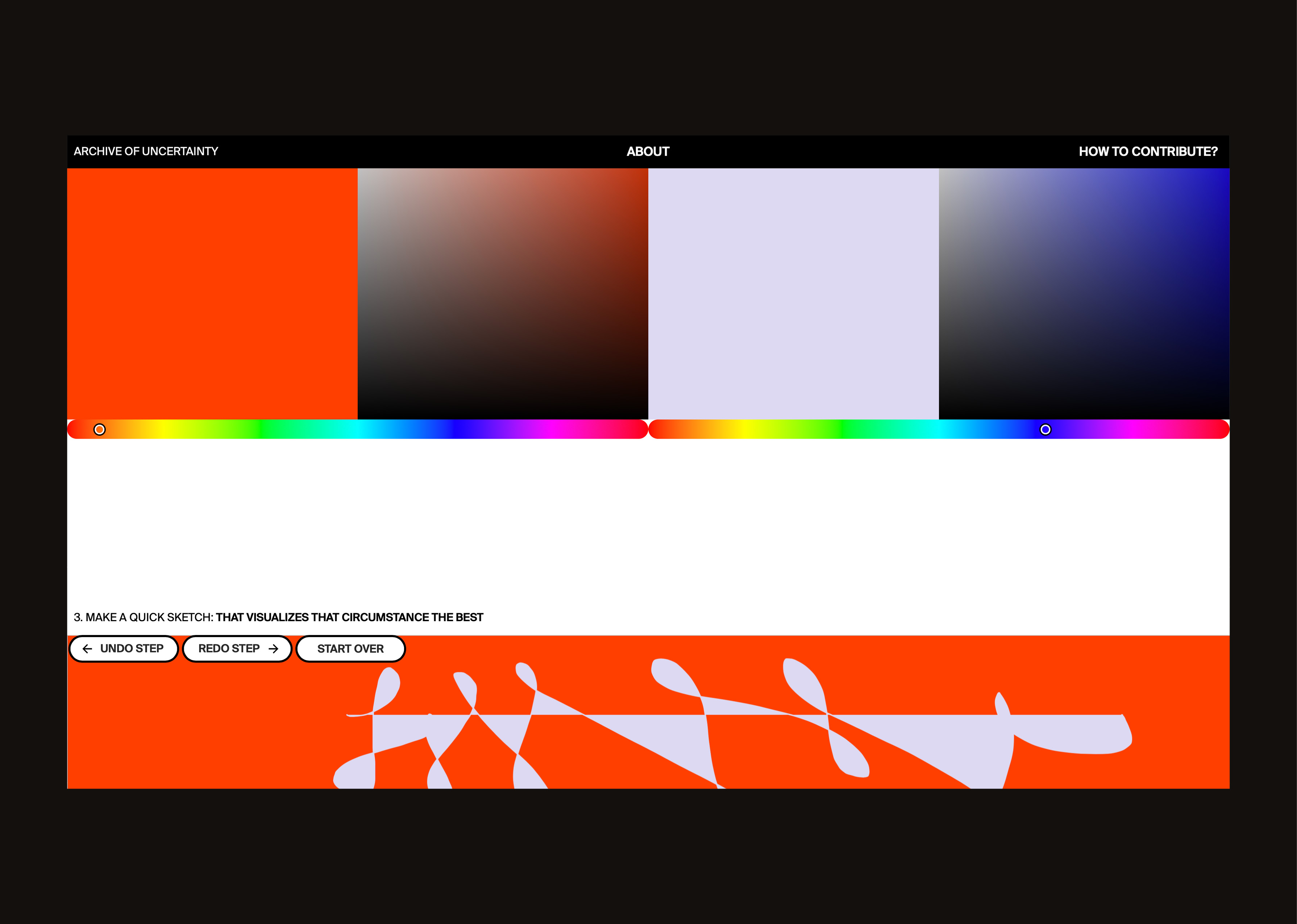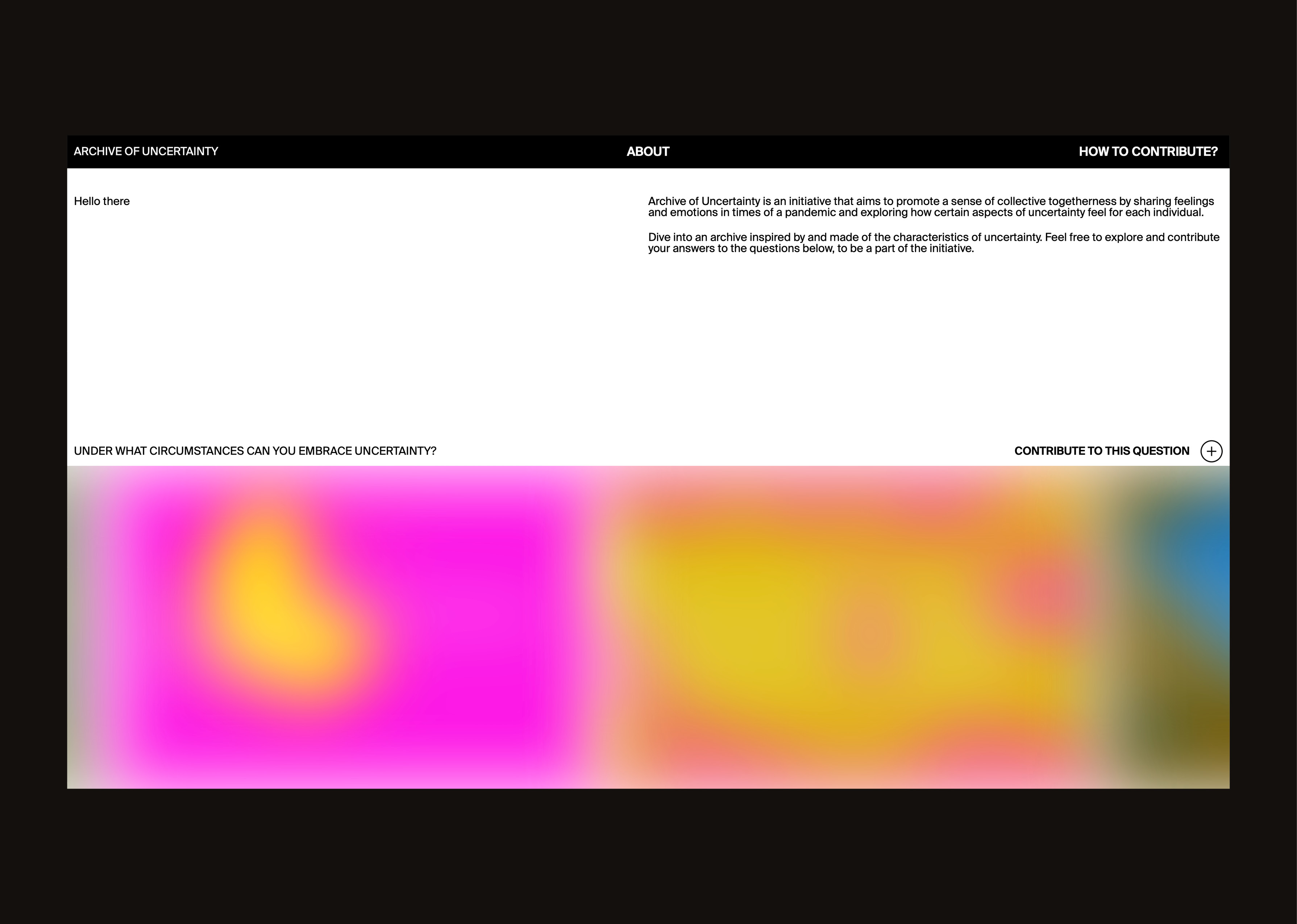 As an increasingly prominent feature of our existence, uncertainty accompanies us as a constant permanently. The initiative Archive of Uncertainty investigates based on a participatory web application how aspects of uncertainty feel for each individual. The term, with its predominantly negative connotations, can thus be viewed from a different perspective and draws attention to the transformative abilities of uncertainty. The elusive and vague characteristics of uncertainty are reflected in the handling of the website and at the same time summarize a collective mood of all user contributions in an archive.