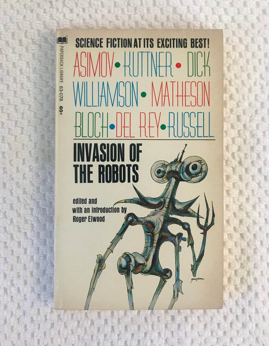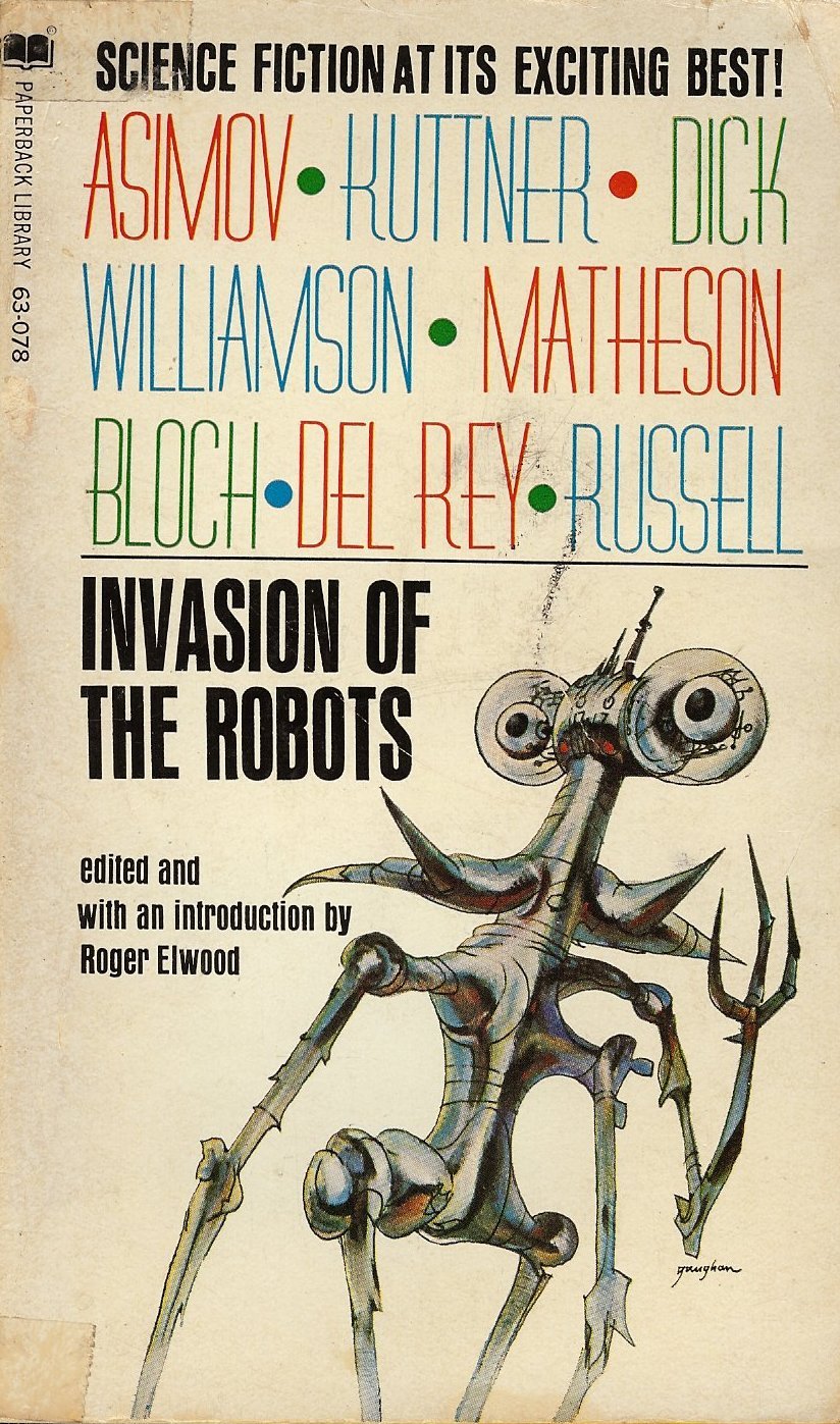 Huxley Vertical in alternating colors for the names of the eight authors whose short stories are included in Invasion of the Robots. The science fiction anthology was published by Paperback Library in 1969. Note the use of the two forms for K.