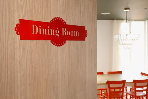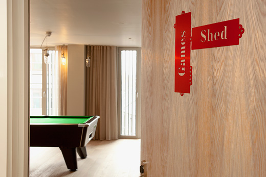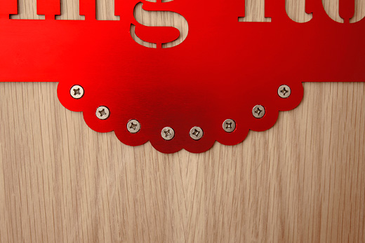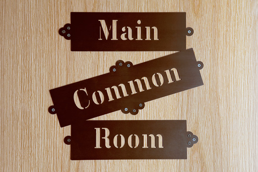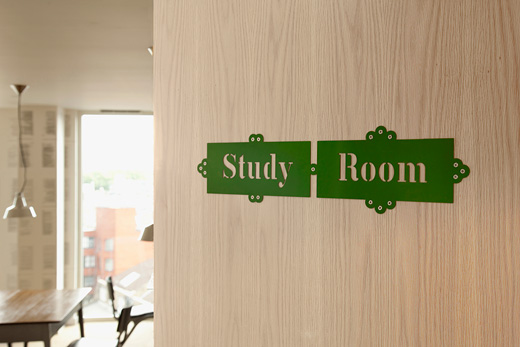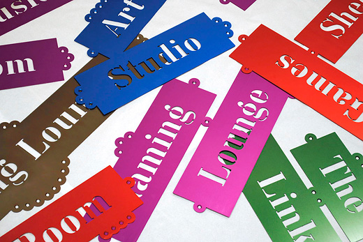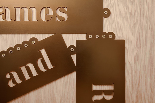 We designed all the common room signage for the IQ Student Accommodation in Shoreditch. The signs are made from anodized aluminum and combine influences from traditional pub signs and old-fashioned doilies with colours from Indian saris that can be seen in the shops around Brick Lane. When we first came to the building we noticed that all the existing door numbers use an unnecessary amount of screws, so we decided to use even more screws for our signs and incorporate this into the design.