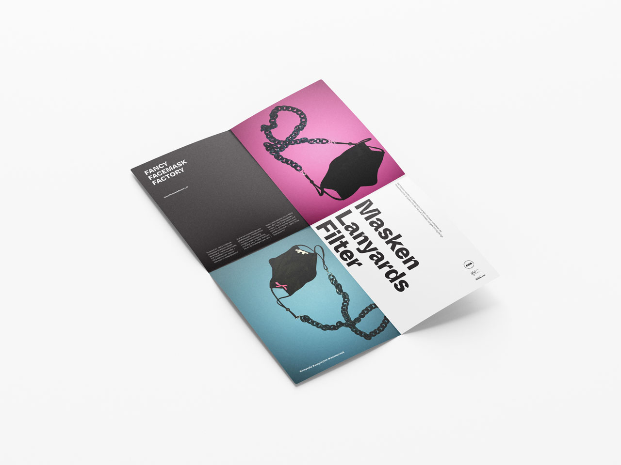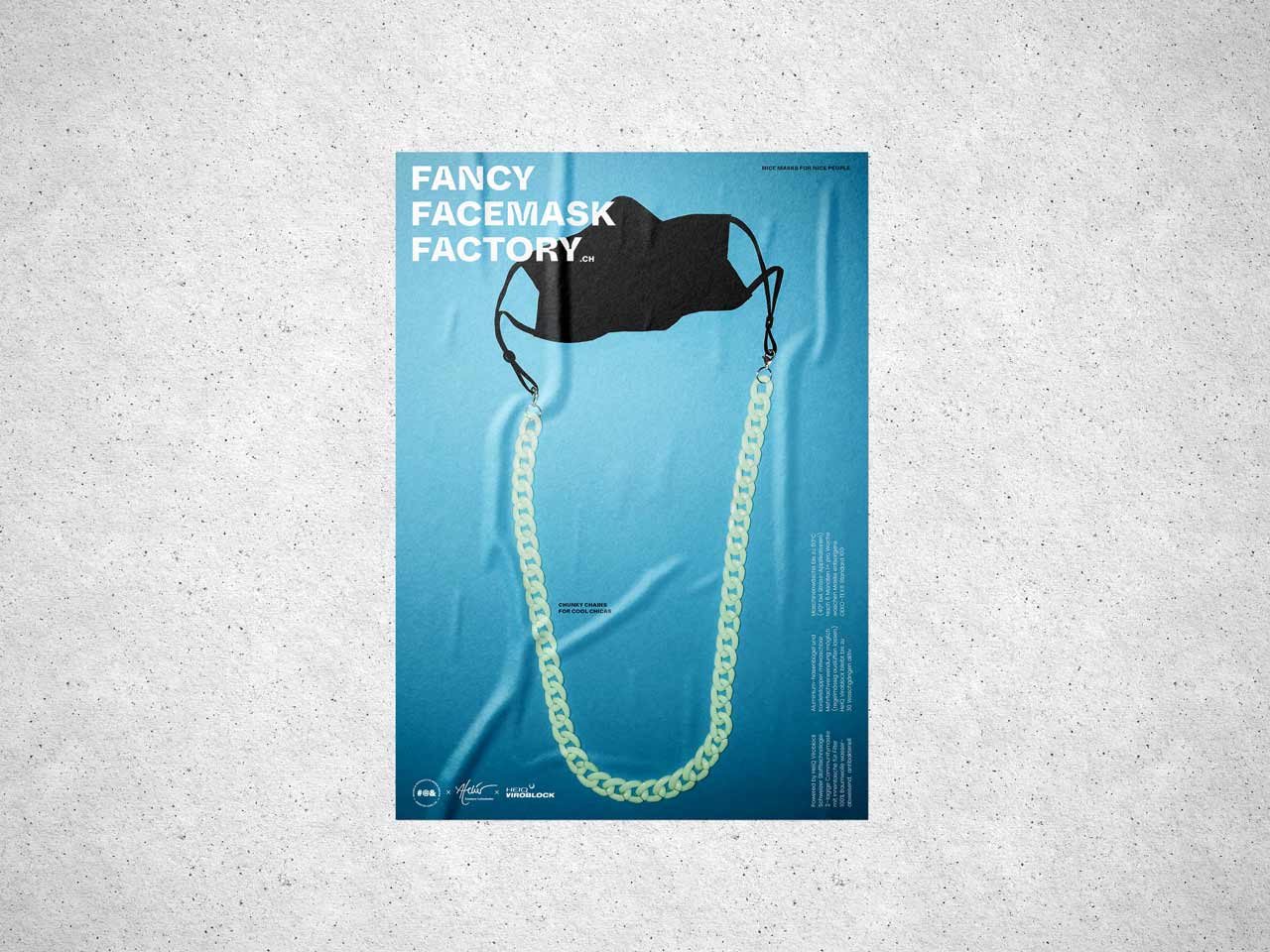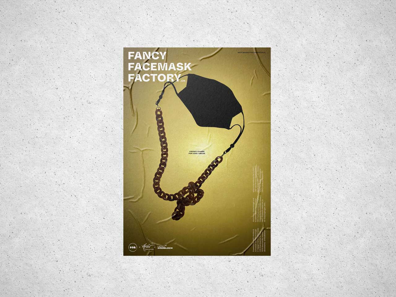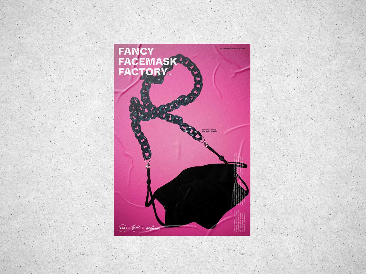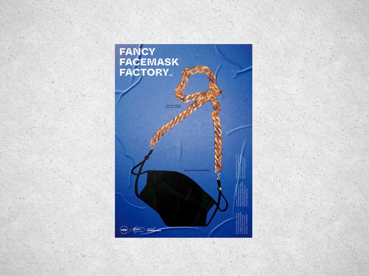 The work done at Studio #@& included the design of the wordmark, the collab label, and a poster series for marketing the Fancy Facemask Factory. The selection of design elements and the message are part of the design process. Color, image and typeface – ABC Whyte Inktrap – reflect the brand personality.