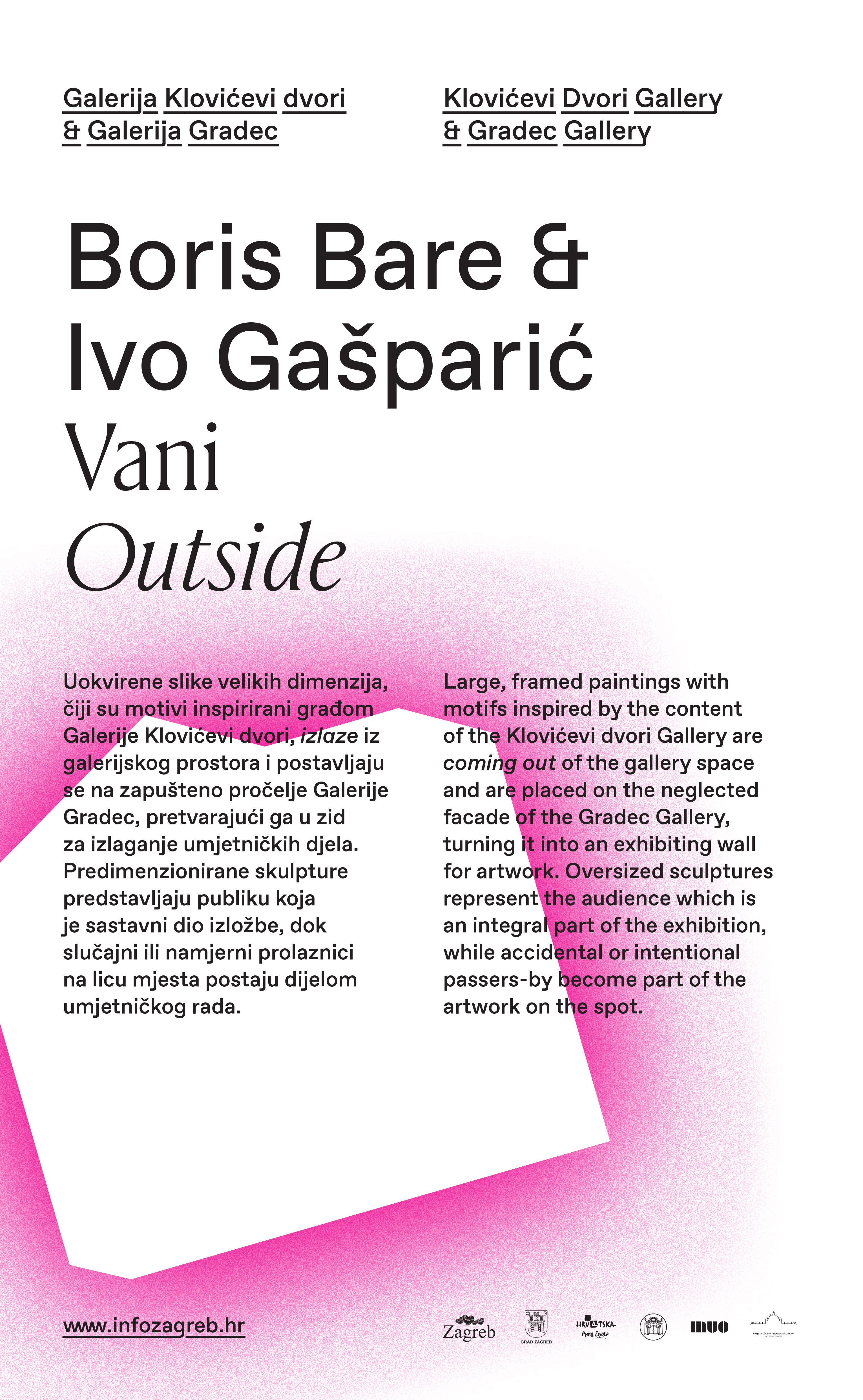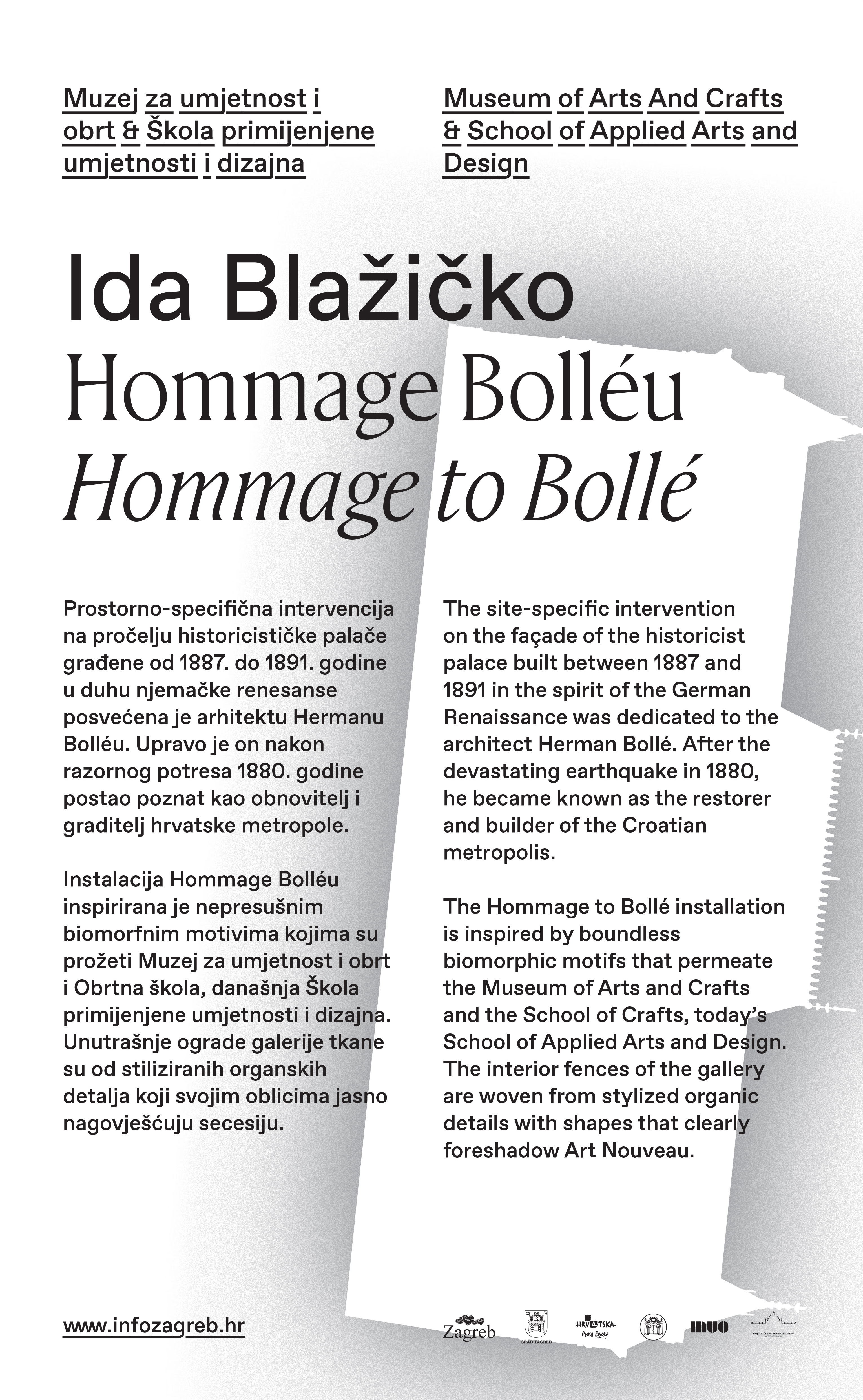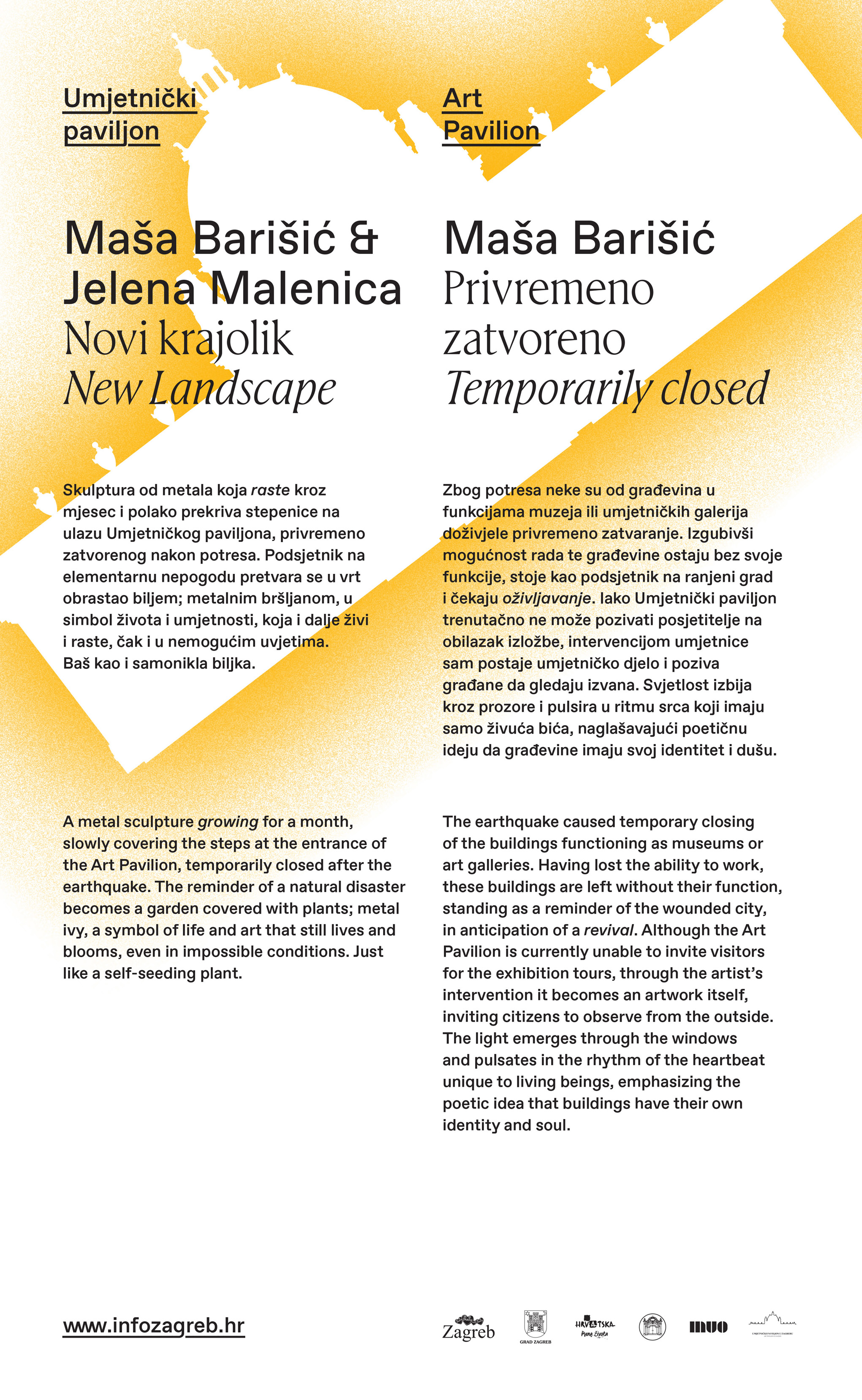 This public month-long exhibition took place at three venues: The Museum of Arts and Crafts, together with the School of Applied Arts and Design, the Art Pavillon, and the Klovicevi Dvori Gallery & Gradec Gallery. Each of them offered different experiences: a metal sculpture “growing” on the stairs of a building, light pulsating from the inside and showing through the windows of another, and even an homage to the paintings of a gallery, with paintings inspired by different patterns found among the artworks hung directly onto the facade of the gallery.