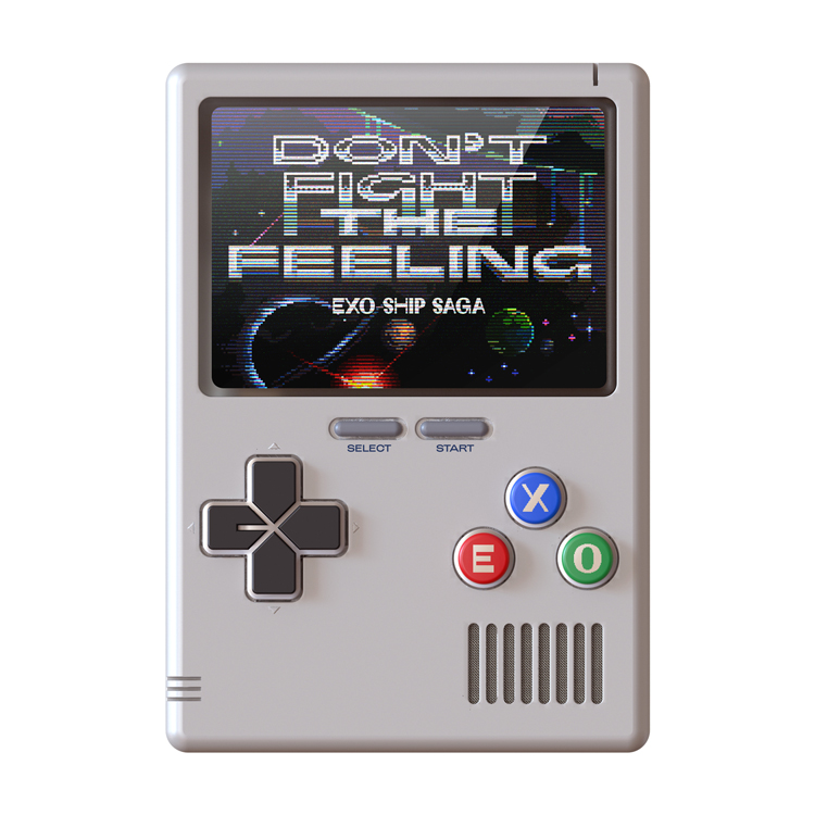 Some applications feature a custom bitmap interpretation of Trois Mille, with outline, gradient and chrome effects, referencing the aesthetics of video games. This version is also used for the EP’s title in Exo-Ship Saga, a space-based web game that was made temporarily available on exoship-saga.com, to promote the release. “Exo Ship Saga” uses feeeels—fuzzy.
