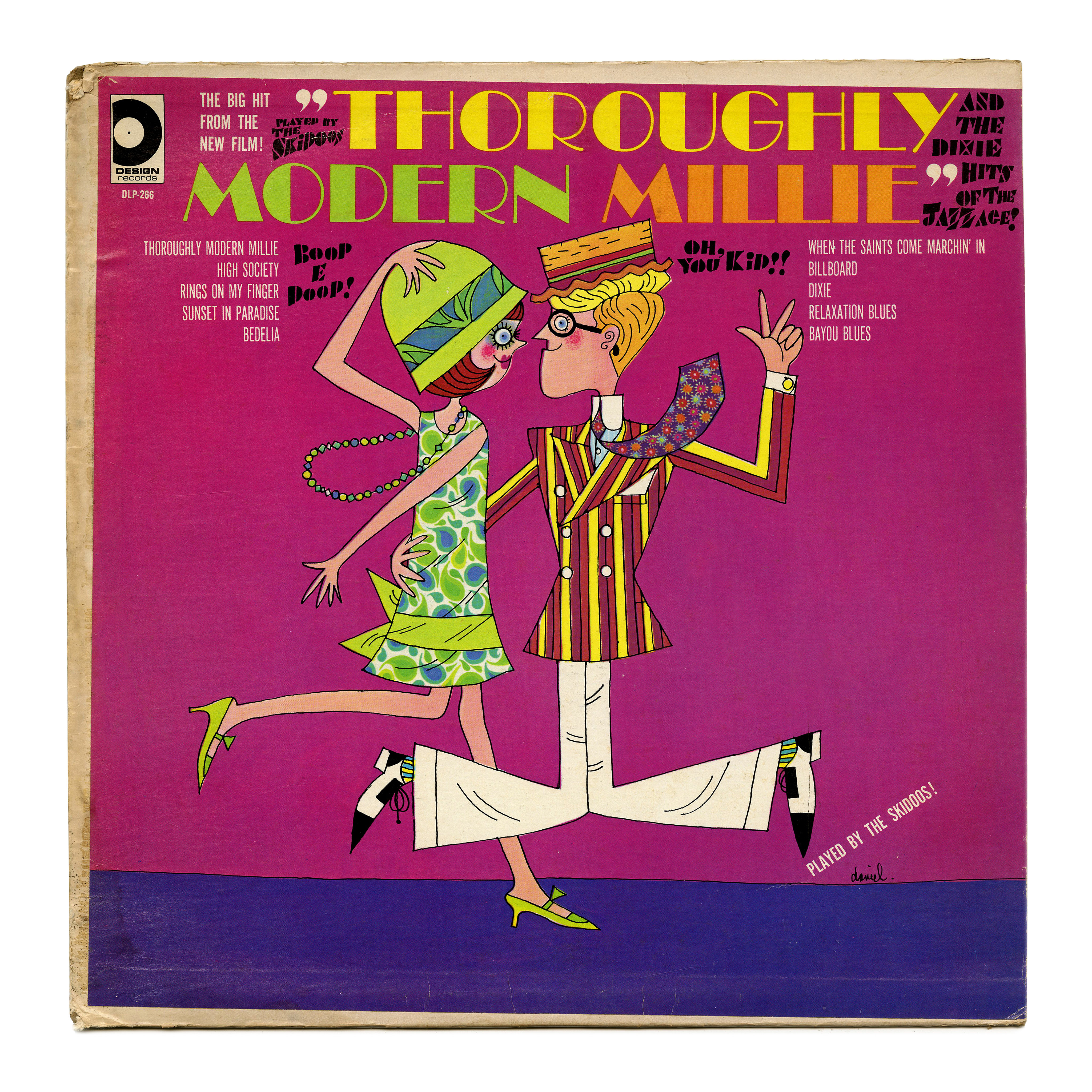 Frank Daniel’s cover design for Thoroughly Modern Millie, a dixieland album recorded by The Skidoos, contrasts Broadway with News Gothic Extra Condensed for the track titles. Both typefaces were designed by Morris F. Benton and are here used in all caps. There’s also lettering that seems to loosely reference Futura Black or similar. Released by Design Records in 1967.