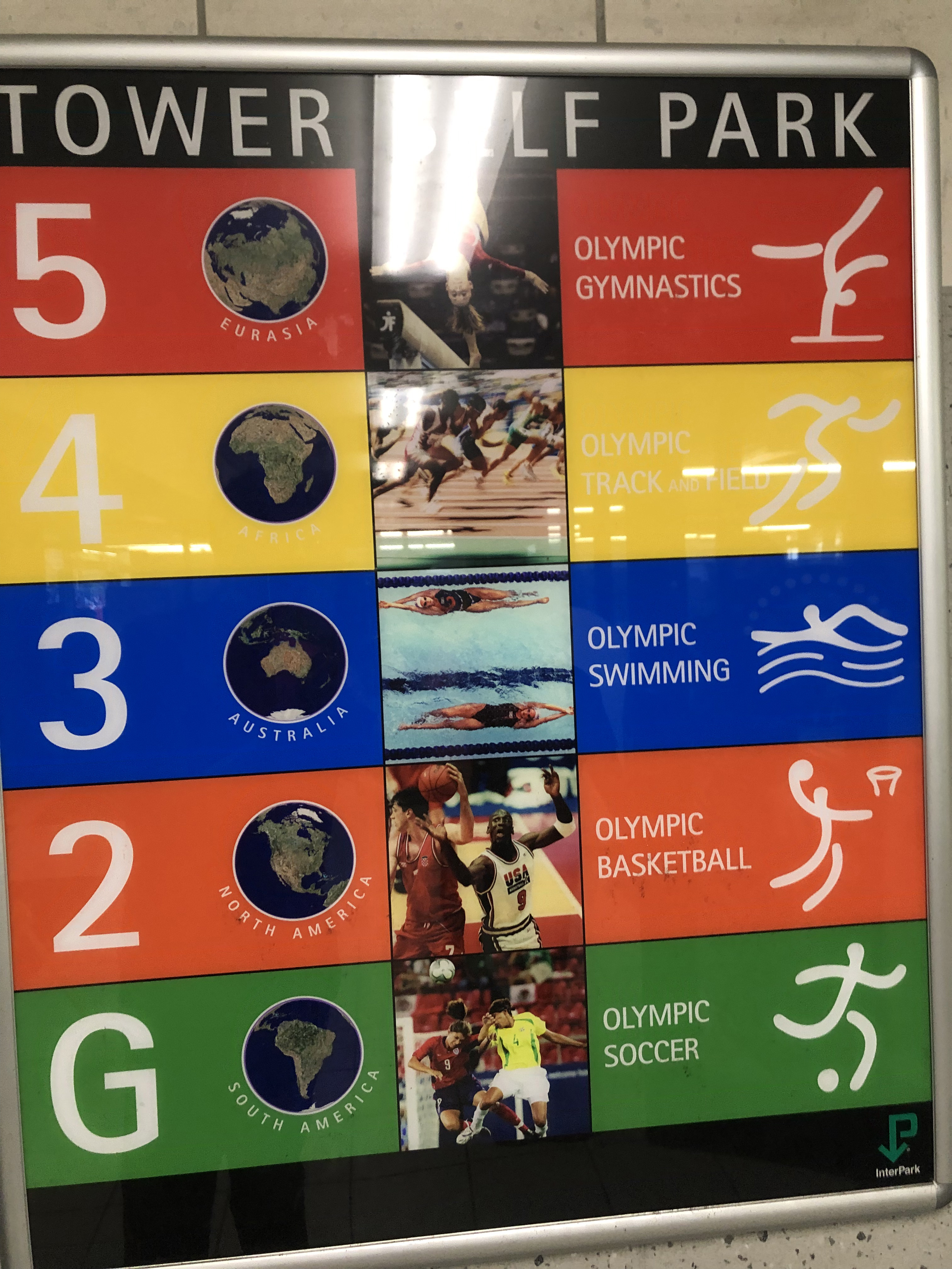 The parking levels directory at InterPark’s Tower Self Park in Chicago, owned by the company iParkit, uses Rotis SansSerif in all caps. As a mnemonic device, each of the levels was assigned one continent and one Olympic discipline, in addition to the number and the color. The pictograms are the ones that were designed for the Beijing Olympics in 2008.