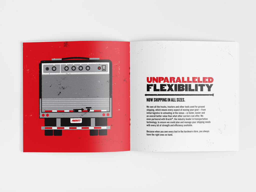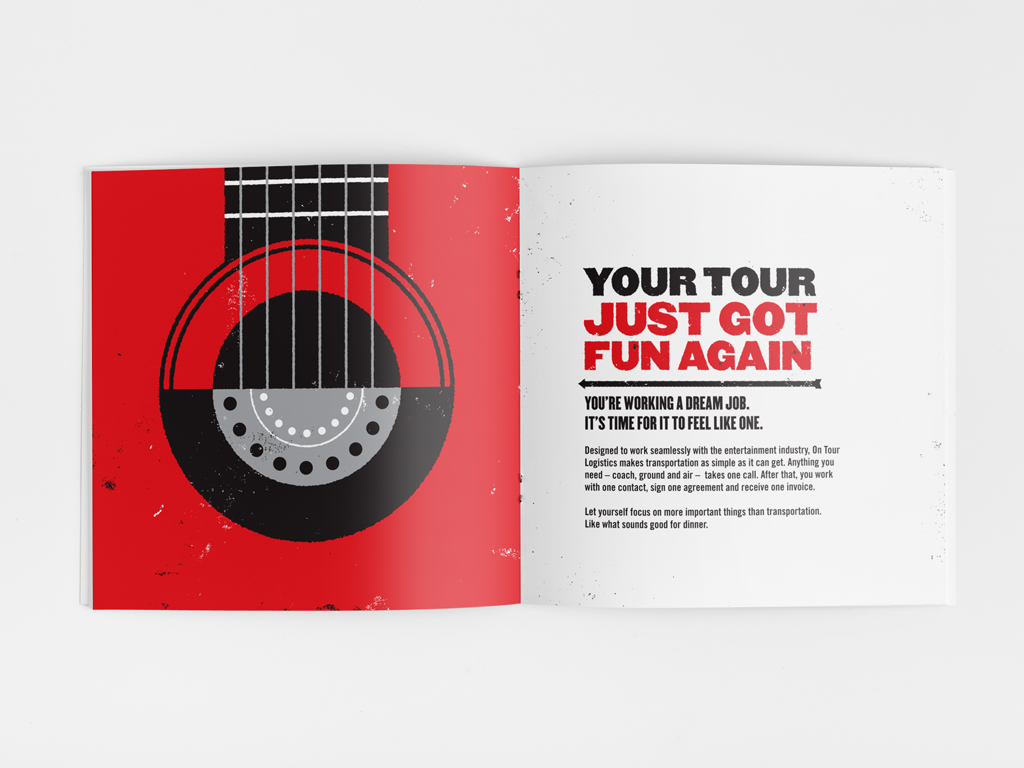 On Tour Logistics needed a collateral piece to connect with tour managers and instill confidence that On Tour Logistics knew the music industry and were experts in transportation. Here’s what our redpepper team knew: tour managing is a dream job but it doesn’t always feel that way, and On Tour Logistics helps. So we designed a brochure in 7-inch record style (complete with sleeve), with custom illustrations of music gear seamlessly merged with transportation gear, with an opening message that reads, “Your tour just got fun again.” We utilized the great family of weights within the Champion Gothic family to really give this project the bold visual look and tone we were looking for.