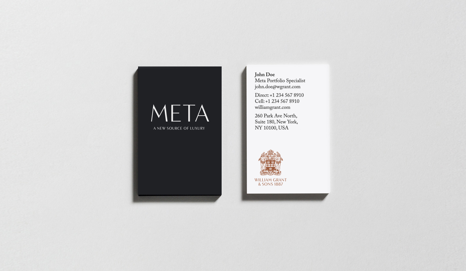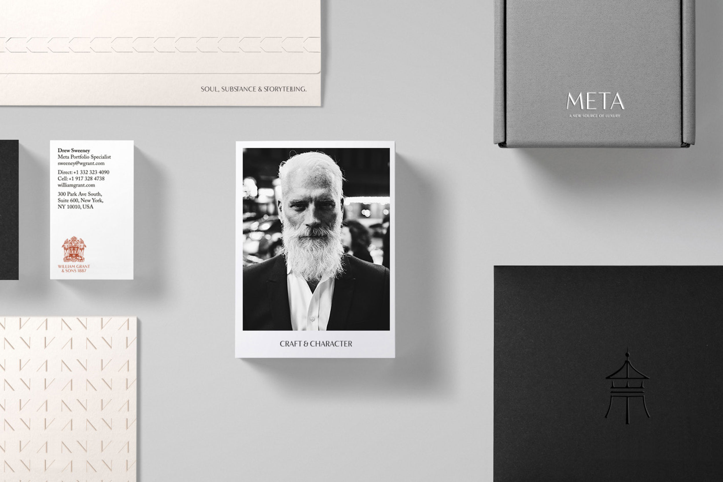 The independent, family-owned Scottish company distils Scotch whisky and other spirits. Established in 1887 by William Grant, it is now run by his descendants. The identity uses a bespoke version of F37 Bergman for William Grant & Sons as a hallmark of the brand. It is paired with Adobe Caslon or similar for the business card, and Sabon for the website (not pictured).