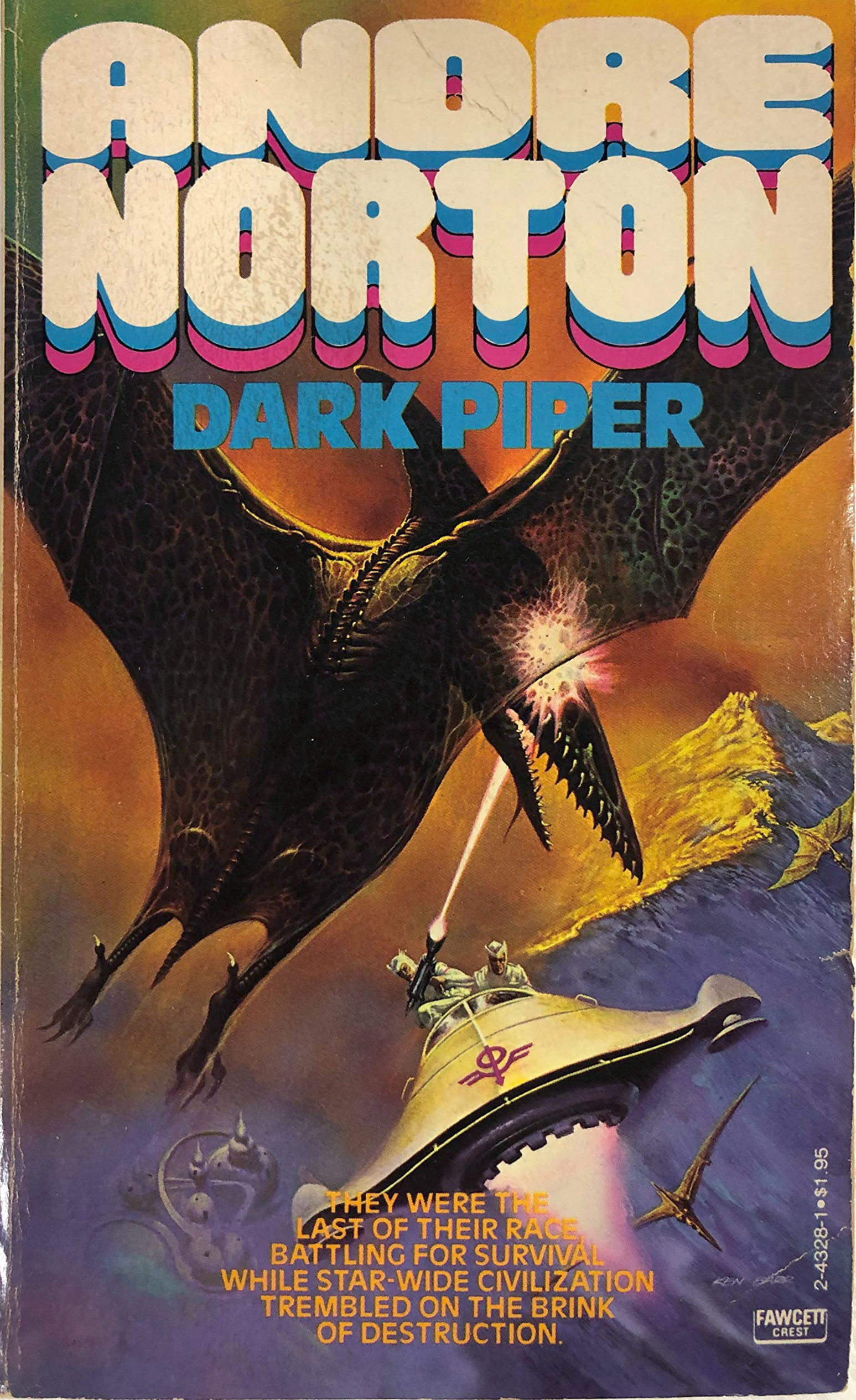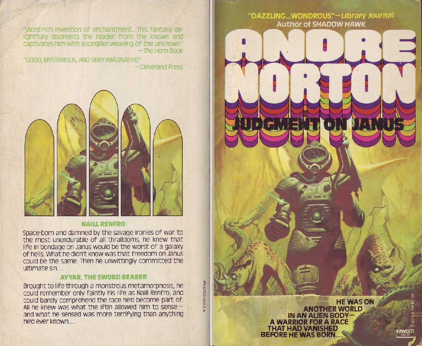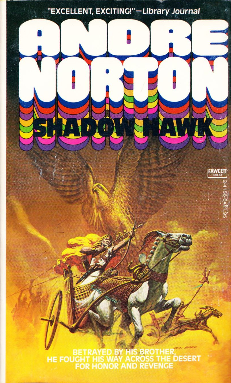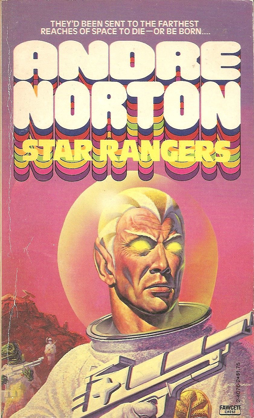 The most extensive use of Accelera that I’m aware of is for a series of science fiction novels by Andre Norton (1912–2005), published in paperback by Fawcett Crest between 1979 and 1981. Apparently three shadows were considered insufficient to hint at the depth of Norton’s adventures in space: in the first volumes, the number of typographic echoes was cranked up to a whopping eight, printed in alternating colors. In later additions, it was decided that a double shadow is enough.