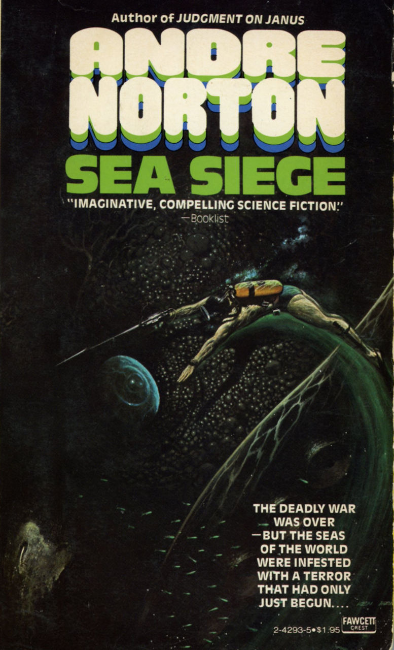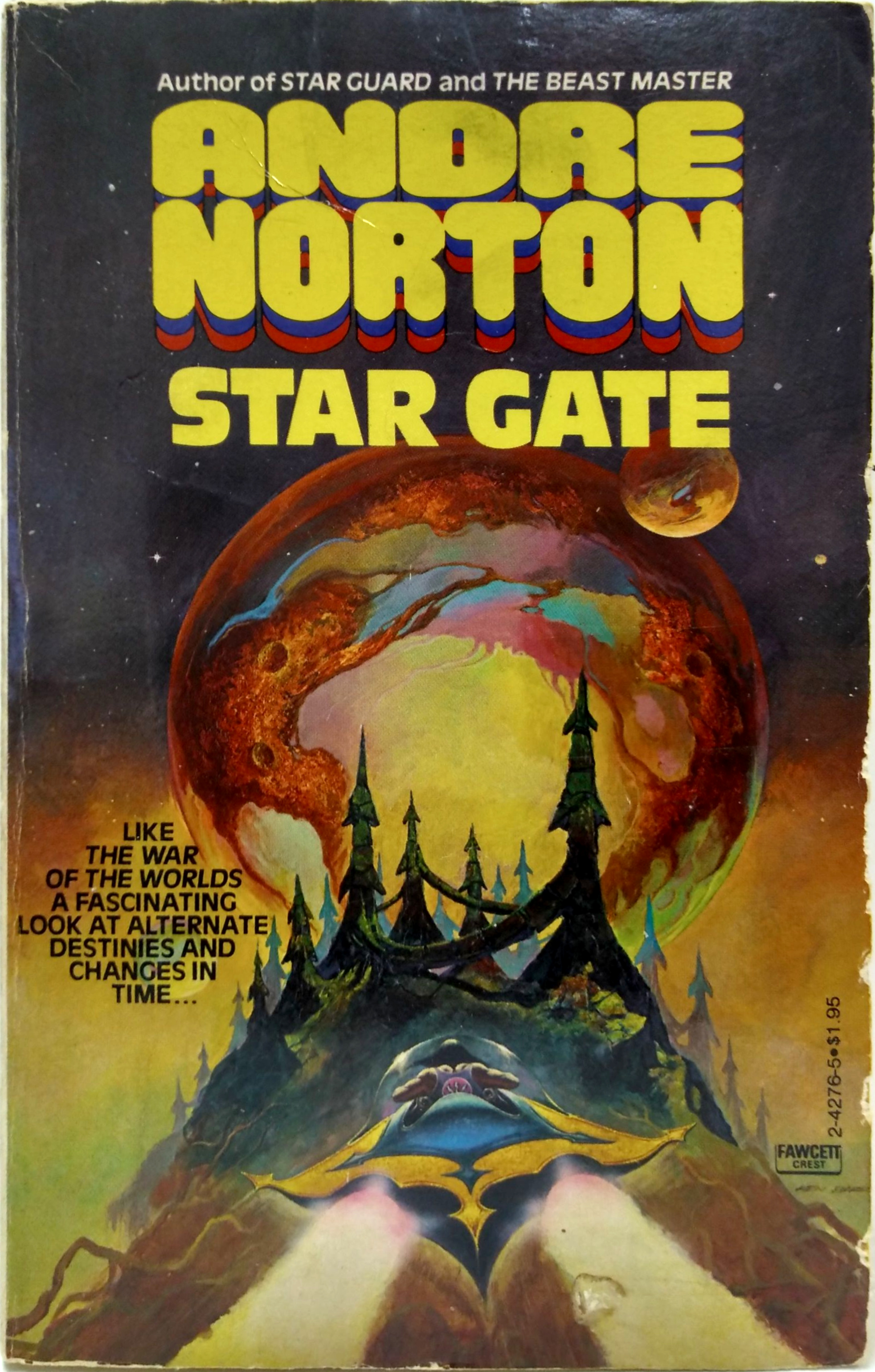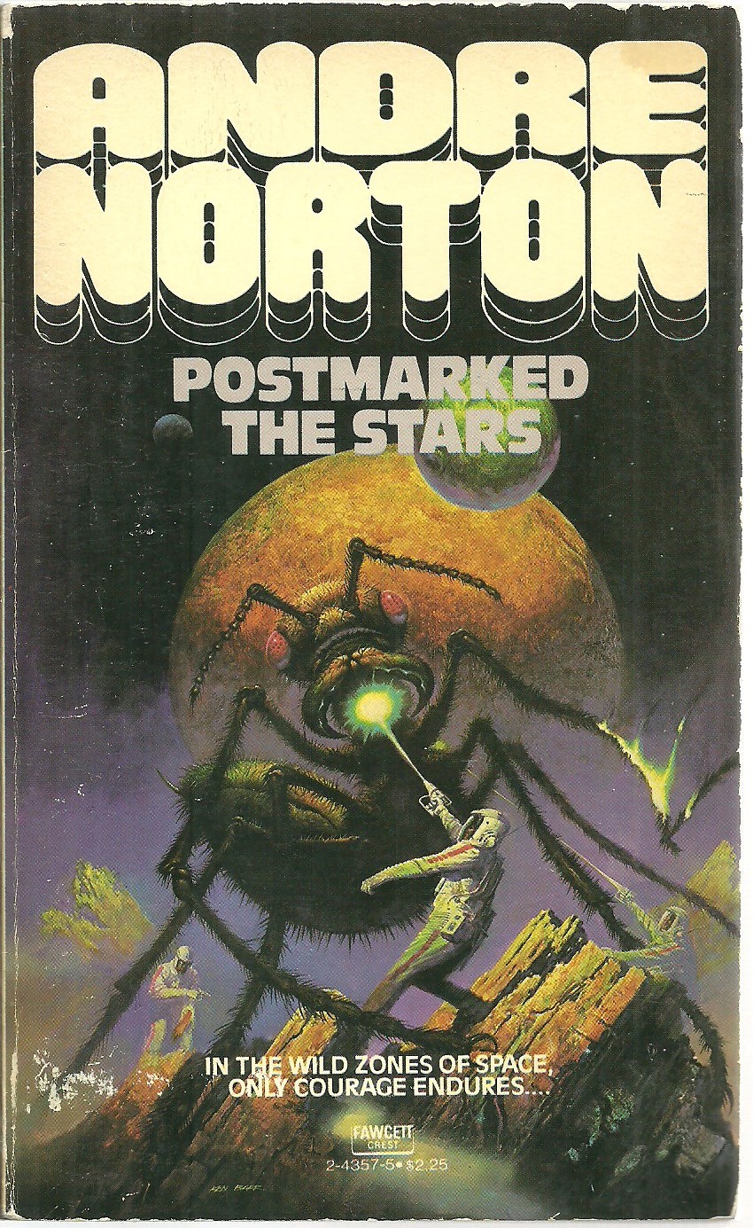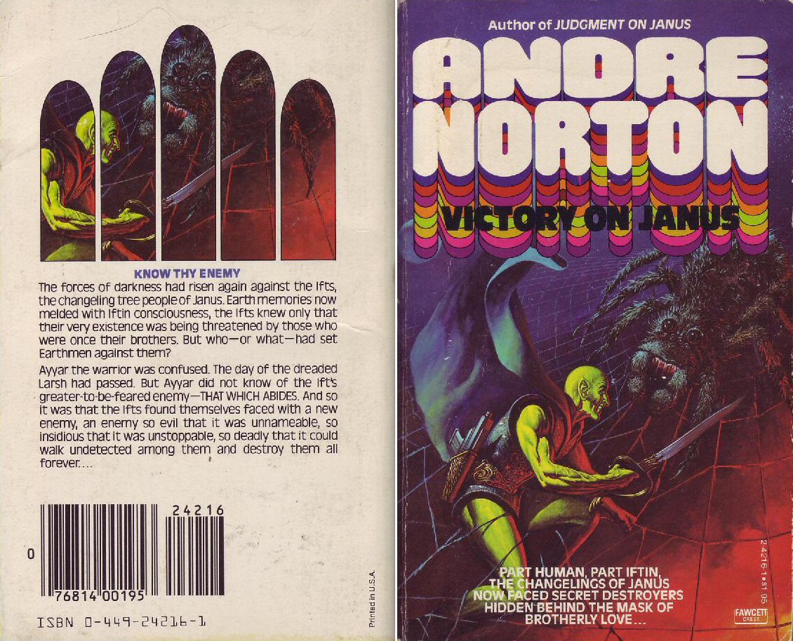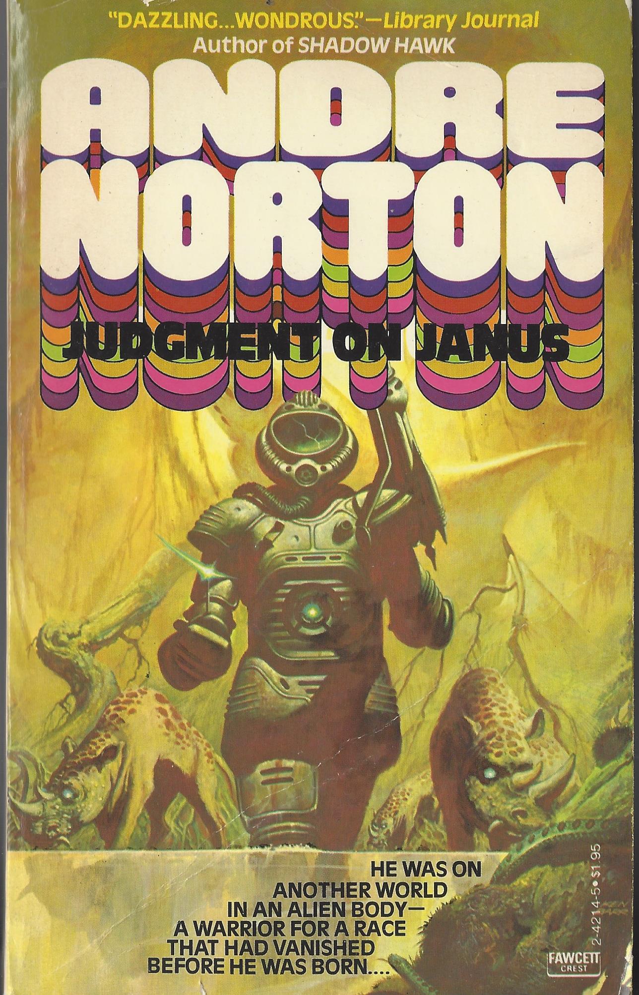 The most extensive use of Accelera that I’m aware of is for a series of science fiction novels by Andre Norton (1912–2005), published in paperback by Fawcett Crest between 1979 and 1981. Apparently three shadows were considered insufficient to hint at the depth of Norton’s adventures in space: in the first volumes, the number of typographic echoes was cranked up to a whopping eight, printed in alternating colors. In later additions, it was decided that a double shadow is enough.