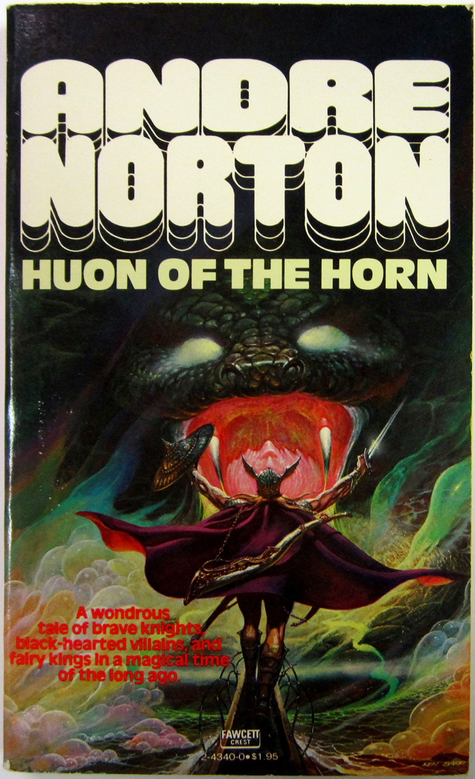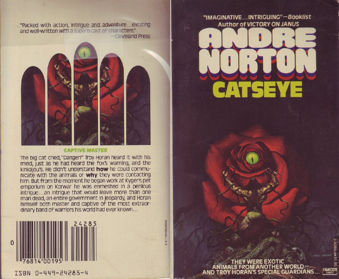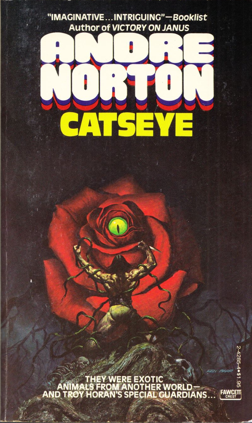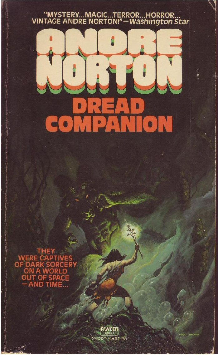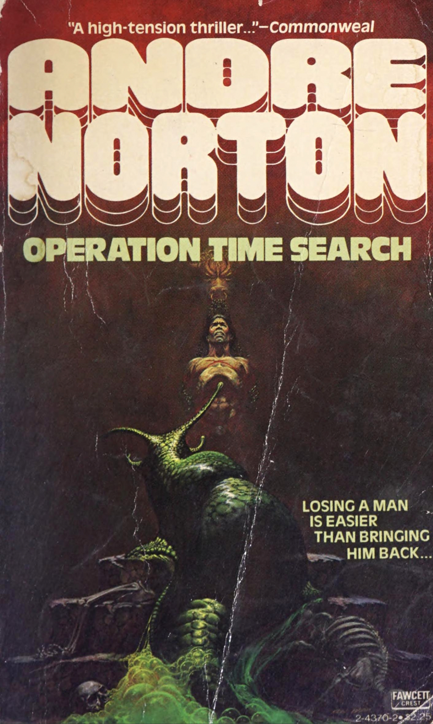 The most extensive use of Accelera that I’m aware of is for a series of science fiction novels by Andre Norton (1912–2005), published in paperback by Fawcett Crest between 1979 and 1981. Apparently three shadows were considered insufficient to hint at the depth of Norton’s adventures in space: in the first volumes, the number of typographic echoes was cranked up to a whopping eight, printed in alternating colors. In later additions, it was decided that a double shadow is enough.