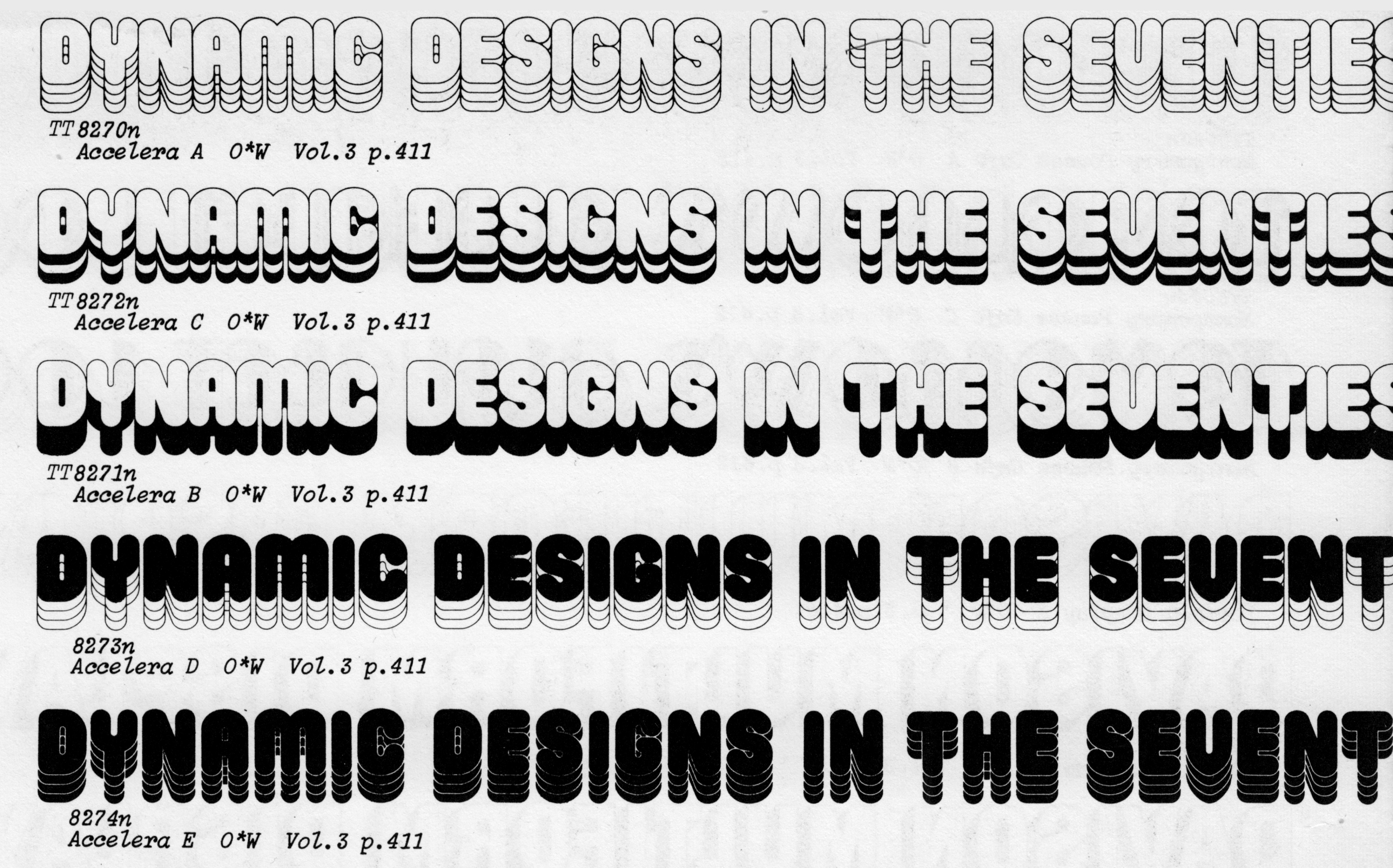 Accelera is an all-caps typeface shown by Photo-Lettering in their Alphabet Thesaurus Vol. 3 from 1971, without individual design credits. The extrabold rounded sans is distinguished by a triple South shade. It was offered in five variants named A to E. In A, letterforms and shades are all open. B has open letterforms and solid shades. It’s reversed in D. In Accelera C, the first and third shades are filled in. Finally, all parts are solid in E.