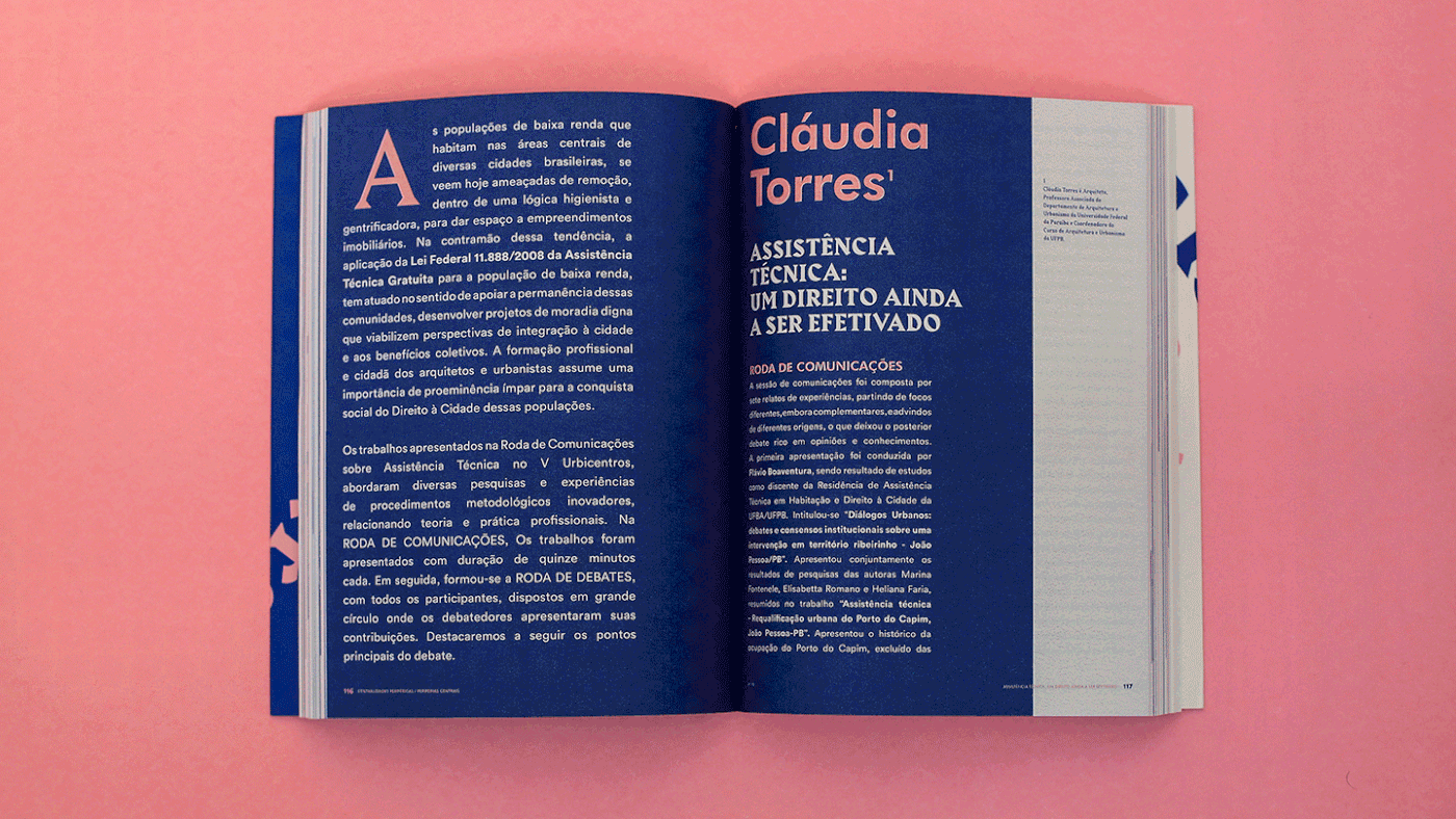 The design and printing process followed an aesthetic that proposes to intervene in the reading flow itself, thus reflecting the aesthetics of these peripheral spaces. The experimentalism in the compositions and color palette, using only two Pantones in printing, allowed the book to have its own identity.