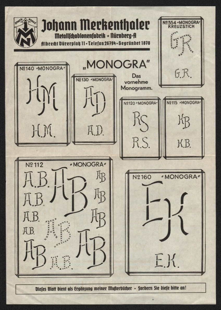 Leaflet advertising stencils for embroidering monograms, including “‘Monogra’, the distinguished monogram”. The sheet was issued by the Johann Merkenthaler factory of metal stencils in Nuremberg, Germany, probably in the mid-1930s. The simplified gotisch is Walter Höhnisch’s National schmal halbfett, or bold condensed, which was first cast in 1933. The geometric sans serif is Erbar-Grotesk (1926).