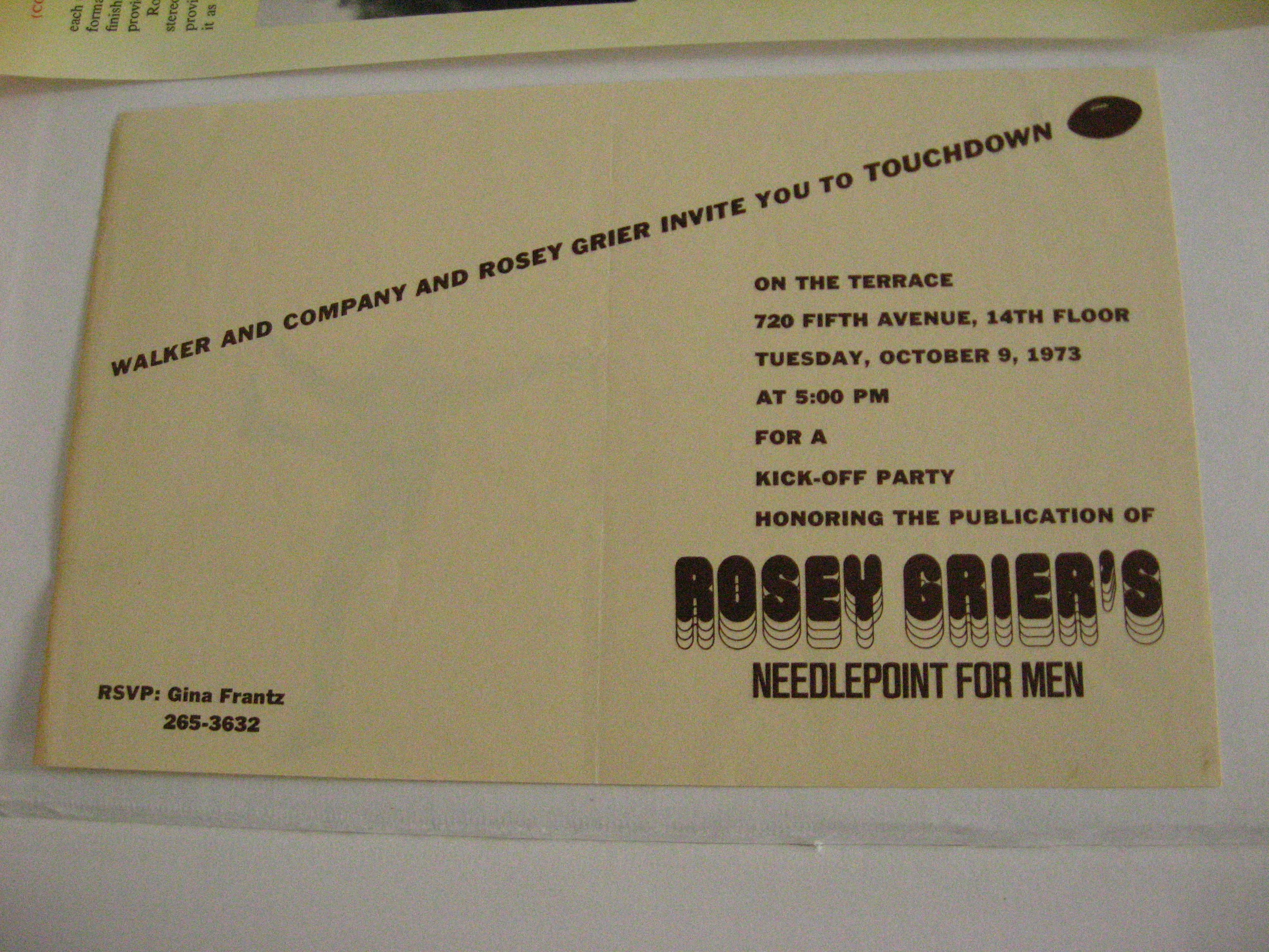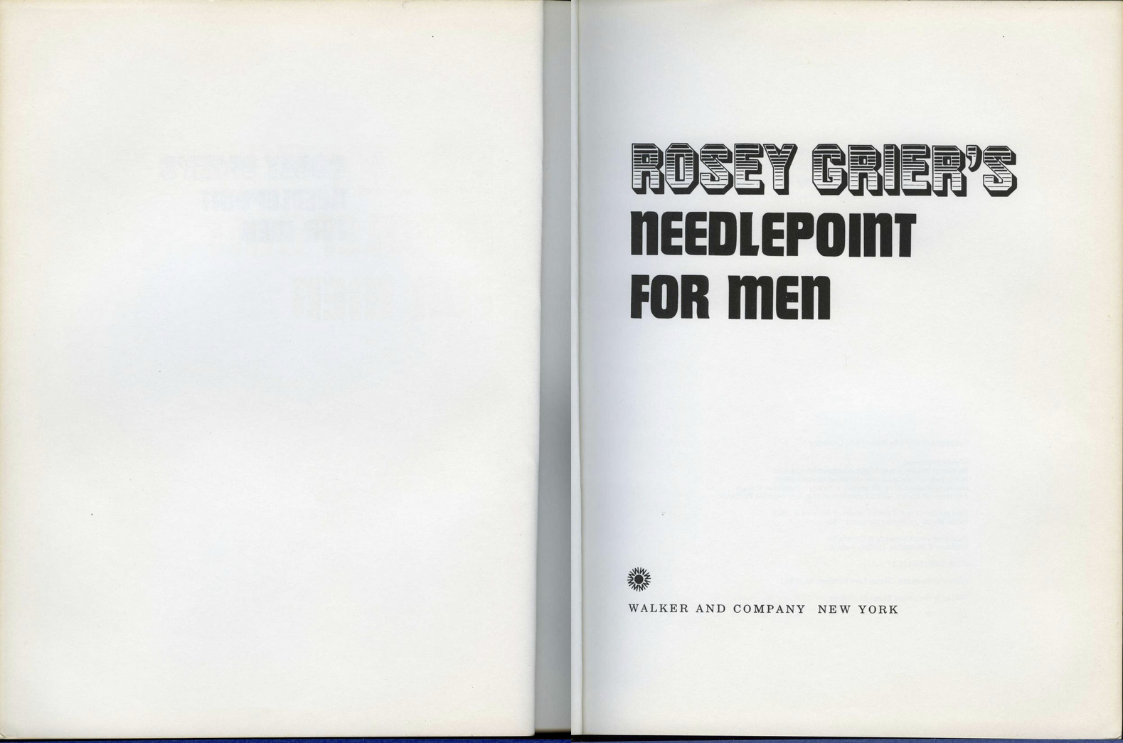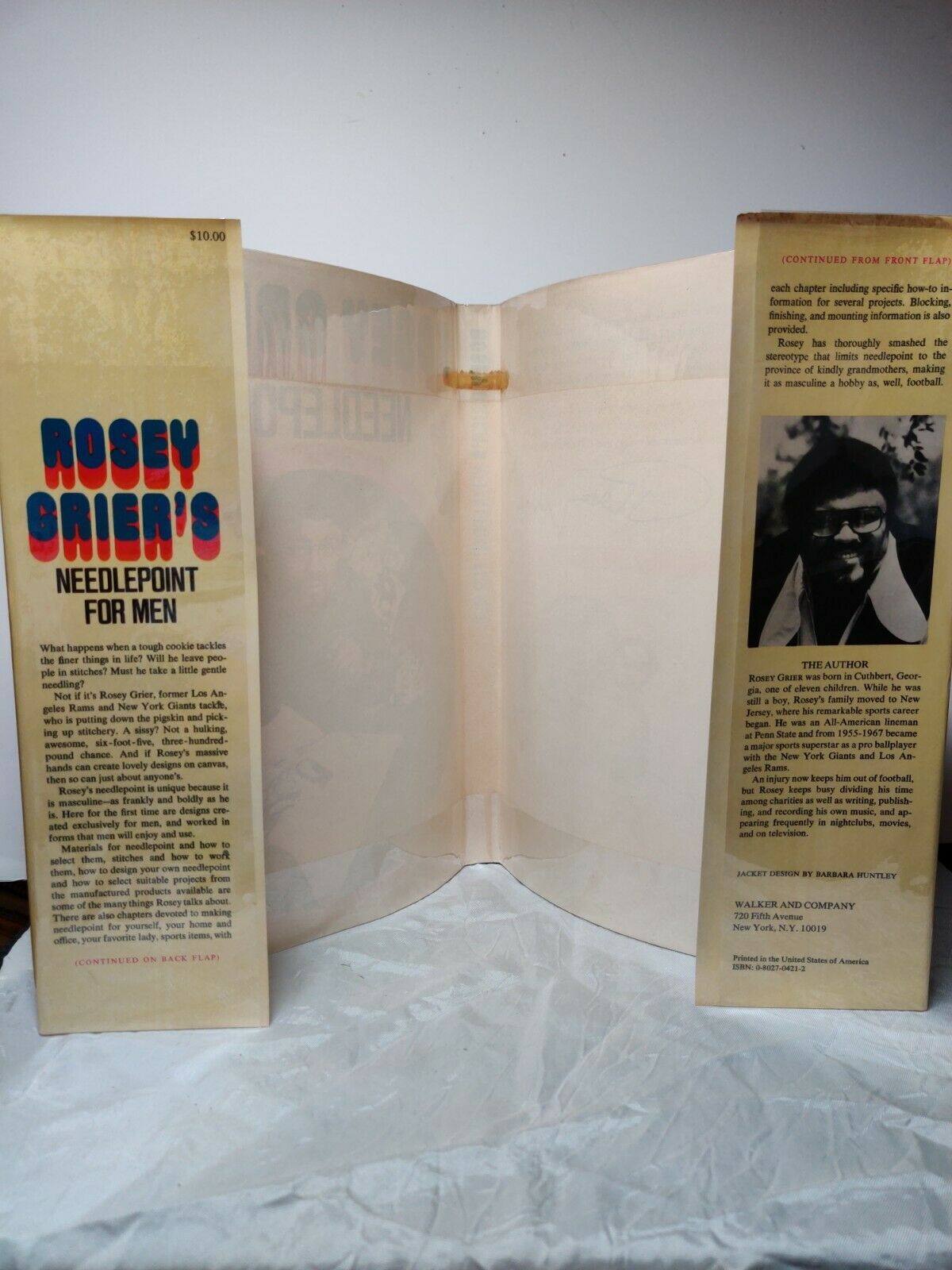 Rosey Grier’s Needlepoint for Men is a craft book written by Rosey Grier (b. 1932) and published by Walker & Co. in 1973. From the inner flap: