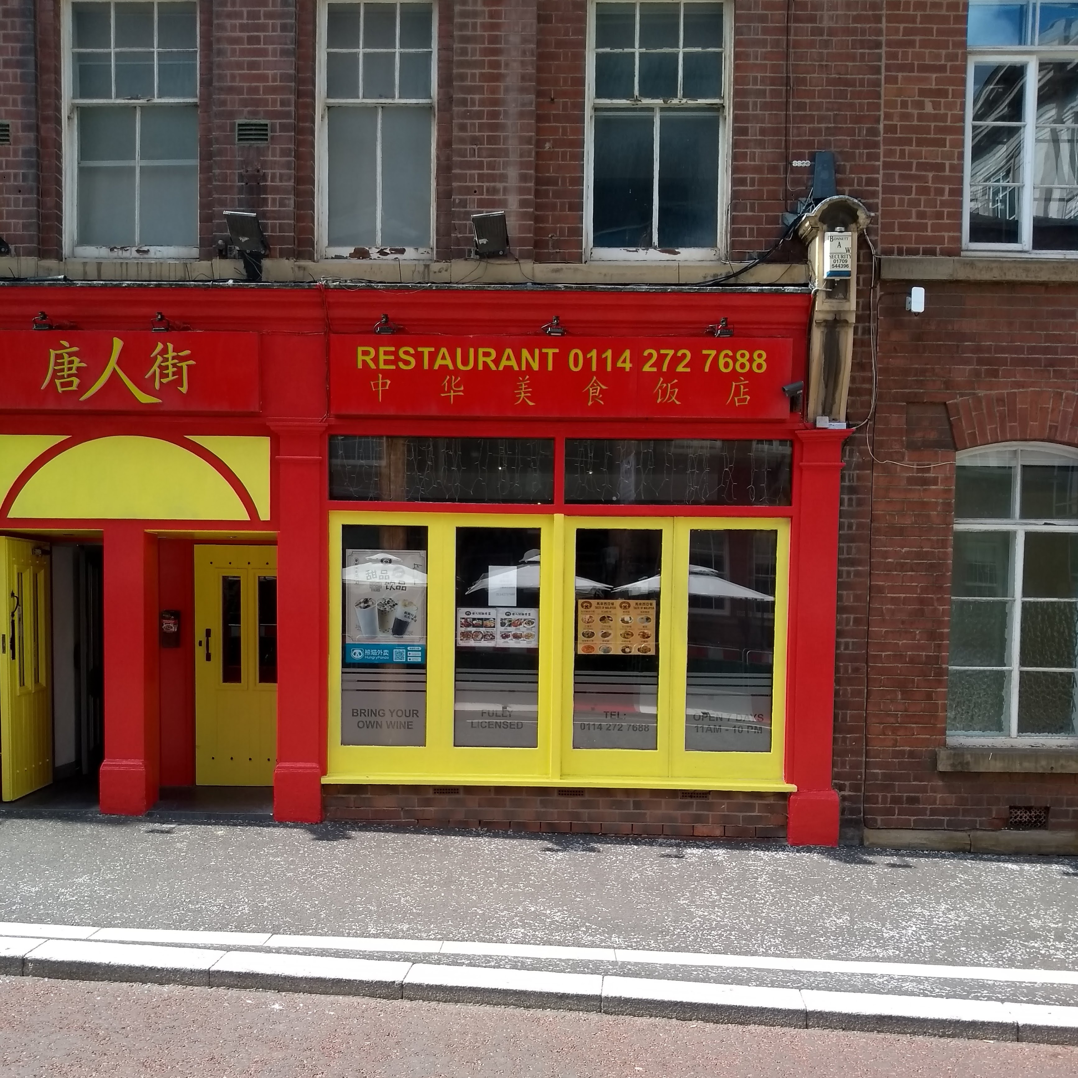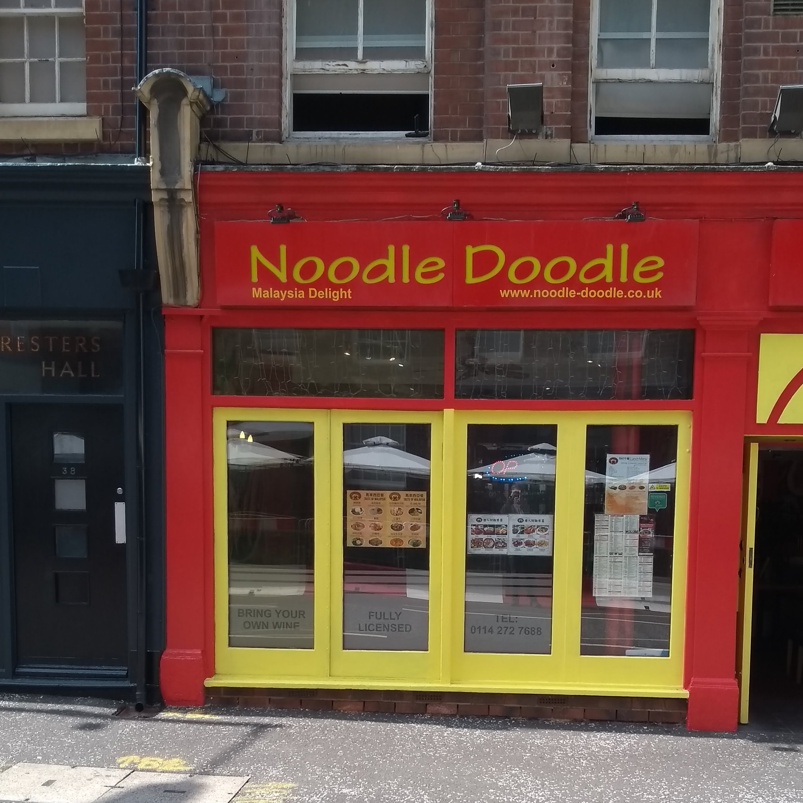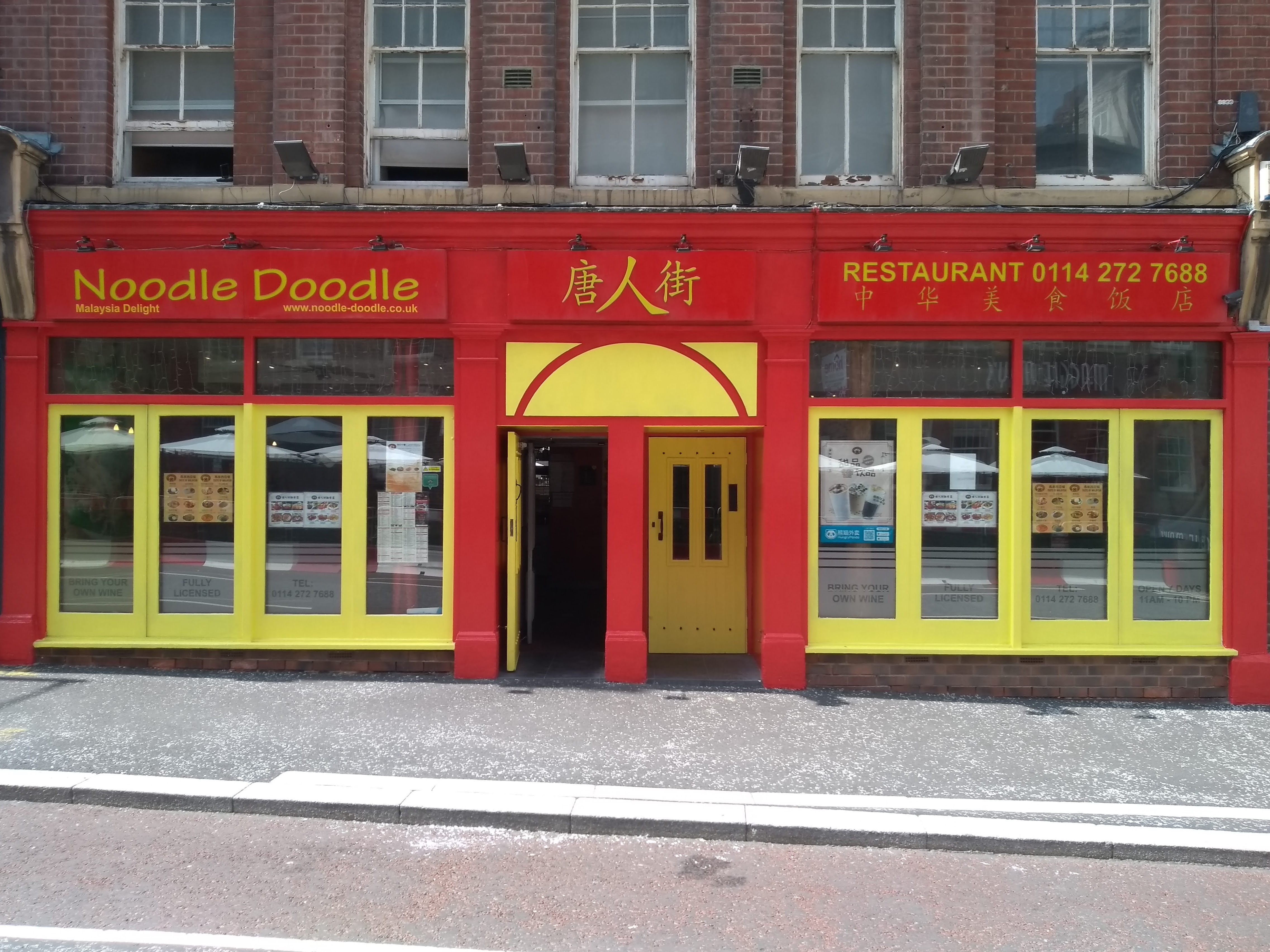 Noodle Doodle, and the other secondary and Hanzi script text, is in yellow-on-red, matching the decor of the restaurant’s shopfront.