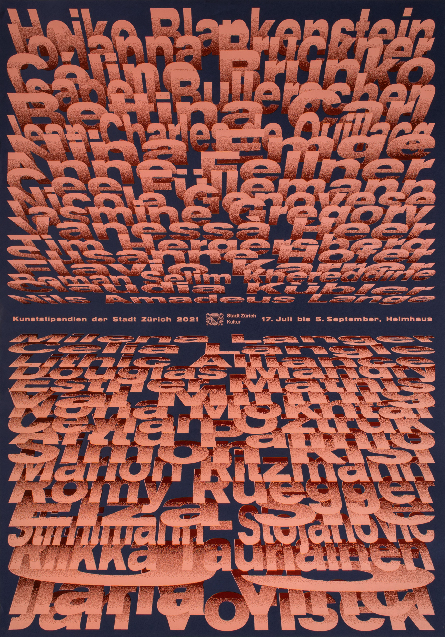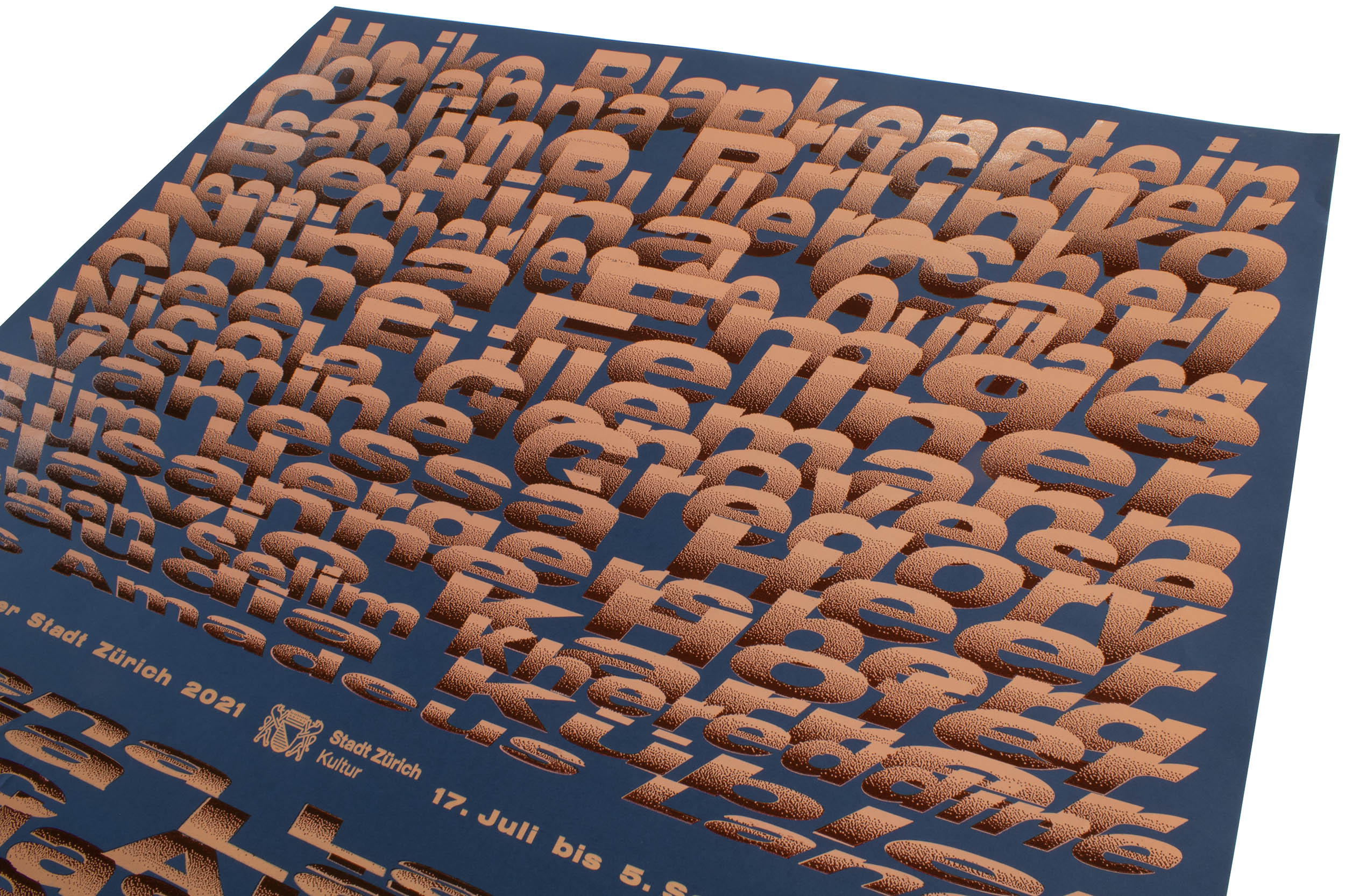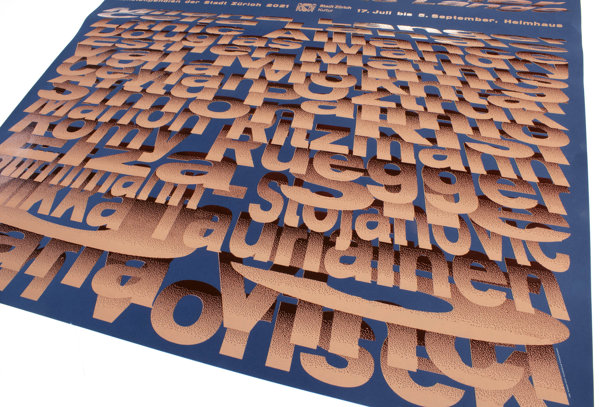 Poster for Kunststipendien der Stadt Zürich (Art Stipends for the City of Zurich). Printed in a total of 23 print runs (yes, this was crazy!) with many helpers in my studio. Mainly laser-cut MDF and a bit of metal type.