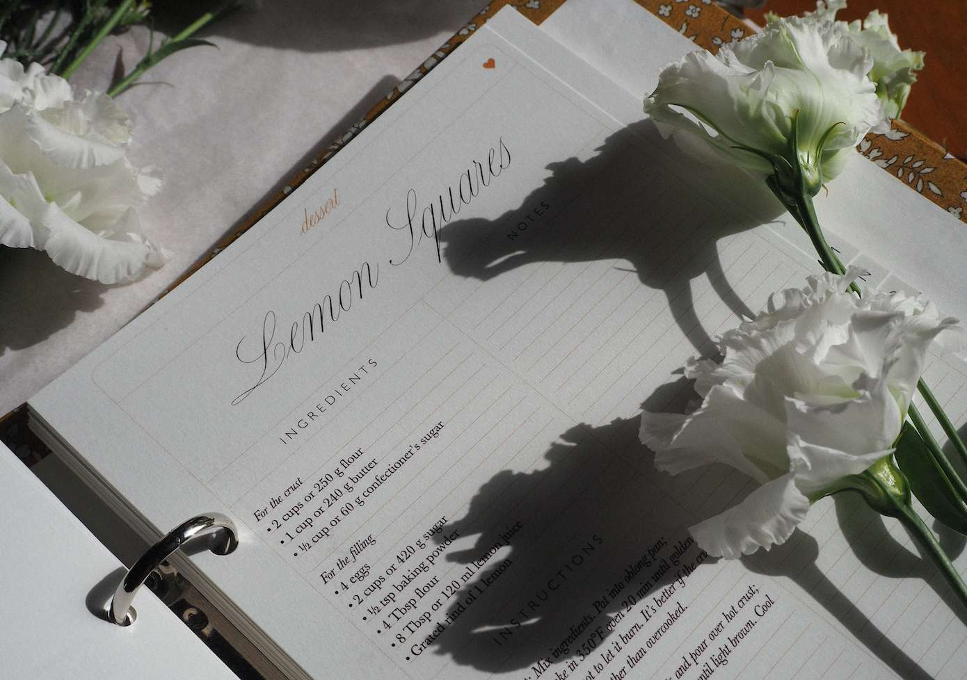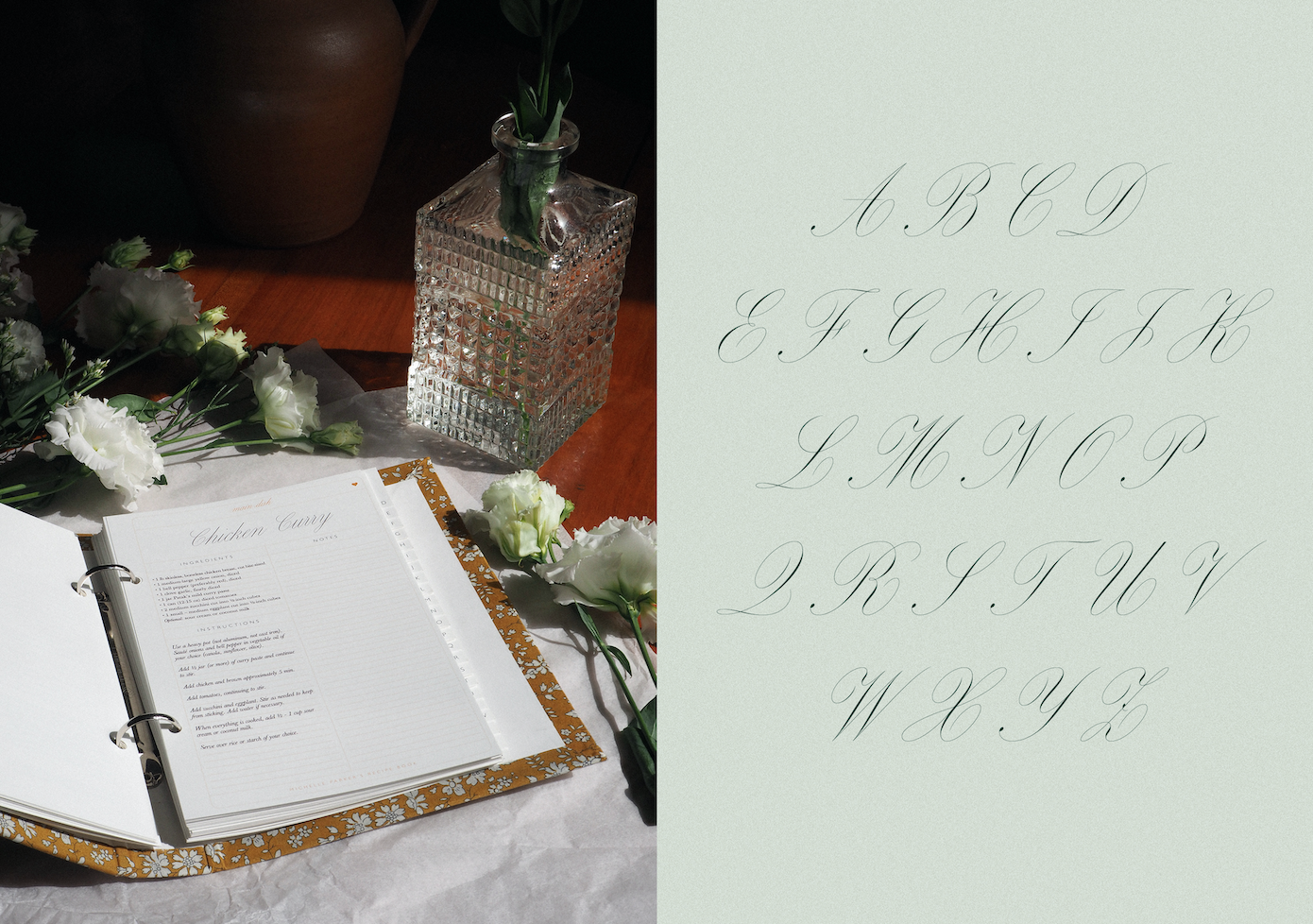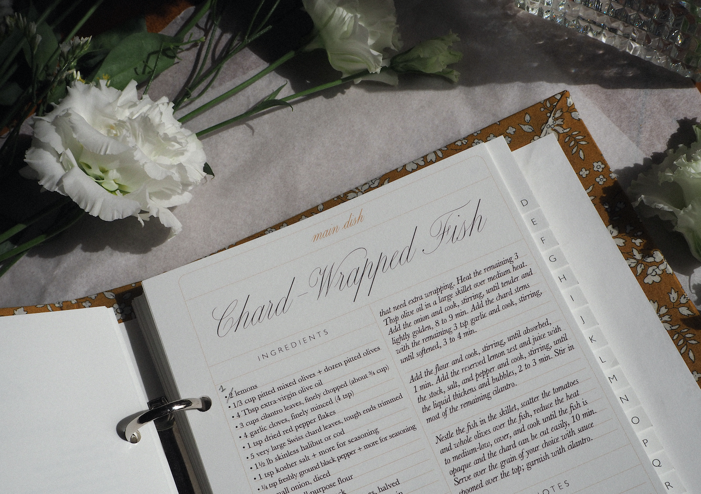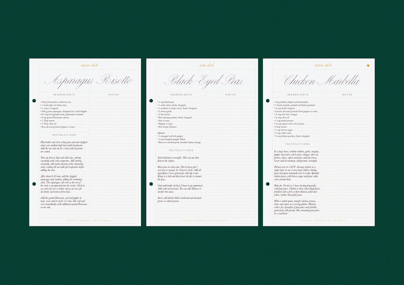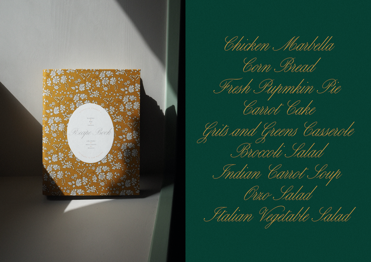 A personal recipe book for Michelle Parker which was “60 years in the making”, comprising of signature American recipes, but also international cuisine. Inspired by the iconic The Silver Palate Cookbook. The cover was made with Liberty London fabric. Recipes are set in Baskerville, paired with headlines in Carta Nueva and selected lines set in loosely spaced capitals of Gill Sans.