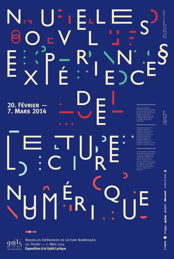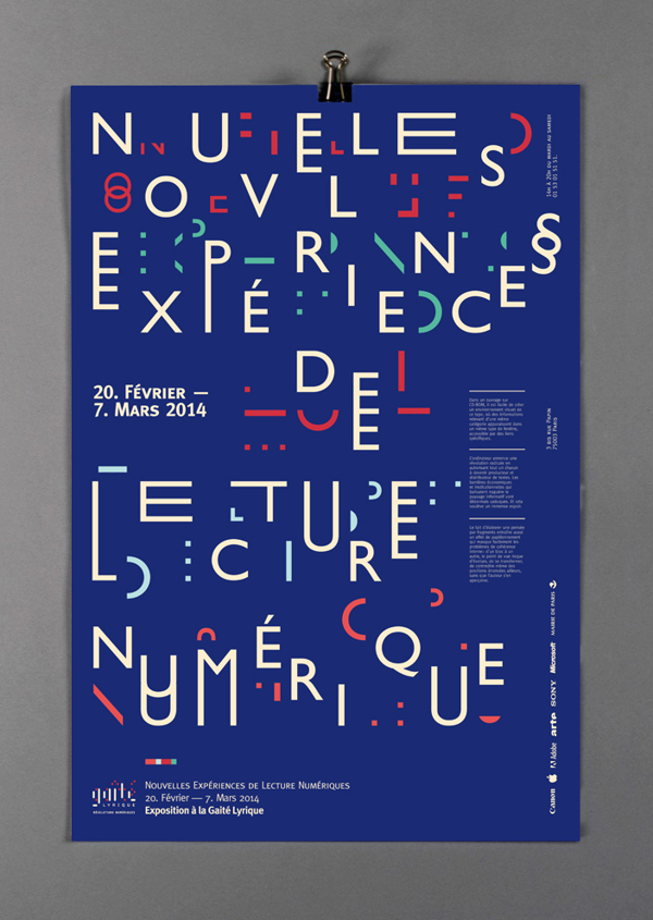 Nouvelles Expériences de lecture numérique Contributed by Scott Renau on Jul 1st, 2013. Artwork published in 2013. Source: www.behance.net Scott Renau. License: CC BY-NC-ND. Poster for an exhibition at La Gaïté Lyrique in Paris; 40×60cm (student project) Source: www.behance.net Scott Renau. License: CC BY-NC-ND. Typefaces More about Gill SansGet Gill SansMore about FF MetaGet FF Meta Formats Posters/Flyers (5869) Exhibition/Installation (1214) Topics Event (3286) Designers/Agencies Scott Renau (2) Tagged withESAG (2)ESAG Penninghen (2)gaïté (1)lyrique (1)posters (1444)exhibitions (347)student works (786)modified typeface (1771)trendlisty (118)hyper-extended glyphs (343)bouncing baseline (406) Artwork location France (2904) Paris (1357) In SetsHammer (Florian Mörk) (73) Post a comment Name Email – will not be published Website Your response Submit Comment More Gill Sans in use Various Artists – Smash water people, ok? album cover2000unknownContributed by Arra Reai Staff Pick Chanter Sisters – “Cuckoo-Cuckoo” / “Sweet Water Memory” German single cover1975unknownContributed by Garrison Martin Double meaning greeting cards2014Florence MeunierContributed by Florence Meunier Staff Pick Sponsor More in Event Mulheres, trabalho e poder2020Moscou DesignContributed by Moscou Design Visual Grammar exhibition posters2012Project ProjectsR2 DesignGeorge HardieContributed by Tânia Raposo Singapore Art Book Fair 20182018Melvin TanCurrencyContributed by Production Type Staff Pick Dinner to the American Press Humorists (1906)1906unknownContributed by Florian Hardwig More in Exhibition/Installation Homo Absentia open-air exhibition2021Ugnė BalčiūnaitėContributed by Ugne Balciunaite Guru2007Contributed by Nick Sherman Staff Pick Objectes Comuns / Common Objects exhibition2021pfp, dissenyGuri Casajuana ArquitectesContributed by SM Foundry MahN — Sous les dehors du dessin exhibition2017Chris GautschiContributed by Swiss Typefaces More Fonts In Use Campamento Para Jóvenes Naturalistas exhibition2020Mauricio GarzaContributed by Altiplano Typefaces Staff Pick U&lc, Vol. 1 #2, 19741974Herb LubalinContributed by Stéphane Darricau Staff Pick Best Book Design from All over the World 20222023Bureau MitteAnna PirotContributed by Erkin Karamemet Staff Pick Dirty Heads and Sublime with Rome gig poster2021Charlie WagersContributed by Jen Hood Staff Pick