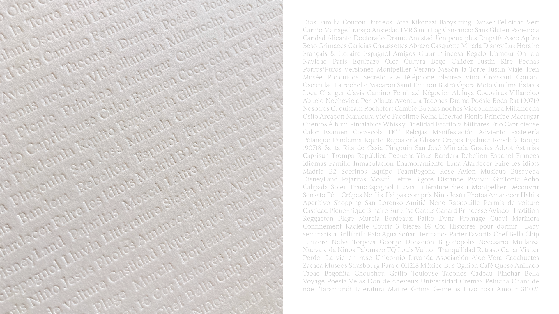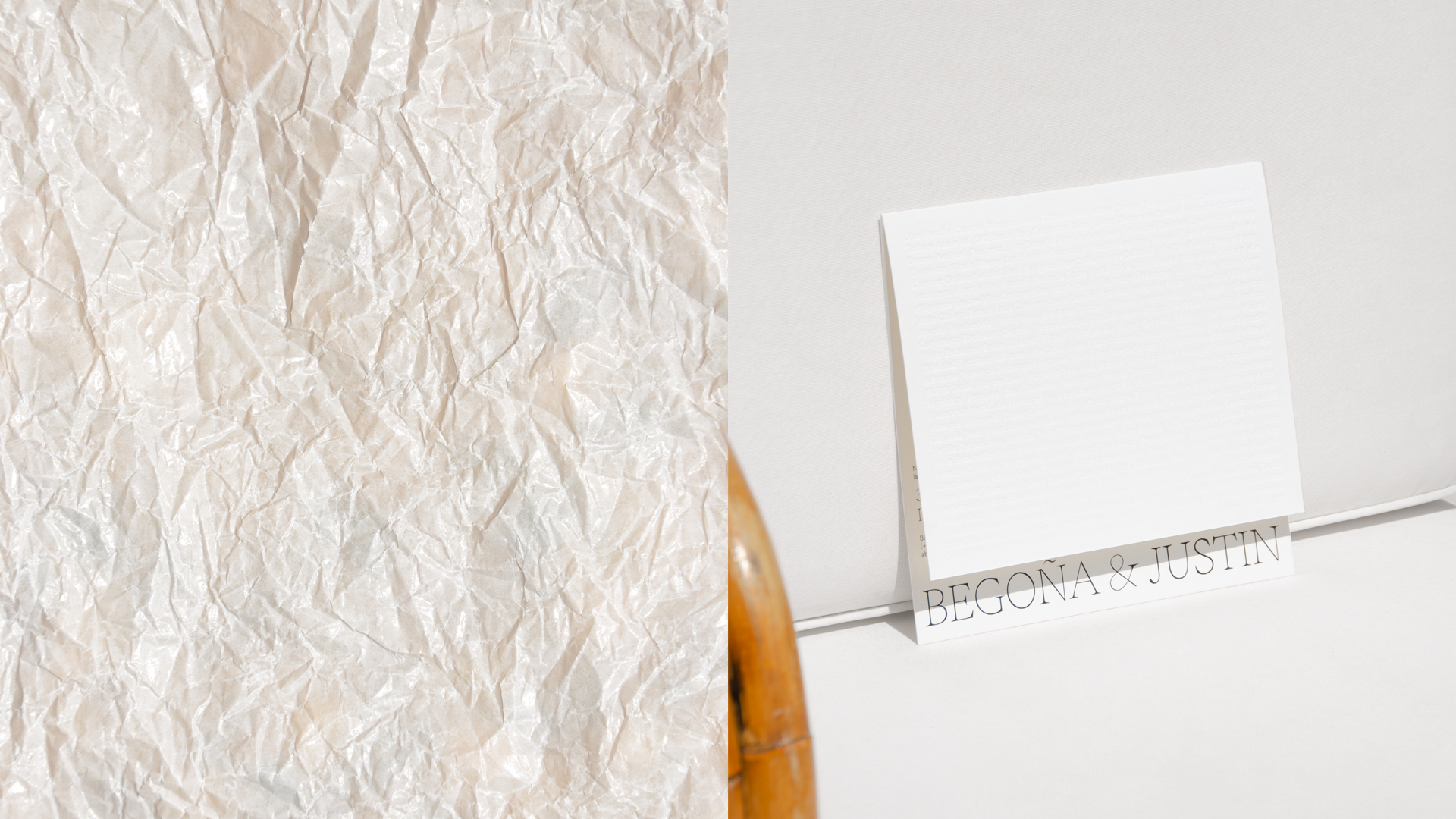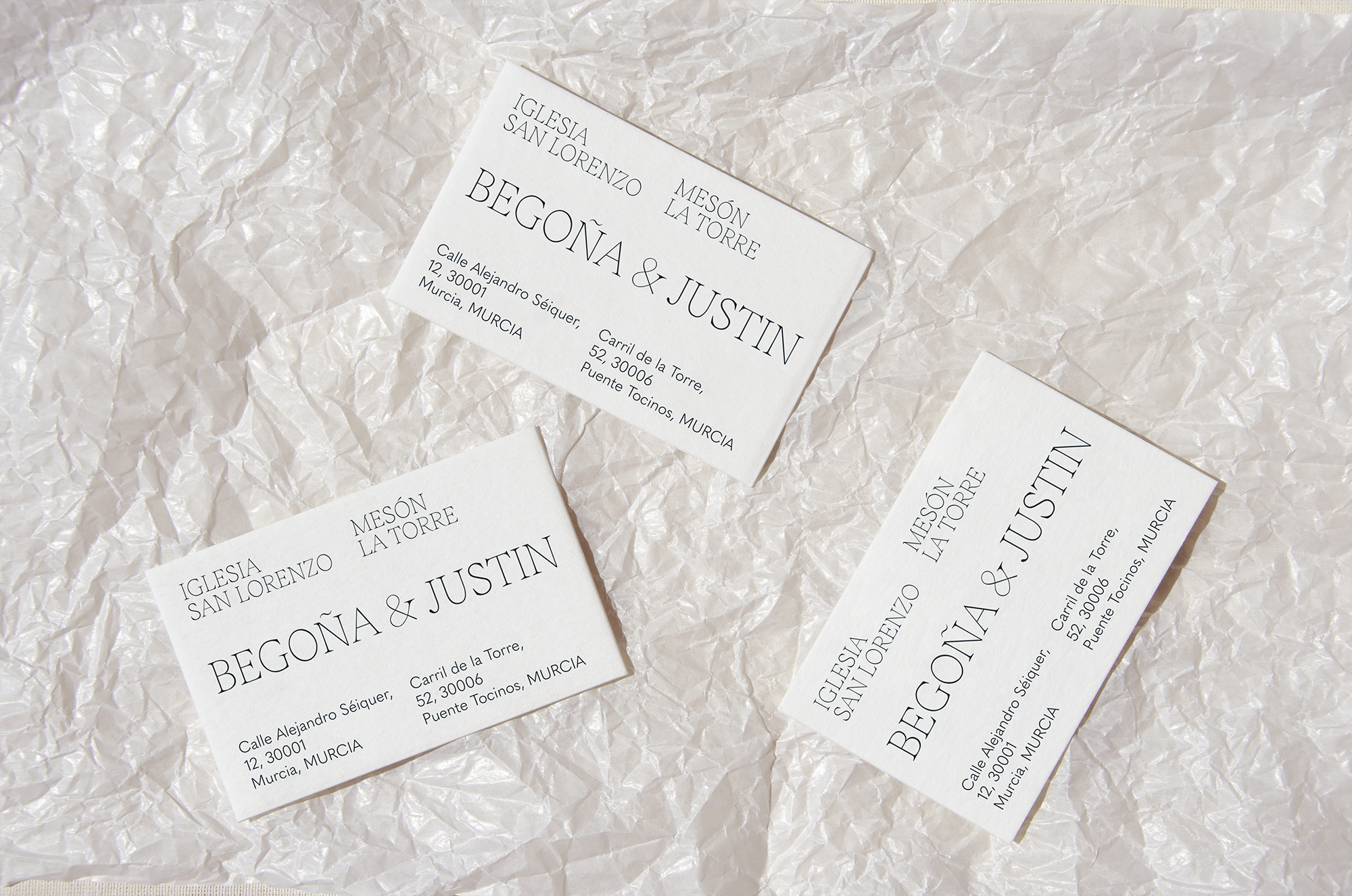 Although a picture may be worth a thousand words, in this case there was no better way to symbolize Begoña and Justin’s relationship than through their own words. After three years of written correspondence, we decided to select the words that represent them best. Although they are the main characters, the words – which have accompanied them so much during these years – appear in the background, printed in white on a white paper. In this way the story of Begoña and Justin is proposed as a suggestion to the reader. An invitation, not only to one of the most important days of their lives, but also to get to know them more deeply.