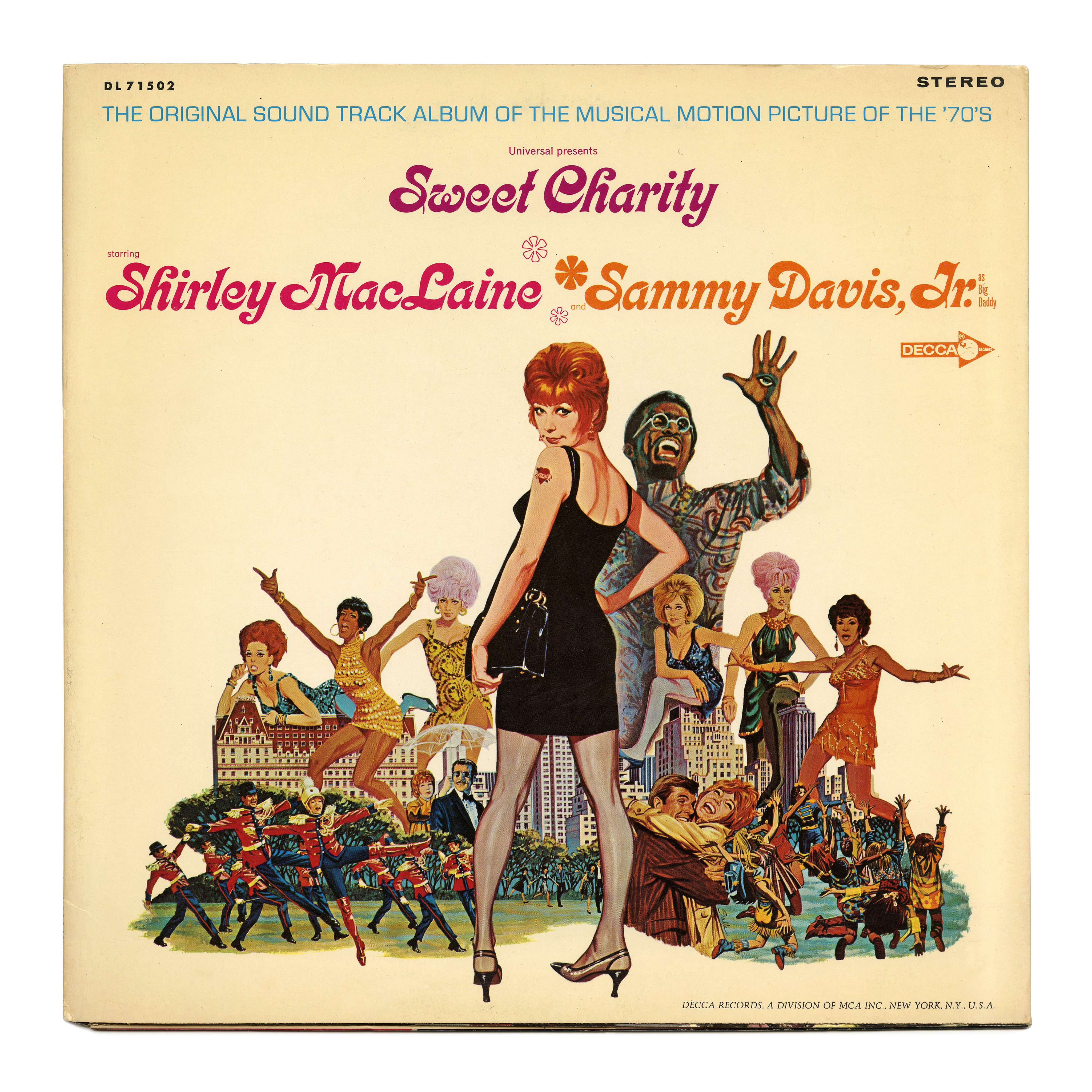 Kalligraphia in purple, pink, and orange for the cover of Sweet Charity, “the original sound track album of the musical motion picture of the ’70’s […] starring Shirley MacLaine and Sammy Davis, Jr. as Big Daddy”, released by Decca Records in 1969. The illustration is credited to Robert McGinnis (although the signature reads “Salle” or similar). The blue line at the top is set in caps from Eurostile. “Universal presents” is in News Gothic and “Stereo” in Venus Extended. The italic caps at the bottom right are from an unidentified typeface.