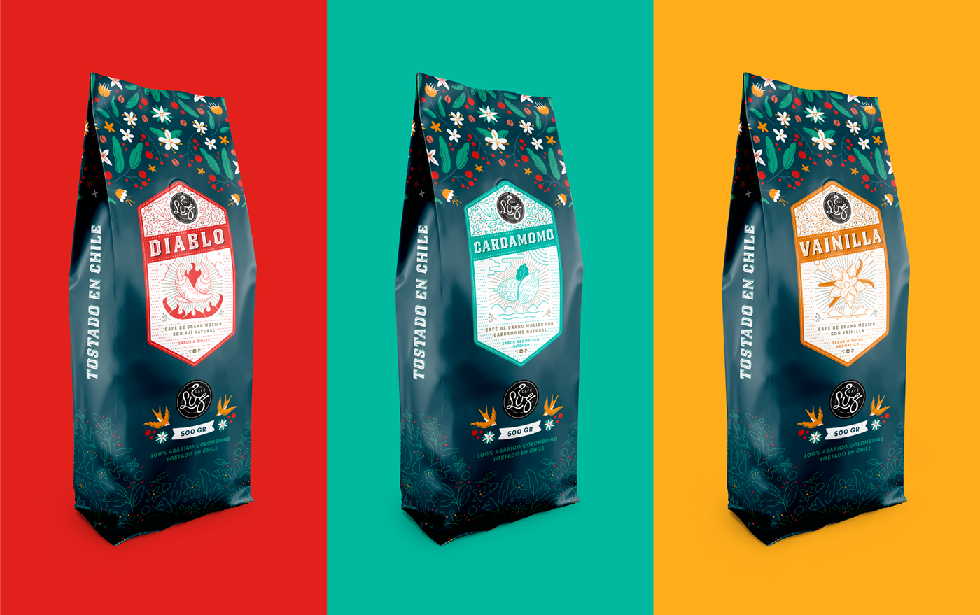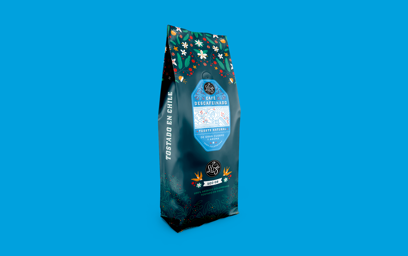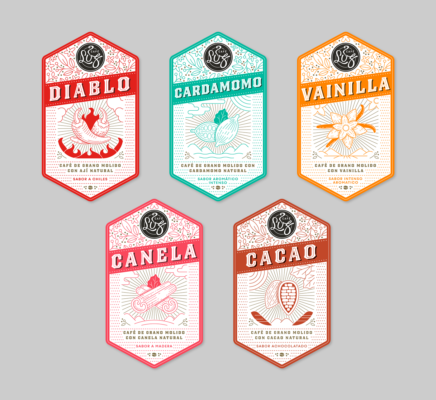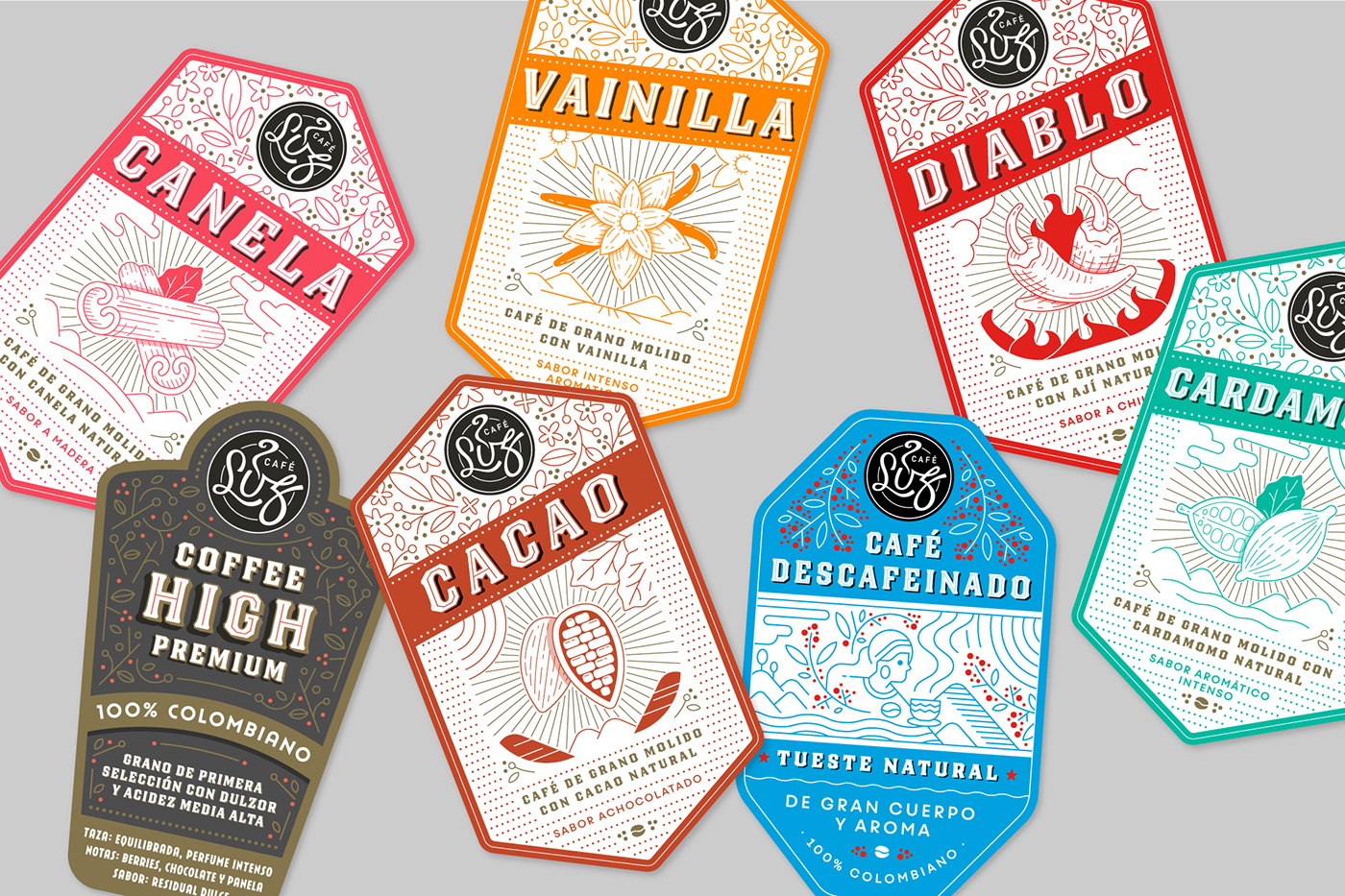 Label and packaging design for Chilean coffee brand Café Luz. The brand imports its coffee directly from Colombia to Chile, where it’s carefully toasted by hand. This process leads to an outstanding flavor and a properly crafted product. The design was meant to be a colorful expression of Colombian’s coffee beans, flowers, and landscapes. The system consists of one unique packaging plus several labels for each of the different styles of coffee: exotic, decaf and premium.