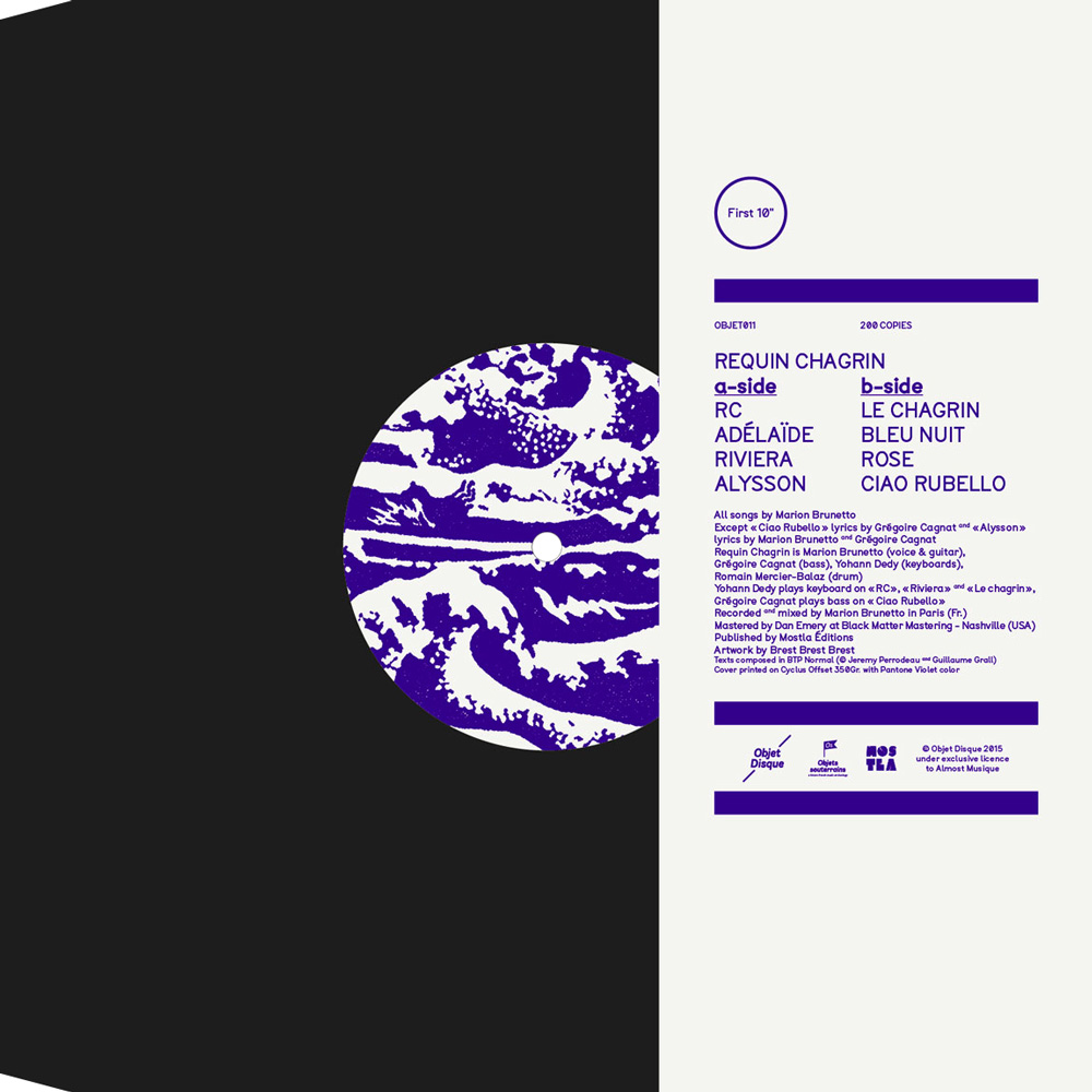 Cover designed by Rémy Poncet / Brest Brest Brest for the self-titled first album by Requin Chagrin, released by theFrench label Objet Disque, with the font BTP by A is for. The cover of the 10″ vinyl is printed with one color, Pantone Violet, on 340g/m² white cardboard.