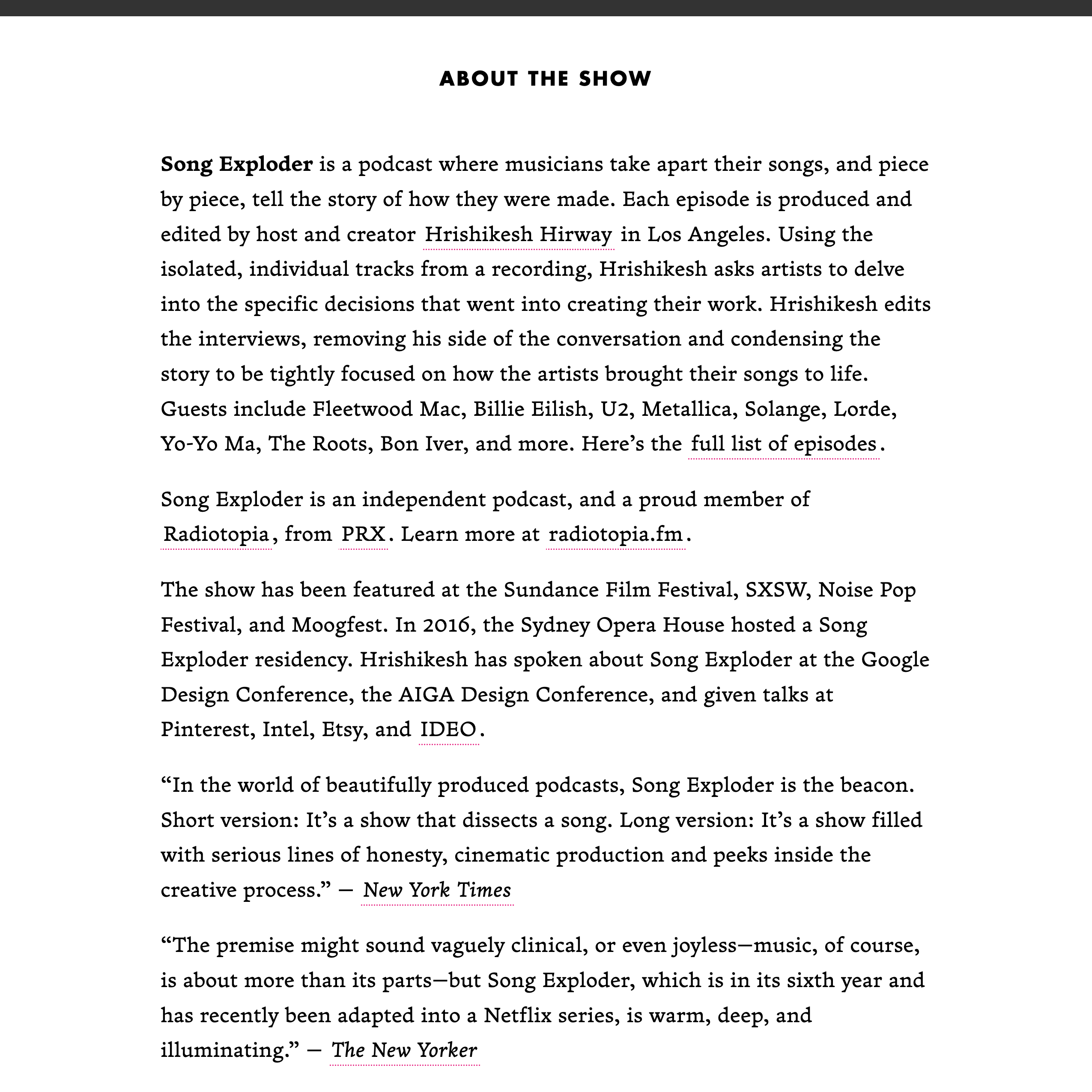 Song Exploder website Contributed by Hrishikesh Hirway on Aug 20th, 2021. Artwork published in circa 2021. Source: songexploder.net License: All Rights Reserved. Song Exploder is a podcast and Netflix series where musicians take apart their songs, and piece by piece, tell the story of how they were made. Each episode is produced and edited by host and creator Hrishikesh Hirway in Los Angeles. The website typography combines Futura (Adobe) and Fern Micro (DJR). Illustrations by Carlos Lerma. Source: songexploder.net License: All Rights Reserved. Source: songexploder.net License: All Rights Reserved. Source: songexploder.net License: All Rights Reserved. Source: songexploder.net License: All Rights Reserved. Typefaces More about FernGet FernMore about FuturaGet Futura Formats Web (5619) Topics Music (6356) Designers/Agencies Hrishikesh Hirway (1) Tagged withmusic history (66)podcasting (79)websites (3562)typeface combinations (3943)menus (UI) (564)lists (306)all caps (7594)footnotes (319)portraits (131)illustration (1584) Artwork location United States (9910) Los Angeles (563) In SetsFont of the Month Club (Florian Hardwig) (165) Post a comment Name Email – will not be published Website Your response Submit Comment More Fern in use The Front Lines of the War album art2021Gor JihanianContributed by Will Klingenmeier A Land Once Magic role-playing game2025Luna P.Contributed by Luna P Birdmans Chicken Shack2019The Schubert StudioContributed by 205TF Sponsor More in Music Soul of A Nation album art2017Adrian SelfDandy BoreholeContributed by Florian Hardwig The Who – My Generation album art1965unknownPhoto(s) by Klaus Hiltscher on Flickr. Eric Framond – Palpitations album art1974Alain PonsContributed by Florian Hardwig Walter Schneiderhan & Erich Berg – Beethoven’s Kreutzer Sonata album artc. 1952Curt John WittPhoto(s) by Bart Solenthaler on Flickr. More in Web Rijksmuseum, AmsterdamContributed by Frank E. Blokland The Center of Gravity website2025Ana CarvalhoContributed by Ana Carvalho Manitu Liveclub website2024Brian PfitzmannOliver OpaterniContributed by Angel Pfitzmann Caffè Borbonec. 2019unknownContributed by Laurence Penney More Fonts In Use Det Kgl. Bibliotek identityc. 2018e-TypesContributed by Playtype Foundry Staff Pick DN divadelní noviny2012DesigniqContributed by TypeTogether Staff Pick That’s all folks!2018TraphicContributed by Emtype Foundry Staff Pick De la violence coloniale dans l’espace public2021Milène MahéraultAkakir StudioContributed by Jérémy Landes (Studio Triple) Staff Pick