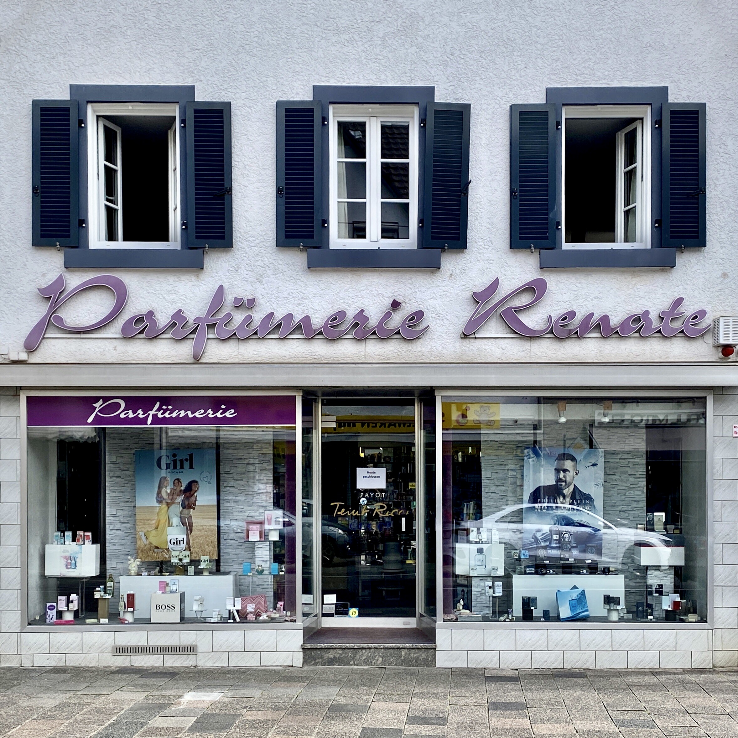Parfümerie Renate is a perfumery on Heidelberger Landstraße in Darmstadt-Eberstadt, Germany. It was established on this location in 1968. Chances are that the sign dates from that year. The script typeface used for the sign is Slogan, first cast by the Ludwig & Mayer foundry in nearby Frankfurt/Main in 1958.