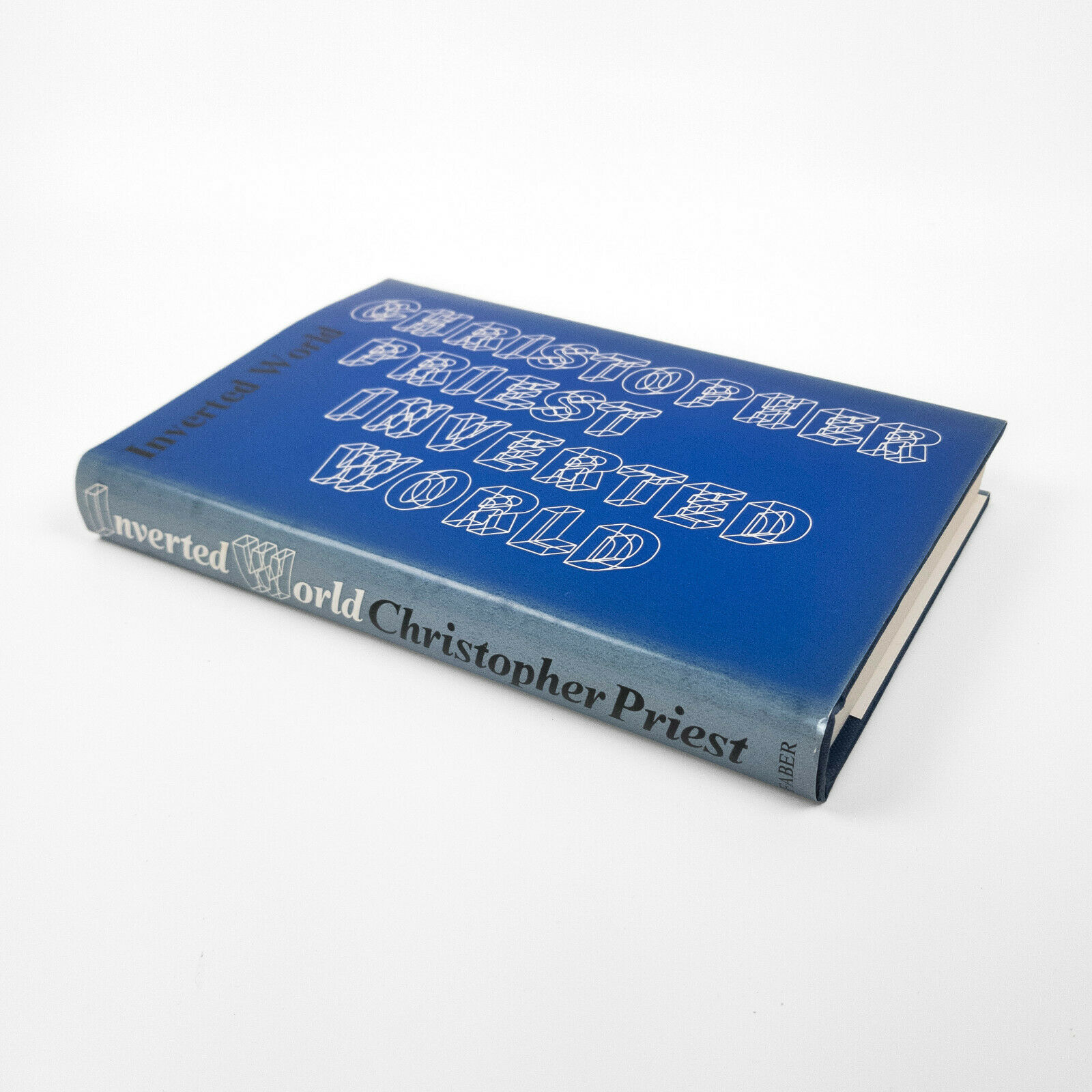 Faber & Faber’s first edition of Christopher Priest’s science fiction novel Inverted World has a blue dust jacket with the author’s name and title typeset running sideways in Letraset’s Bombere in white, filling almost the whole front. On the front of the jacket the title also appears set in the top left with the usual horizontal baseline in Times New Roman Bold; the readability of Times has been compromised by printing in black-on-blue. The back jacket has exactly the same design, just with smaller type and without the black Times.