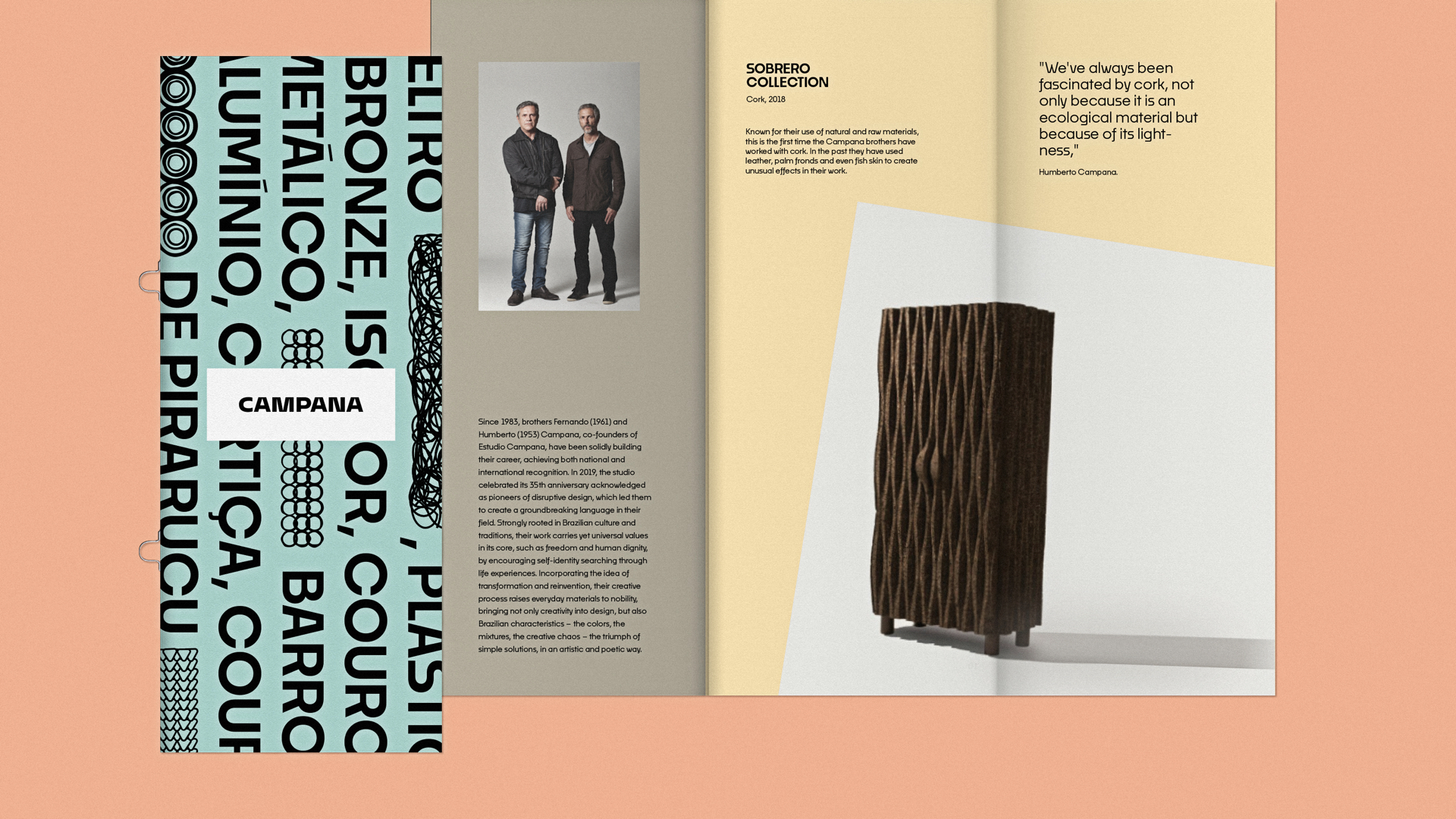 In 1984, Brazilian designers Humberto and Fernando Campana co-founded Estudio Campana. For over 35 years, the Campana Brothers have sought inspiration in the universe of materials and objects that are most familiar to Brazilians, in order to create, provoke, and to test the limits of the field of design, in creative pursuits that reveal and make the invisible around us inevitable. At this special moment in their career, the brothers invited Alexandria and Pharus Design to rethink the purpose and meaning of the Campana brand, from both a strategic and visual point of view. The aim was to develop a deep understanding of the project about the various natures of the way they introduce themselves to the world. Pharus chose typeface Noka by Brazilian foundry Blackletra because its technical approach contrasts well with Campana Brothers’ organic works.