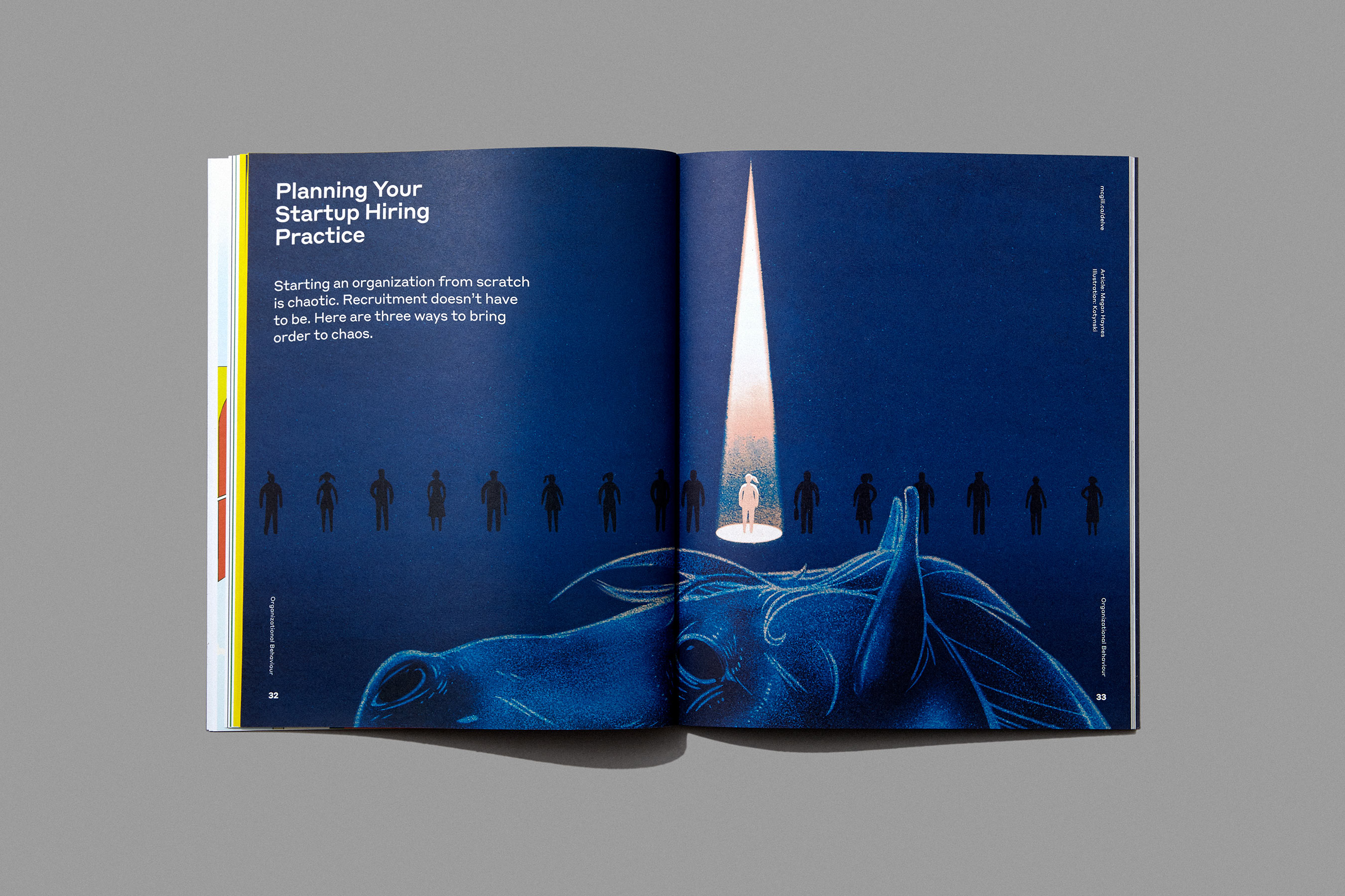 The text typeface is the university’s custom McGill Sans (Coppers and Brasses, 2019). It’s supported by Styrene A (Commercial Type), which is used for headlines, the table of contents, credits, running titles, and more.