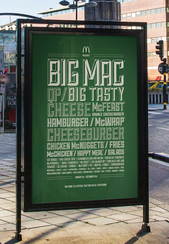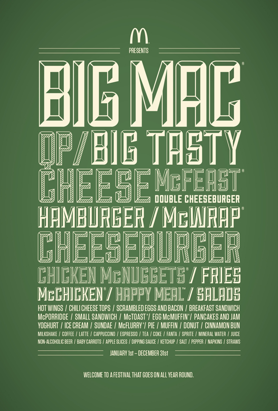 The ad is the work of DDB Stockholm. It makes the menu items the stars (and of course Big Mac the headline act). Unusually for this kind of client, it is purely typographic with no product shots and no distinctive McDonald’s yellow and red colour scheme.