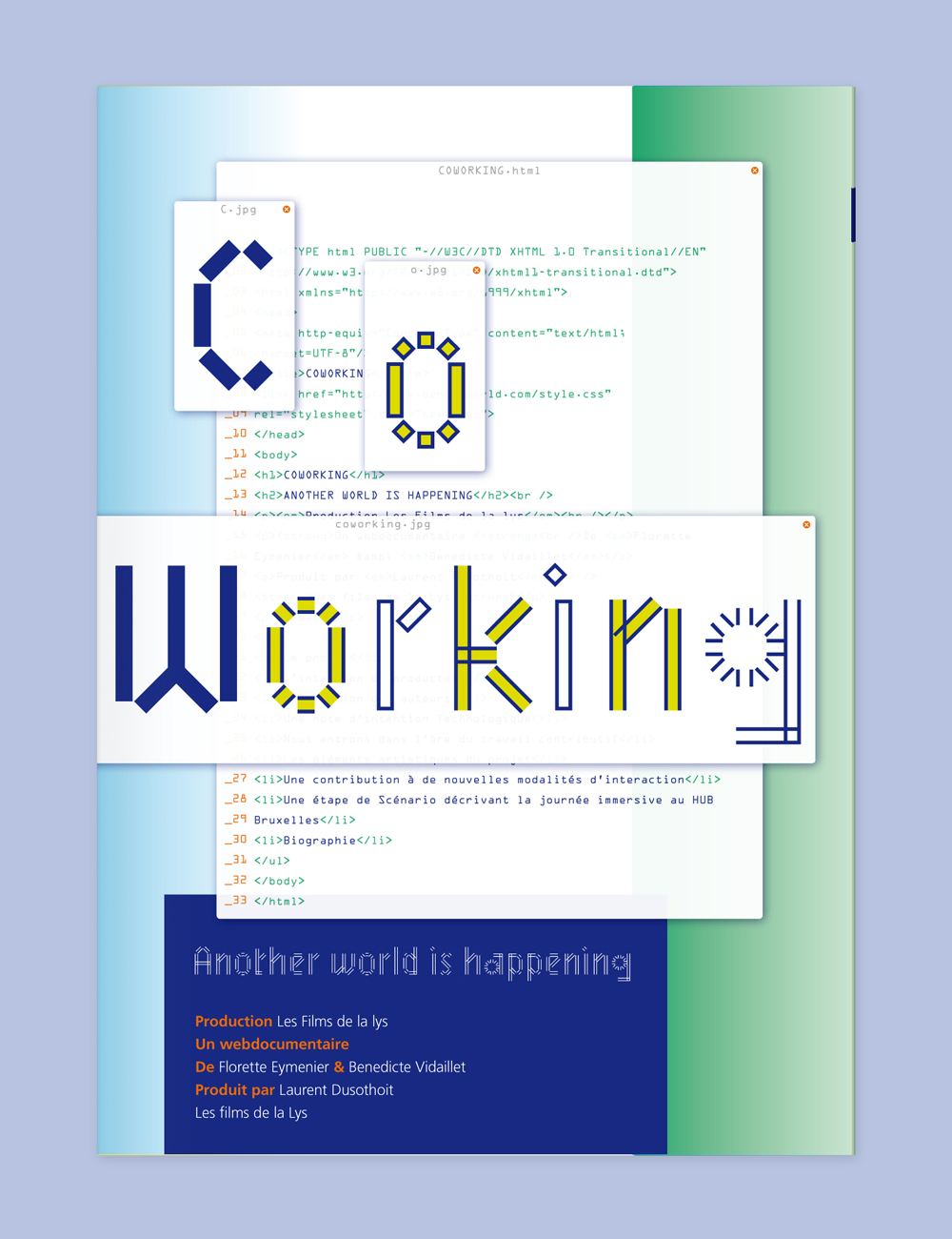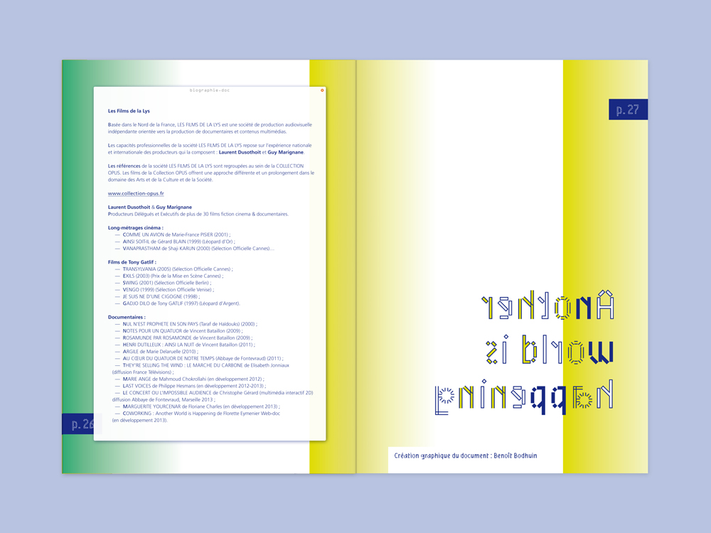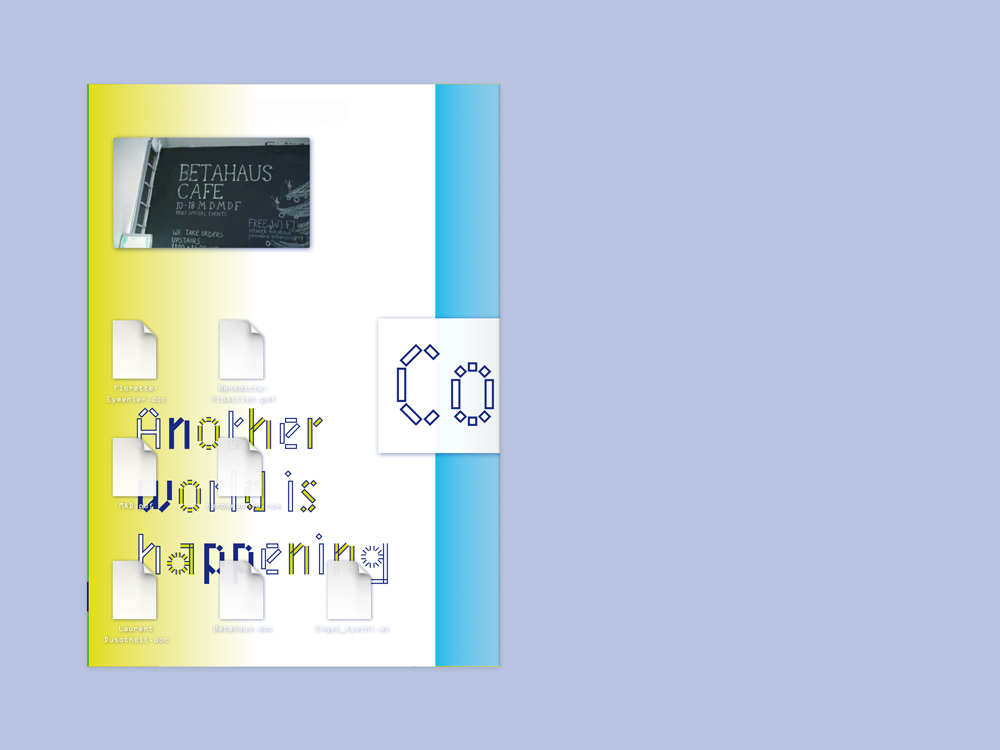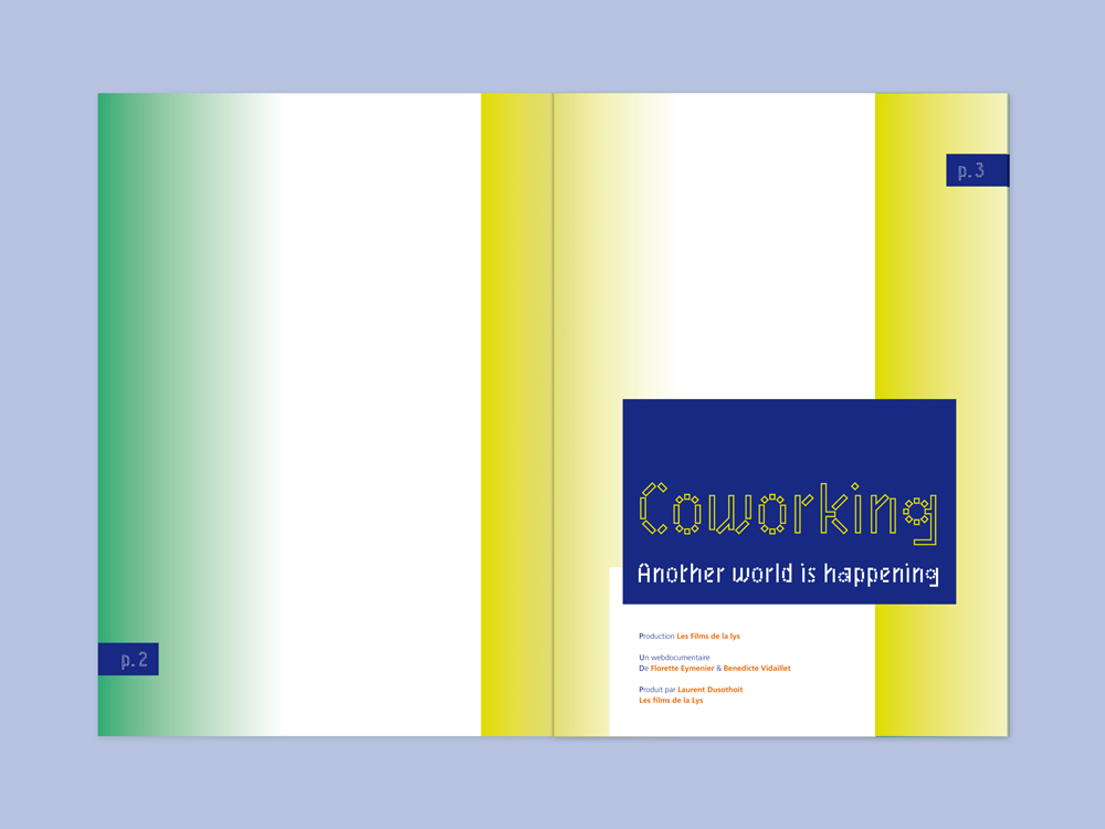 Coworking. Another world is happening Contributed by Benoît Bodhuin on Jul 11th, 2013. Artwork published in 2013. Source: www.bb-bureau.fr Benoît Bodhuin. License: All Rights Reserved. A booklet to present the web documentary by Florette Eymenier. Design: Benoît Bodhuin Source: www.bb-bureau.fr Benoît Bodhuin. License: All Rights Reserved. Source: www.bb-bureau.fr Benoît Bodhuin. License: All Rights Reserved. Source: www.bb-bureau.fr Benoît Bodhuin. License: All Rights Reserved. Source: www.bb-bureau.fr Benoît Bodhuin. License: All Rights Reserved. Source: www.bb-bureau.fr Benoît Bodhuin. License: All Rights Reserved. Typefaces More about MineralGet MineralMore about FrutigerGet FrutigerMore about OCR-AGet OCR-A Formats Booklets/Pamphlets (2377) Topics Film/TV (2008) Designers/Agencies Benoît Bodhuin (13) Tagged withdocumentaries (140)coworking (18)workspace (13)uses by the typeface’s designer (1247)pre-release uses (693)chromatic (756)alternating glyph colors (291)code (36)layers (102)booklets (555)French (language) (2494)mirrored type (135) Artwork location France (2799) Lille (26) In Sets Post a comment Name Email – will not be published Website Your response Submit Comment More Mineral in use Otherly Space / Knowledge 2018Everyday PracticeContributed by Benoît Bodhuin Editorial Lab #1201733ptContributed by Benoît Bodhuin National Mining Museum (RISD student project)2021Minjun ChoiContributed by Benoît Bodhuin Sponsor More in Film/TV Deep State2018MMMultiplyFOX UKContributed by Gareth Hague Staff Pick “FLOOD” TV news graphic1980Ira RappaportPhoto(s) by Stephen Coles on Flickr. Airport 1975 and Airport ’771974Contributed by Stephen Coles Die Leinwand beschreiben2023Studio Marlon IlgContributed by HAL Typefaces More in Booklets/Pamphlets Slepalyzed2017Lisa RibbersContributed by Florian Hardwig M79 Otto Resource pamphlets2022Martin Major OfficeContributed by HAL Typefaces Wanderer zwischen den Weltenc. 2024Studio HanLiContributed by HAL Typefaces Staff Pick Mit kühlem Kopf gegen eine heisse Welt2020Nadine SpenglerContributed by Nouvelle Noire More Fonts In Use Club des D.A #522021Charlie Le MaignanBettina ComteLucas DominguesContributed by Jérémy Landes (Studio Triple) Staff Pick SmartNews2014Craig ModAkinori MachinoKen SuzukiContributed by Stephen Coles Staff Pick Gute Aussichten. New German Photography 2013/142014PixelgartenCatrin AltenbrandtKai BergmannContributed by Florian Hardwig Staff Pick Mac & His Problem by Enrique Vila-Matas2019Matt BroughtonContributed by D Jones Staff Pick