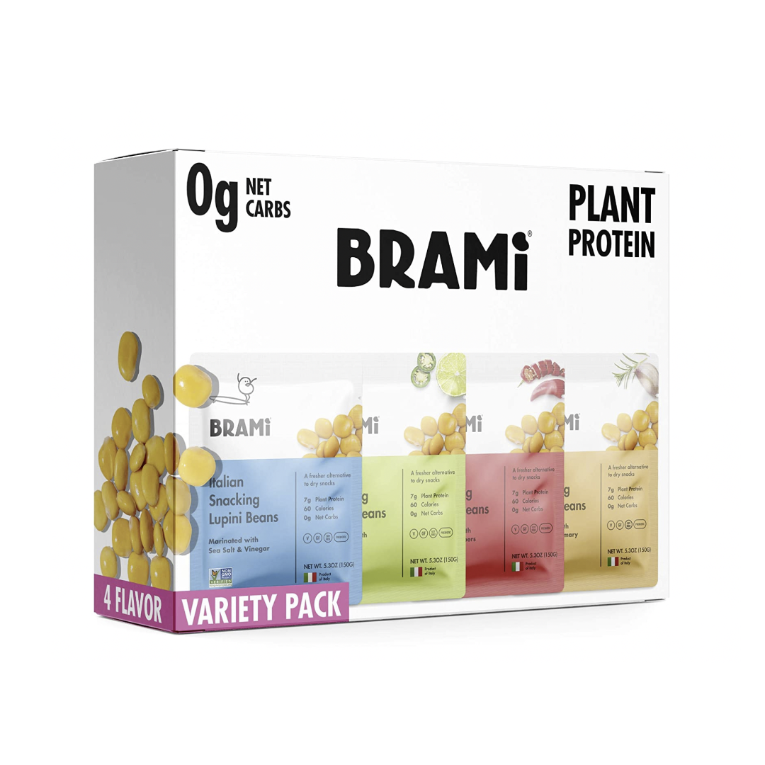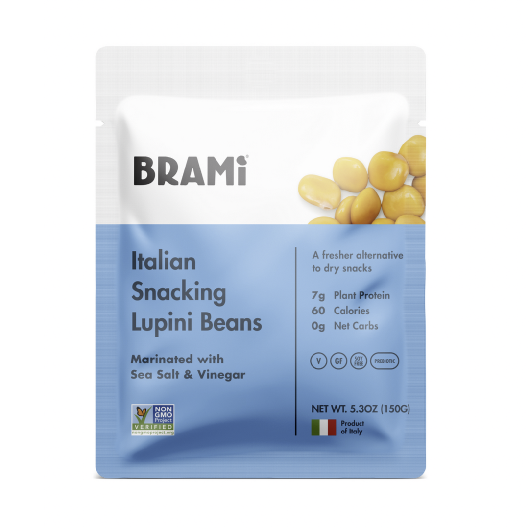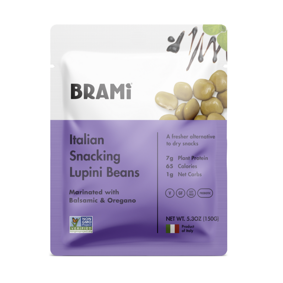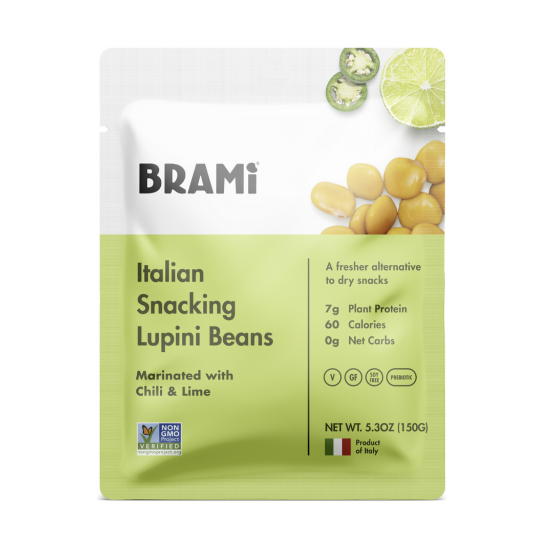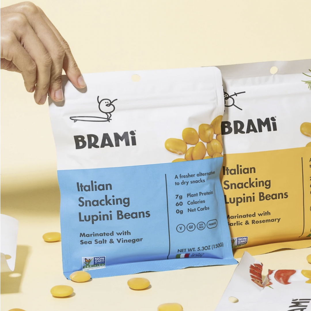 Brami – named “the Italian verb Bramare, which means ‘to passionately desire’” is a brand of snack food made with lupini beans. Their packaging was recently redesigned by Joshua Kaplan. The logo is based on Kurversbrug, and Futura is used for all information.
