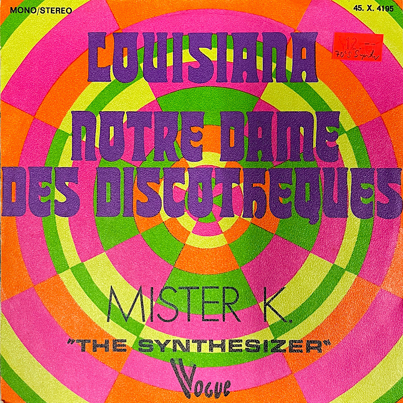 Mister K. “The Synthesizer” a.k.a. Mat Camison (b. 1941) “may be considered a precursor in the use of electronic synthesizers, progressive pop-rock and disco music.” “Louisiana” is an early single of his, released in 1972 on Vogue Records. Sleeve designer Thérèse Ruyant didn’t skimp on the colors, and combined Tip-Top, Futura Light, and Eurostile, all in all caps. See also her equally cheerful cover for Les Korrigans from 1974.