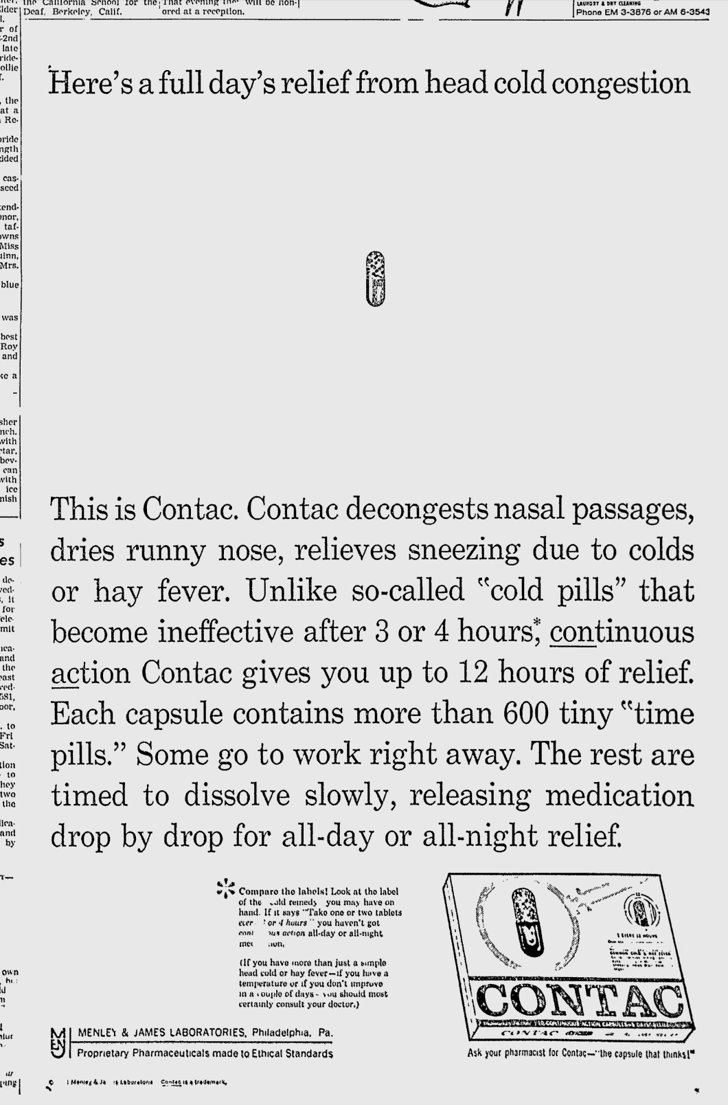Contac ad: “Here’s a full day’s relief…” Contributed by Stephen Coles on Jul 15th, 2013. Artwork published in 1961. Source: news.google.com License: All Rights Reserved. Found in The Deseret News, Nov. 27, 1961. Typefaces More about Century SchoolbookGet Century Schoolbook Formats Advertising (2120) Topics Health/Fitness (884) Tagged withContac (1)pharmaceuticals (44)medicine (57)newspaper ads (76) Artwork location United States (9928) In SetsAds of the “Mad Men” Era (Stephen Coles) (75)Moodboard (R A) (12) Post a comment Name Email – will not be published Website Your response Submit Comment More Century Schoolbook in use Nitto ATP Finals poster booth2023Dum Dum StudioChristina GarciaContributed by Mario Julian Gutierrez Jim Beam ad: “Generation gap? Jim Beam never heard of it.” (1972)1972Contributed by Stephen Coles Mansur Gavriel2022Ania et LucieContributed by Abyme Sponsor More in Health/Fitness Bend & Brew2018Fergus Brownstudio42Contributed by Fergus Brown Michel Apelbaum Yoga2020Thiago BalassianoContributed by thiago balassiano Receitas Práticas e Nutritivas2025ALECERafael FerreiraContributed by Rafael Ferreira Kleenex ad: “Bless you!”c. 1990unknownContributed by Stephen Coles More in Advertising Grido Helados2016unknownContributed by Julia Martinez Diana The Cherry People – “Gotta Get Back (To The Good Life)” / “I’m The One Who Loves You” single cover1968unknownContributed by Florian Hardwig Staff Pick Werbe-Gestaltung Kurt Schwittersc. 1930Kurt SchwittersPhoto(s) by Frank Grießhammer on Flickr. Nina Chuba tour posters 20212020Julian GrönbergSimbayu StudiosContributed by Julian Grönberg More Fonts In Use The Myth of Memory by Offshore2022OffshoreContributed by WrittenShape Type Foundry Staff Pick Ticketmaster Ticket Redesign Proposal2013Matthew LewContributed by Stephen Coles Staff Pick New York on ICE website2018Alex TatusianContributed by Peiran Tan Staff Pick Filming the war: the Soviets and the Holocaust (1941–1946) exhibition and catalog2015L’Atelier collectifEmmanuel LabardAlexandre EssayieContributed by Production Type Staff Pick