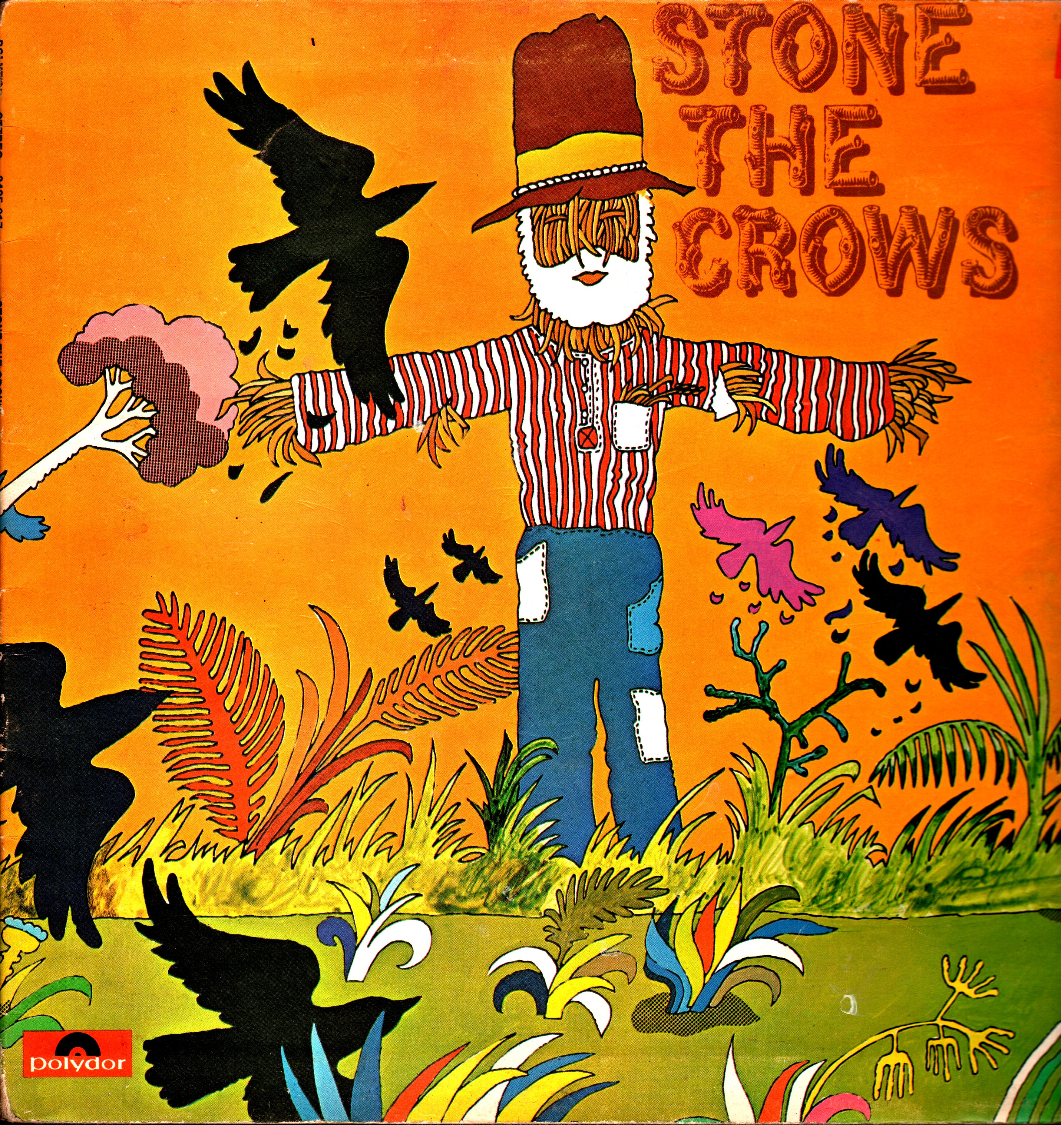 Self-titled debut album by Stone the Crows, a blues-rock band formed in Glasgow in late 1969, released with Polydor in 1970. The design is by David Juniper, who had worked on Led Zeppelin’s II album shortly before. Rustic No. 2 arguably is one of the scarecrowiest typefaces there is.