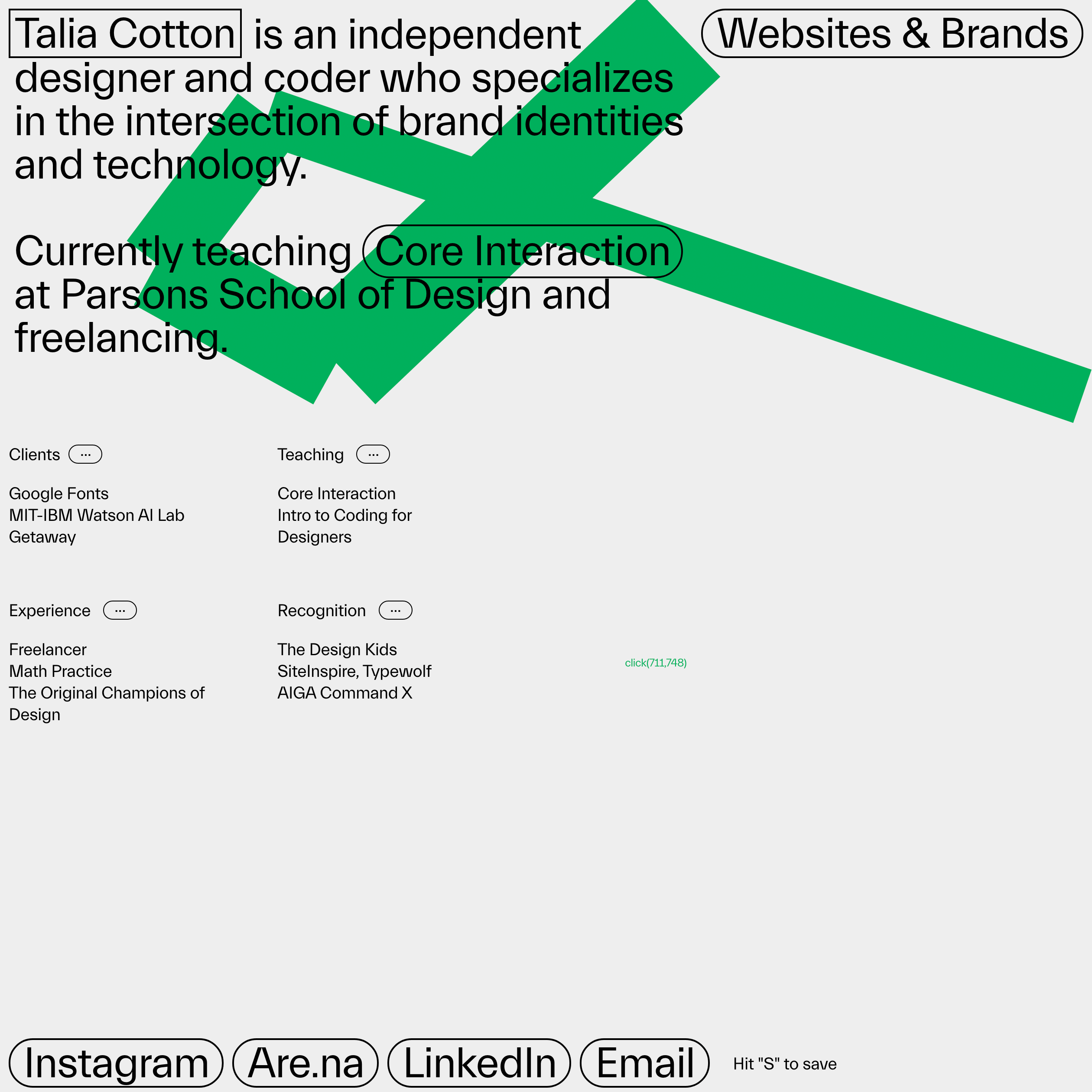 Talia Cotton is a designer and coder who specializes in the intersection of brand identities and technology. Currently teaching Core Interaction at Parsons School of Design and developing data-driven identities at Pentagram.