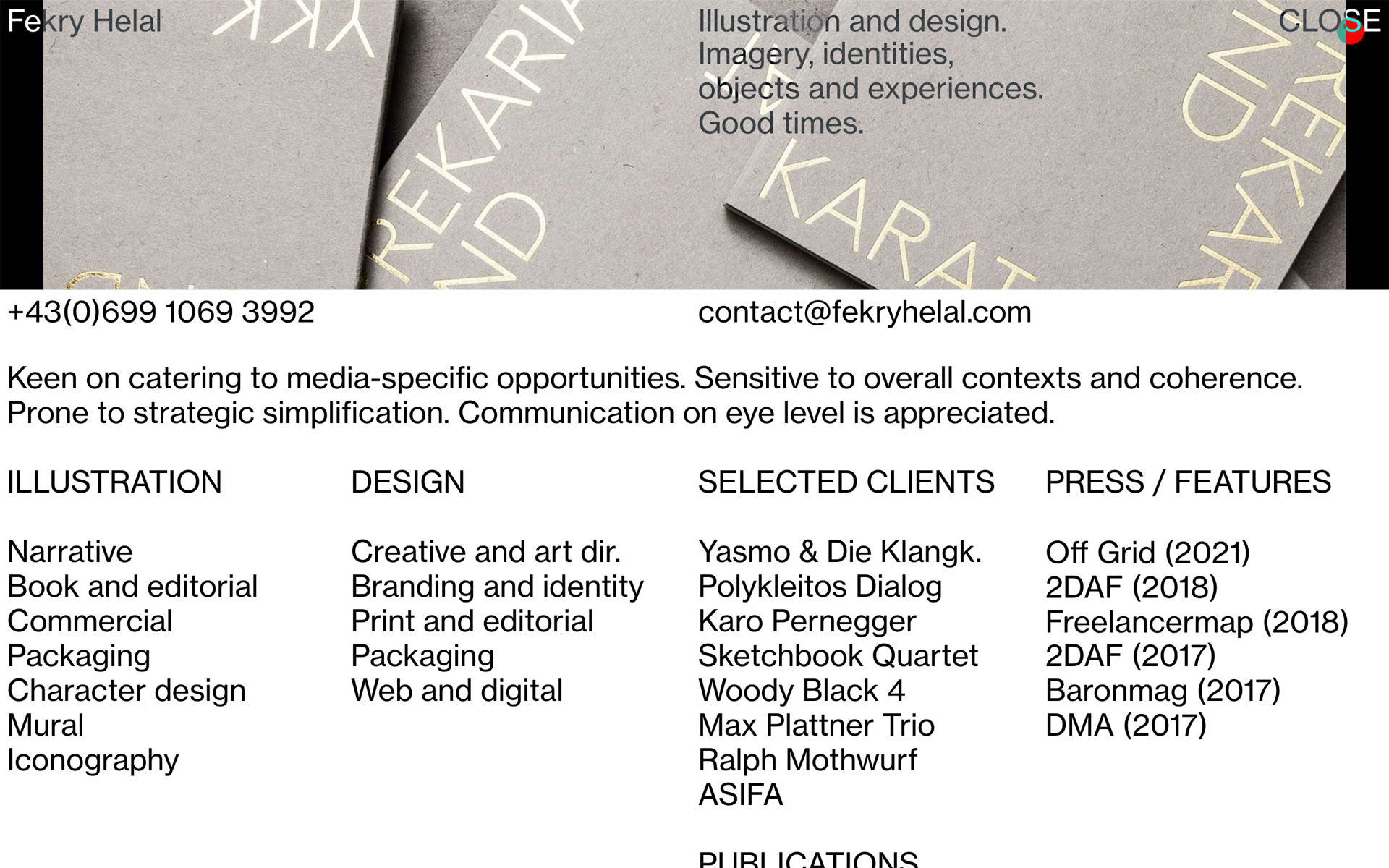 Fekry Helal website Contributed by Fekry Helal on Sep 20th, 2021. Artwork published in 2021. Source: www.fekryhelal.com Fekry Helal. License: All Rights Reserved. I’m Fekry Helal, a Vienna-based illustrator and graphic designer. For my personal website I’m using Neue Haas Grotesk in a single style (Text 55) and size. Source: www.fekryhelal.com Fekry Helal. License: All Rights Reserved. Source: www.fekryhelal.com Fekry Helal. License: All Rights Reserved. Source: www.fekryhelal.com Fekry Helal. License: All Rights Reserved. Source: www.fekryhelal.com Fekry Helal. License: All Rights Reserved. Typefaces More about Neue Haas GroteskGet Neue Haas Grotesk Formats Web (5787) Topics Graphic Design (3064) Designers/Agencies Fekry Helal (4) Tagged withportfolios (787)personal websites (266)design studios/agencies (507)illustrators (20)one typeface, one size (416) Artwork location Austria (484) Vienna (294) Post a comment Name Email – will not be published Website Your response Submit Comment More Neue Haas Grotesk in use Mosaïque magazine, no. 11, “La fabrique du silence”2025Alexandre CréquerContributed by Alexandre Créquer Staff Pick Augenblick, Festival du cinéma germanophone 2020 poster2020Mickael DardContributed by Nguyen Gobber Staff Pick Portland Protects Everyone poster2023Stxrling.StxdioContributed by Gina Sterling Sponsor More in Graphic Design Jonas Arleth personal branding2021Jonas ArlethContributed by Ivo Gabrowitsch Clip Books of Line Art, Volk (1961)1961Harry Volk Jr. Art StudioPhoto(s) by Bart Solenthaler on Flickr. INT Works website2012INT WorksWill HudsonAlex BecContributed by Stephen Coles THYPE2016Warriors StudioContributed by Benoît Bodhuin More in Web Ambush magazine editorial2020Berto HerreraContributed by Berto Herrera LIFEBLNCc. 2022unknownContributed by TypeMates Field Trip website2013Contributed by Florian Hardwig Repassc. 2025Studio SagerContributed by Anna-Sophia Pohlmann (kimera) More Fonts In Use A Universal History of Everything and Nothing by Julie Mehretu2017Luigi AmatoMousse PublishingContributed by Alessio D'Ellena Staff Pick Tailgunner arcade game1979VectorbeamCinematronicsContributed by Graham Toal Staff Pick TwelveLabs2025PentagramContributed by 205TF Staff Pick Chroniques de géo’ virale by Michel Lussault2020Bureau 205Contributed by 205TF Staff Pick
