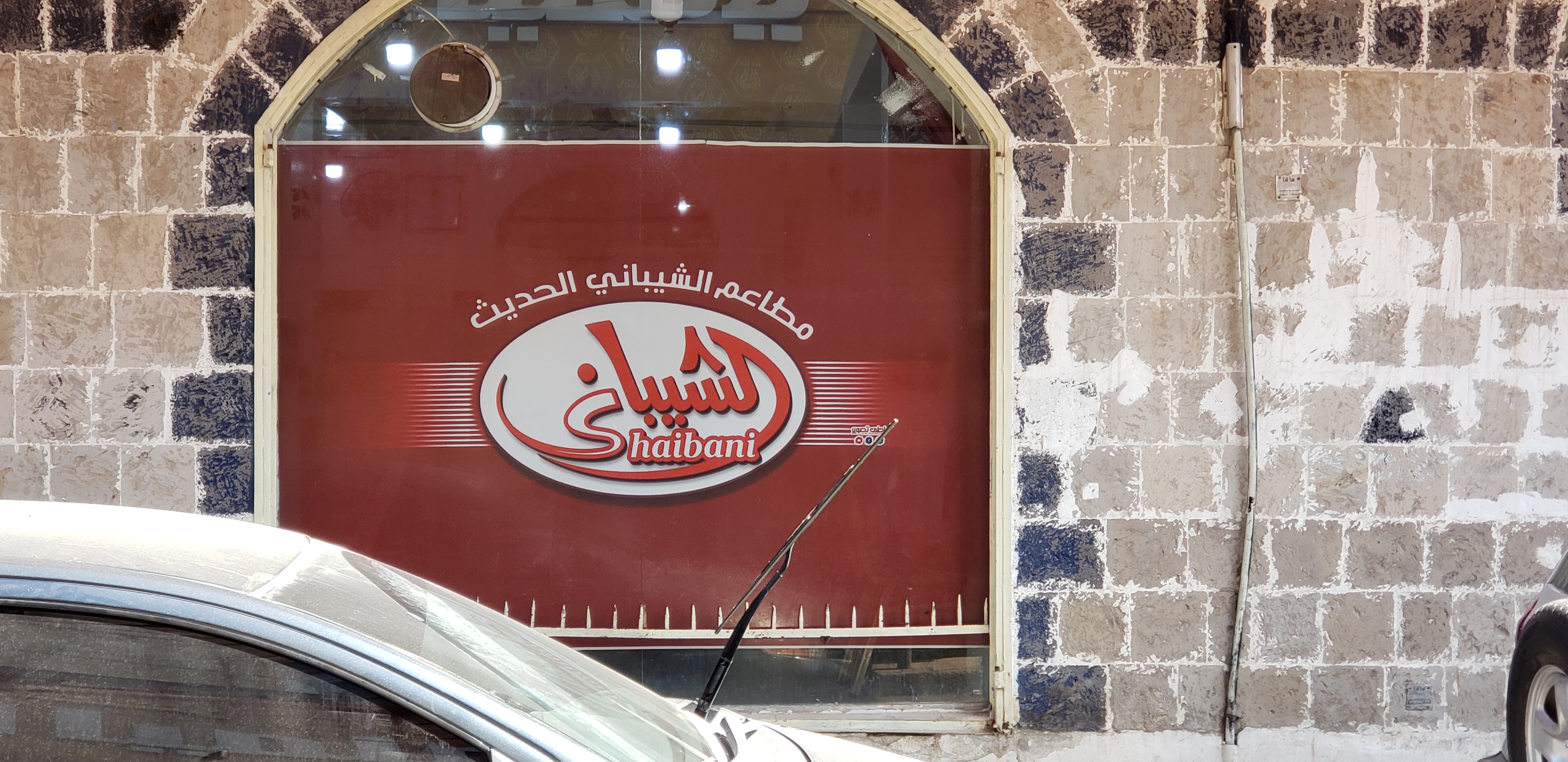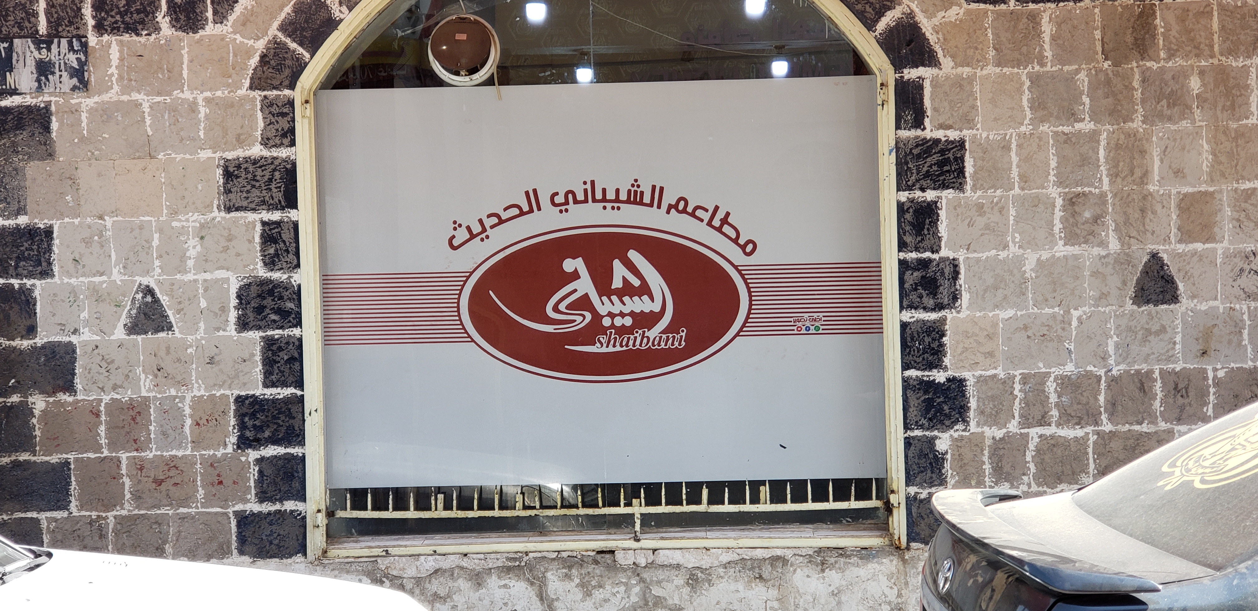 Al-Shaibani Modern Restaurants in Sanaa has a new big poster in two colors, shown attached to the glassy facades of the restaurants. The Arabic typeface set on a curve is Nasser. The Latin part in the Shaibani logo is based on the bold italic styles of Times New Roman and ITC Cheltenham, respectively.