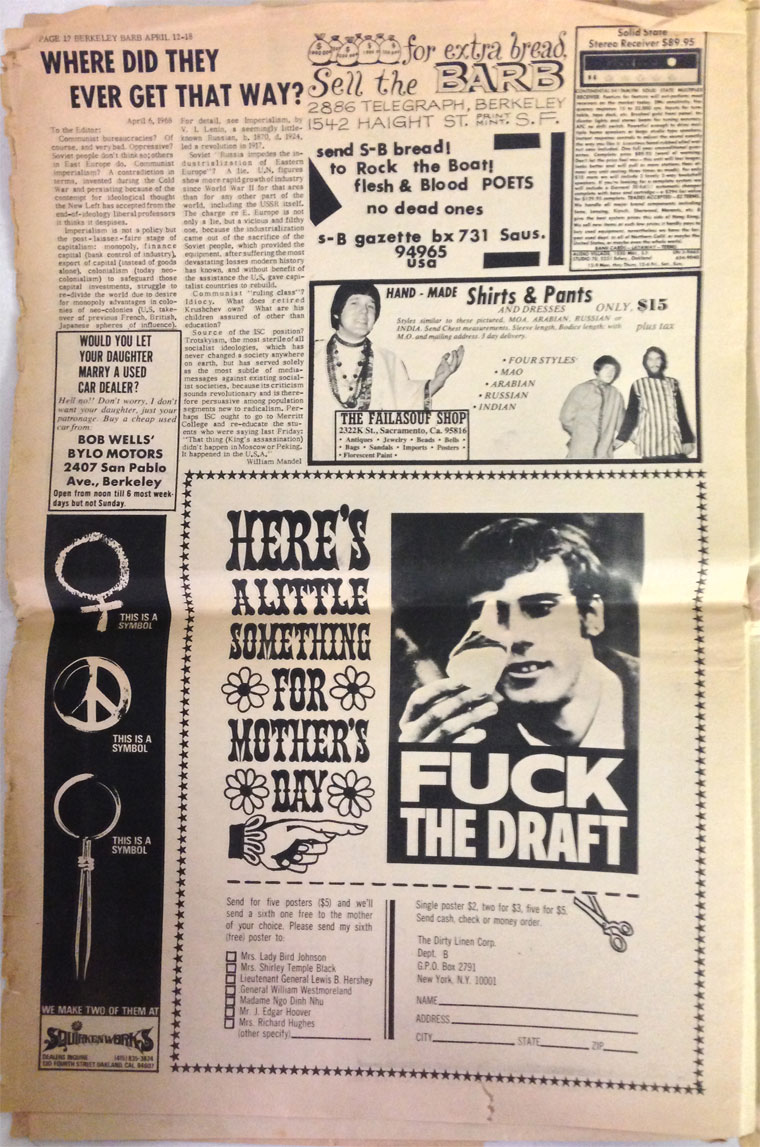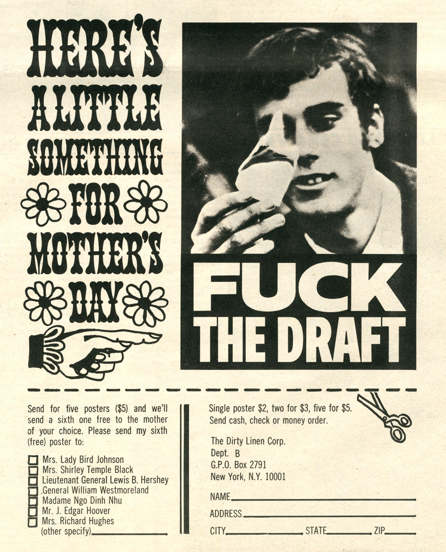 See also “‘Fuck the Draft’: The amazing story of Kiyoshi” by Jason Schafer for Dangerous Minds (2015). You can read more about Kiyoshi Kuromiya in Roger Vaughan’s article “The Defiant Voices of S.D.S.” in LIFE (Oct. 1968) and also in a 2021 article by Maina Chen.