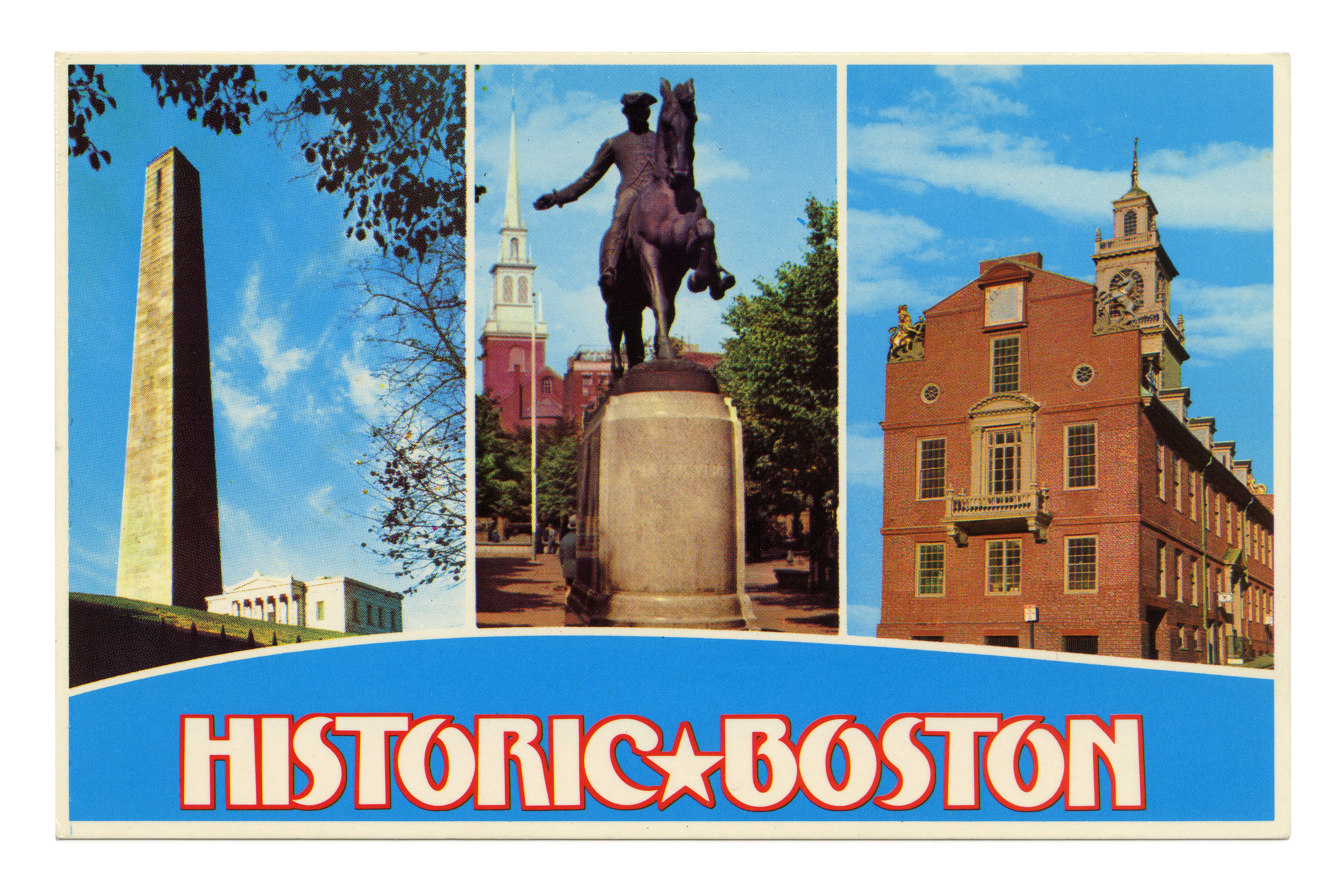 Undated postcard (mid 1970s?) published by Bromley & Company, showing historic tourist attractions in Boston, Massachusetts: the Bunker Hill Monument, the equestrian statue of Paul Revere with the Old North Church in the back, and the city’s oldest surviving building, the Old State House built in 1713.