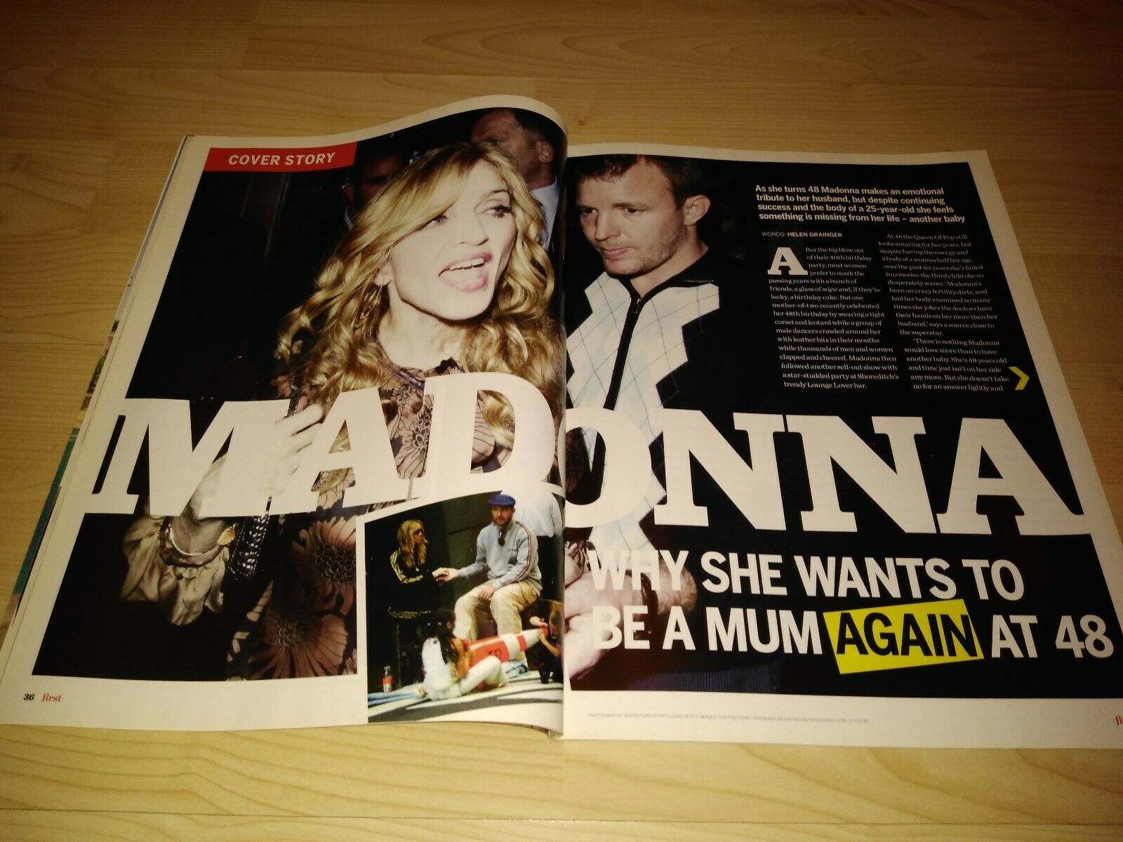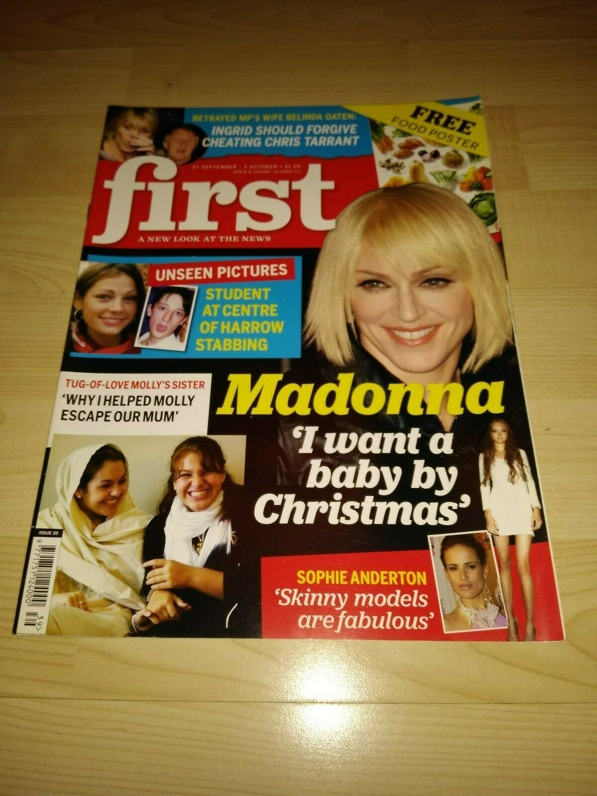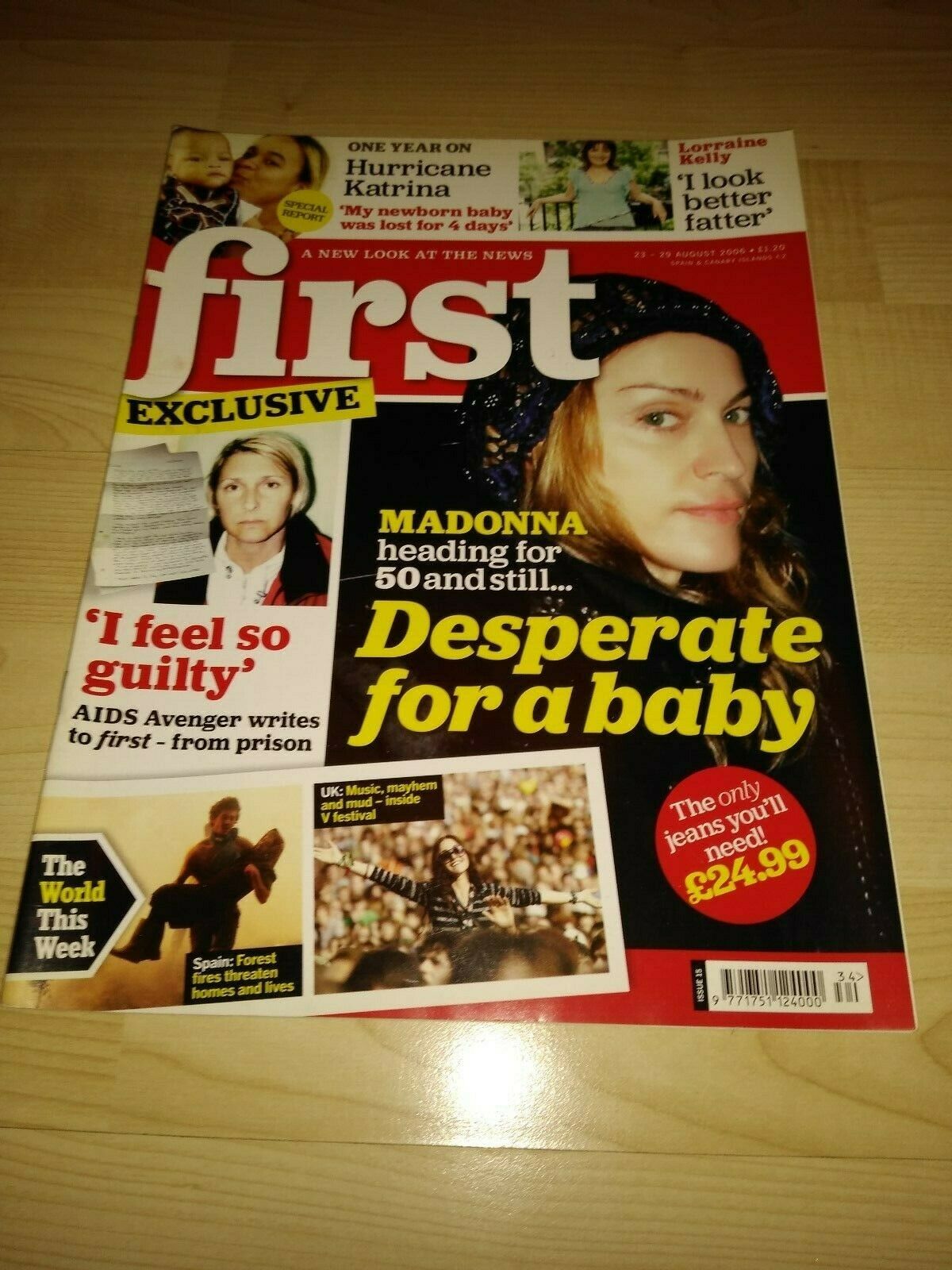 Shown here is its first use from back in 2006, for a magazine aptly named First. Michael Picón, at that time Art Director at Emap Publishing Ltd. in London, commissioned a typeface to be used in a new lifestyle/celebrity magazine “aimed at thirtysomething women, promising to bring them the real-life stories behind the headlines.” [The Guardian] First was launched in May 2006, initially as a weekly publication. In the first few months, its editors were apparently obsessed with Madonna and her alleged desire to have another baby by Christmas, as documented here.