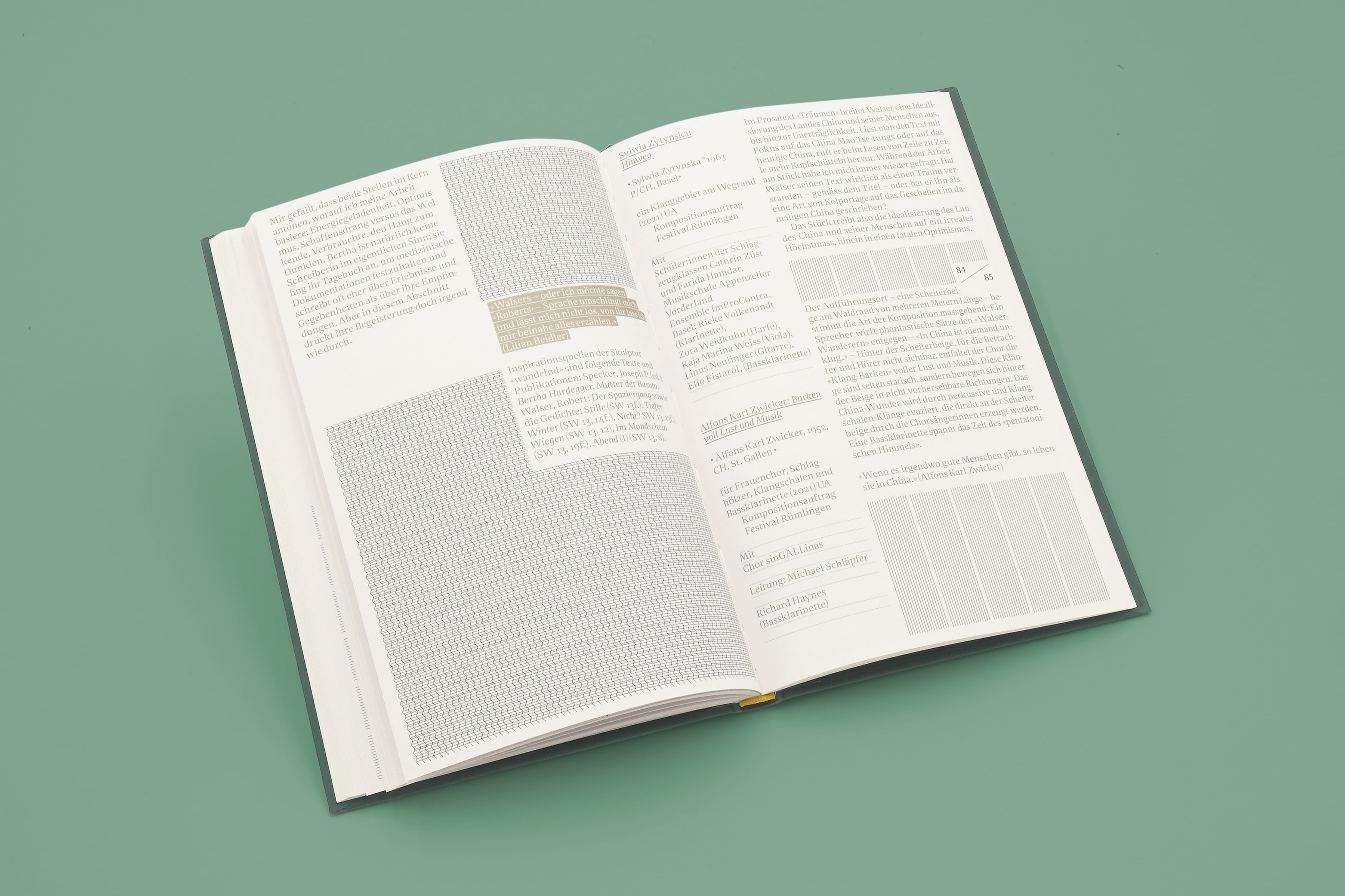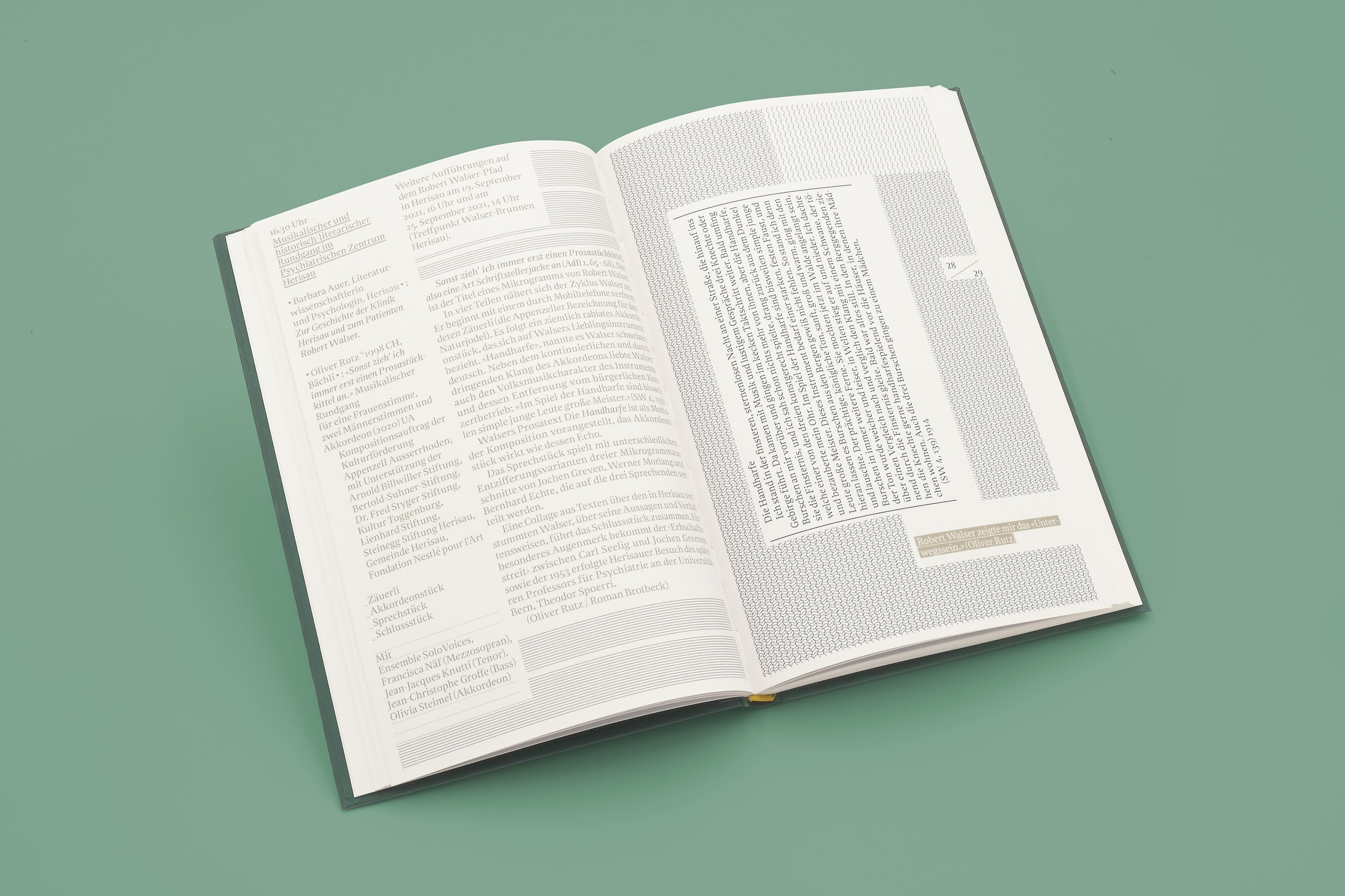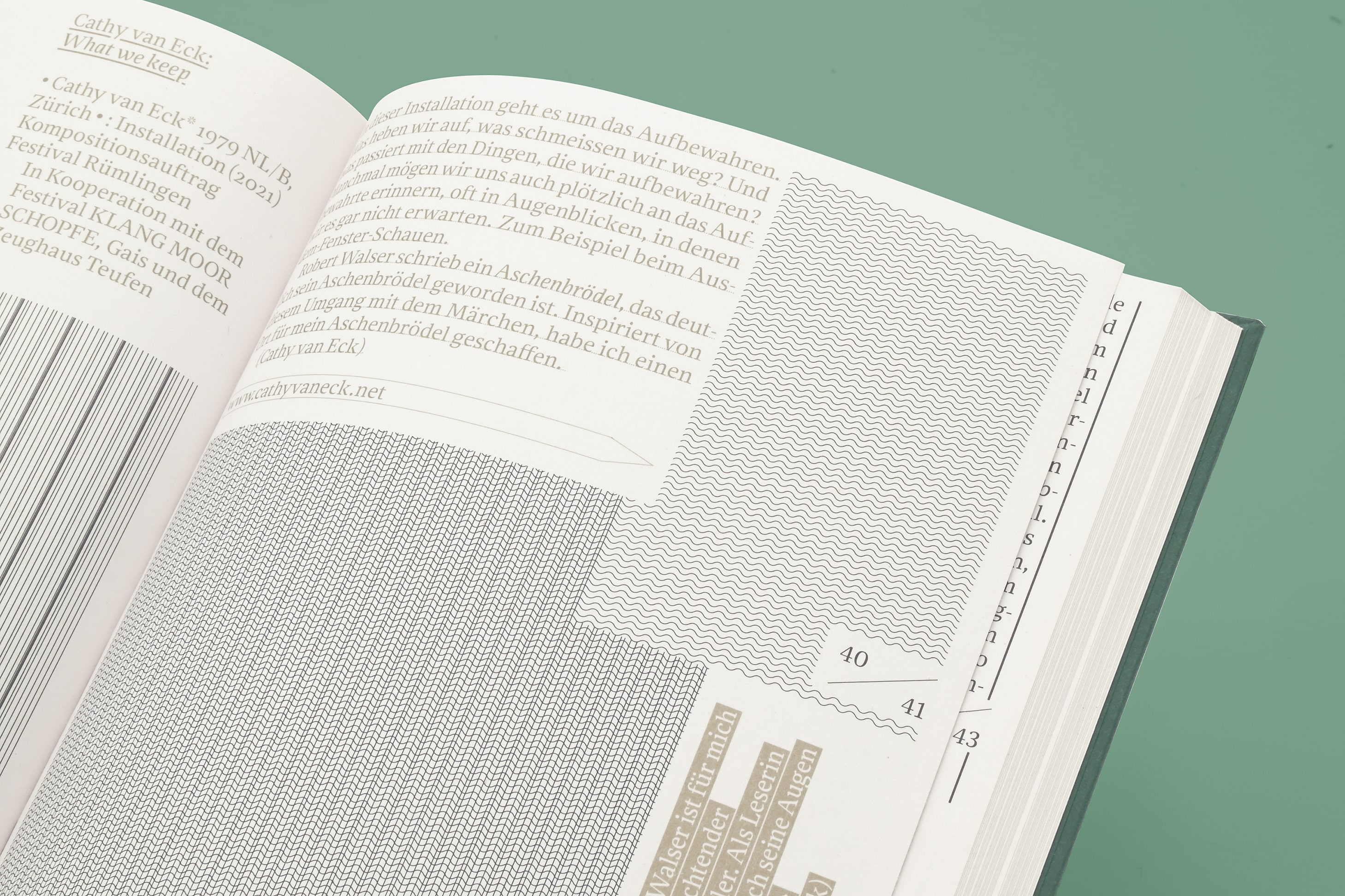 The focus of this year’s Festival Rümlingen was the Swiss author Robert Walser, who wrote pages and pages of texts in a tiny, almost illegible script. At first glance, the sheets look as if they consist only of grids and areas. In the design of the book, Neeser & Müller aimed to reproduce a similar aesthetic by incorporating grid elements and using a special layout. The book is set in Rekja designed by Anton Studer. The title is rendered in caps from several weights of Britannic.