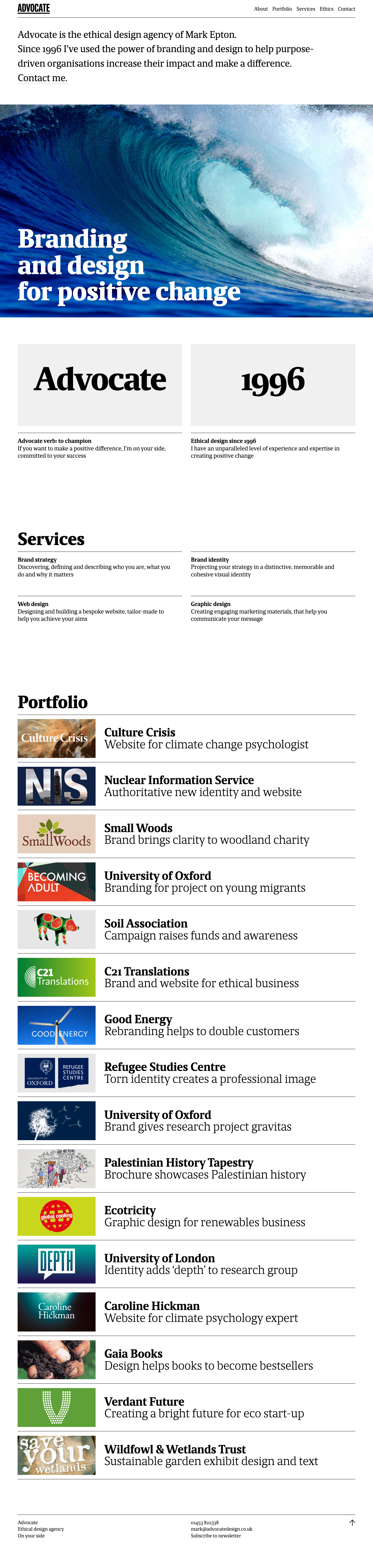 Advocate design agency Contributed by Mark Epton on Oct 16th, 2021. Artwork published in 2021. License: All Rights Reserved. For the rebranding of my Advocate design agency, I chose to use Maga by DSType. I was looking for a 'sturdy’, modern serif, with old style figures, that comes with a heavy weight – and Maga fits the bill. License: All Rights Reserved. Typefaces More about MagaGet MagaMore about AcuminGet Acumin Formats Web (5659) Branding/Identity (8511) Topics Services (1563) Graphic Design (3024) Designers/Agencies Mark Epton (1) Advocate design agency (1) Tagged withportfolios (777)websites (3599)self promotion (328)reversed type on an image (1234)waves (58) Artwork location United Kingdom (3311) Gloucestershire (4) Post a comment Name Email – will not be published Website Your response Submit Comment More Acumin in use Super Mario Bros. Plumbing advertising campaign2023PowsterContributed by Antonia Taylor Michela Tartaglia websitec. 2023Marco Goran RomanoValentina CasaliGianluca RinaldiContributed by Marianna Rossi New York on ICE website2018Alex TatusianContributed by Peiran Tan Staff Pick Sponsor More in Graphic Design Razorfish identity and websitec. 2020RazorfishContributed by Stephen Coles Spring Projects identity and posters2010Six CreativeAndreas NeophytouContributed by Stephen Coles Baker websitec. 2015BakerContributed by Webtype Novo Typo Color Book by Mark van Wageningen2017Novo TypoMark van WageningenContributed by Mark van Wageningen More in Web Jeugdtandzorg Utrecht identity and communication2020MattmoContributed by Jitka Schneider Boutique portfolio website2021BoutiqueContributed by Emtype Foundry Bob Industriesc. 2023Village GreenContributed by newglyph Taylor Franklinc. 2017Taylor FranklinContributed by 205TF Staff Pick More Fonts In Use Cultura em Expansão2016Atelier d’alvesContributed by Joana Correia Staff Pick Konfrontace exhibition poster and catalogc. 2010Jan HavelBelavenir Design StudioContributed by Stephen Coles Staff Pick Mein Honig honey farm website2013Thomas LichtblauContributed by Indra Kupferschmid Staff Pick Andreas Dorau – Ich bin der eine von uns beiden album art2005Christian KüpkerUwe KrejciContributed by Florian Hardwig Staff Pick