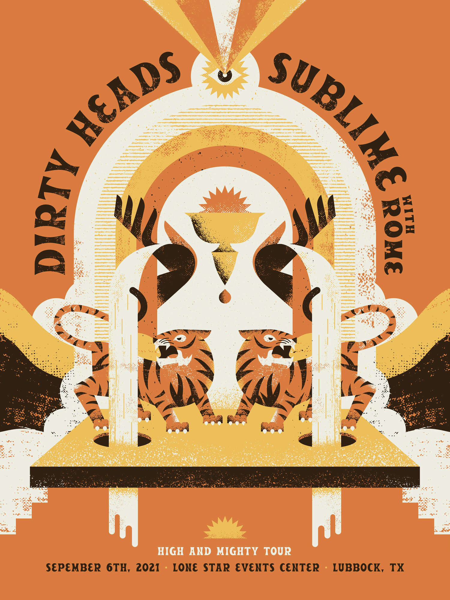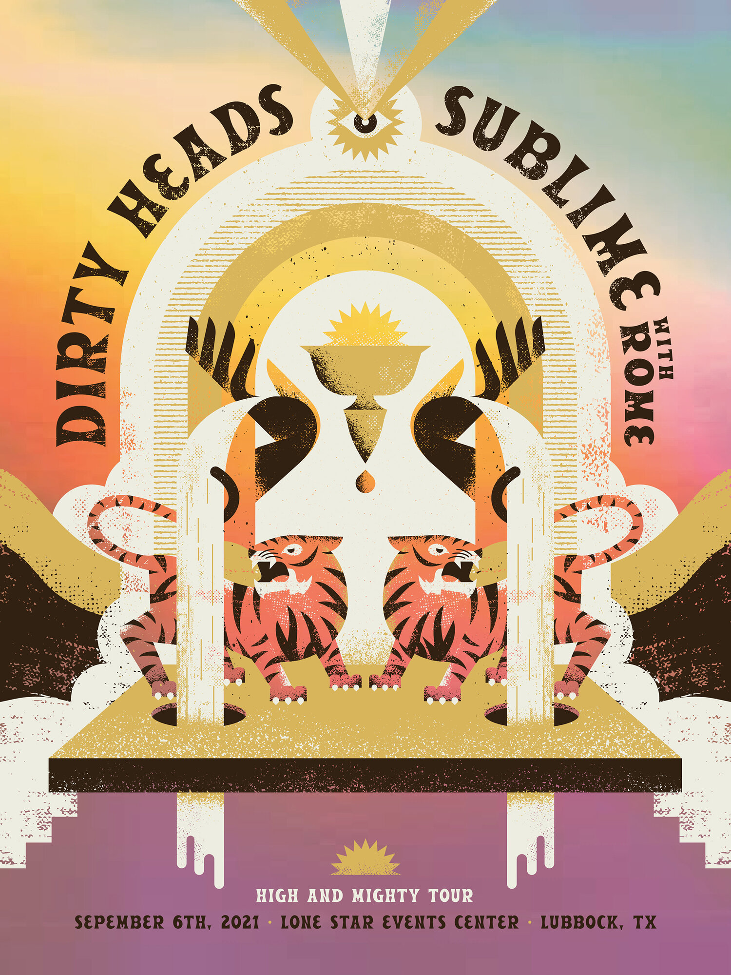 Poster design by Charlie Wagers for the Dirty Heads and Sublime’s co-headlining concert in Lubbock, Texas. Charlie is a designer, screenprinter, and co-owner of Synthesis, a botanical shop in Pittsburgh, Pennsylvania. The posters were printed by Crosshair in Chicago on French Paper Co’s Orange Fizz paper. A limited number of special holographic foil variants were also made. This poster is typeset in Beale by Hoodzpah.